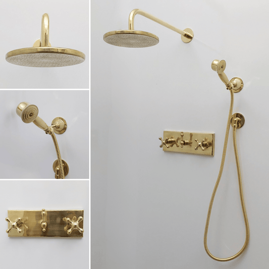 Unlacquered Brass Shower System with Adjustable Round Rain Shower Head, Central Brass Plaque and Cross Handles - Ref: SSPH-AUBCVendor:AtlastyRegular price $465.00 USDRegular priceUnit price per$549.00 USDSale price $465.00 USDSale