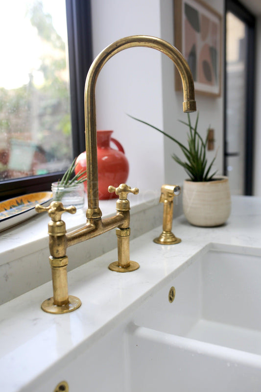 Unlacquered Brass Bridge Kitchen Faucet with Sprayer, Cold Water Tap, and Cross Handles - Ref: APC-99