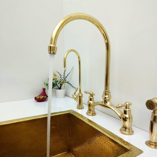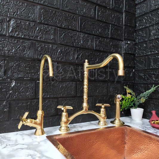 Unlacquered Brass Bridge Faucet with Sprayer and Cold Water Faucet, Brass Kitchen Faucet With Cross Handles - Ref: BF2LCB001-PK