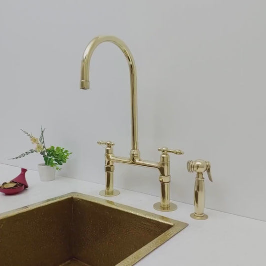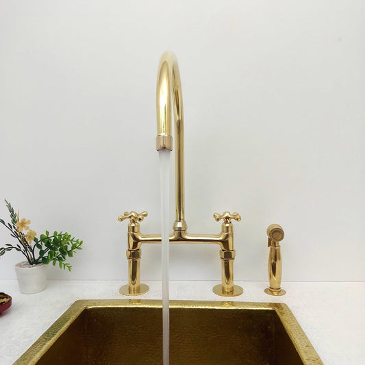 Unlacquered Brass Bridge Kitchen Faucet with Sprayer, and Cross Handles - Ref: APC-86Vendor:AtlastyRegular price From $499.95 USDRegular priceUnit price per-
