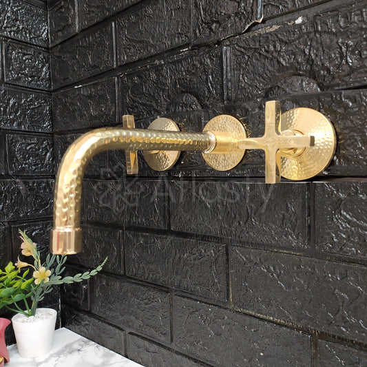 Unlacquered Brass Hammered Wall Mounted Bathroom Faucet - Vessel Sink Faucet with Cross or Lever Handles