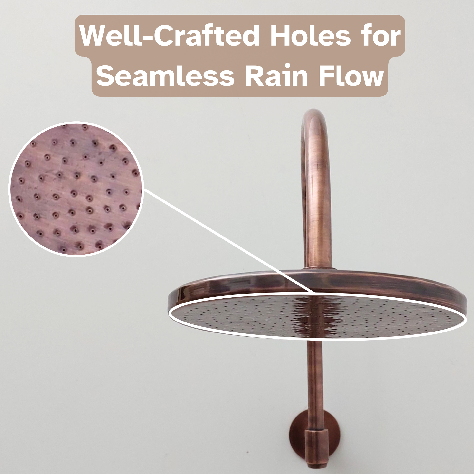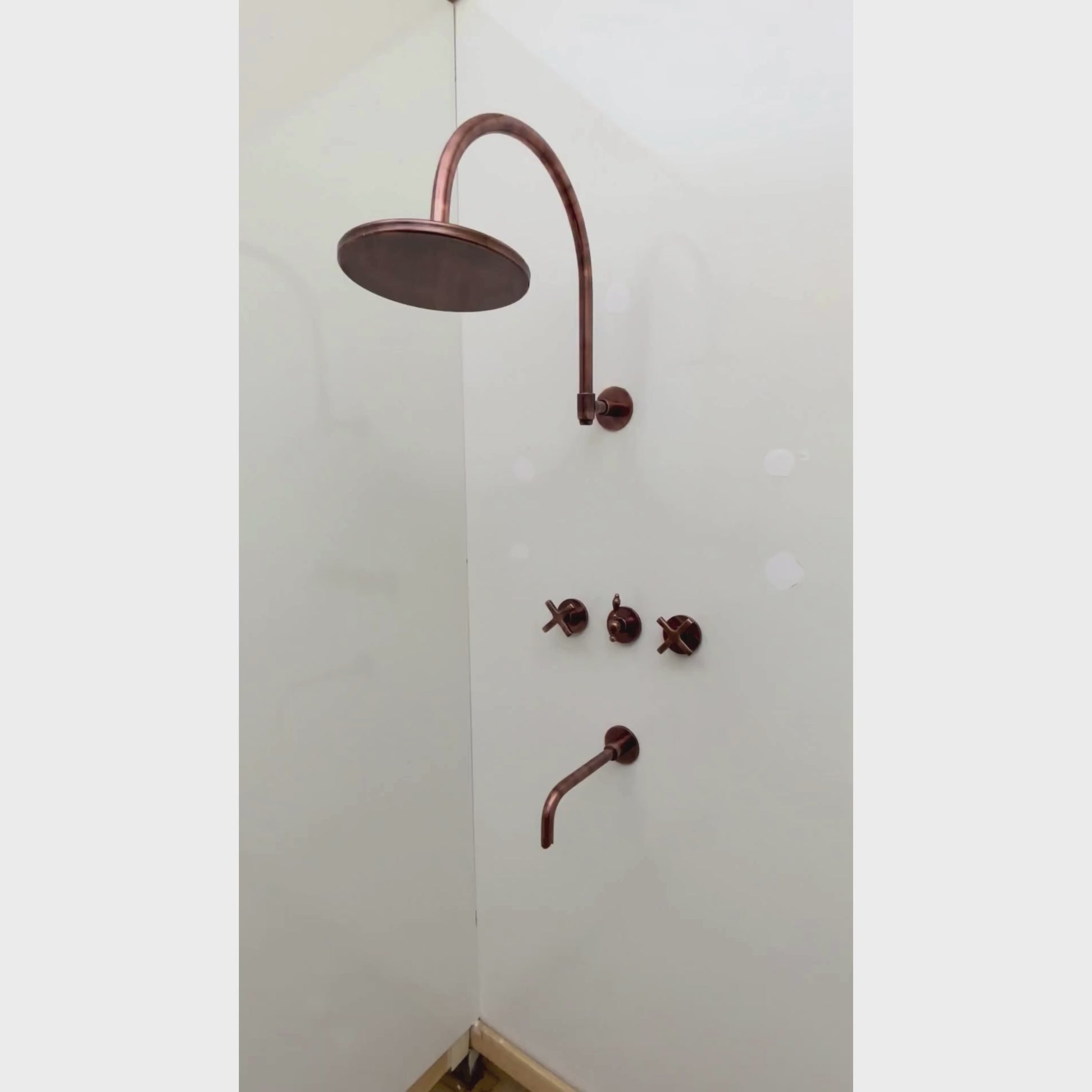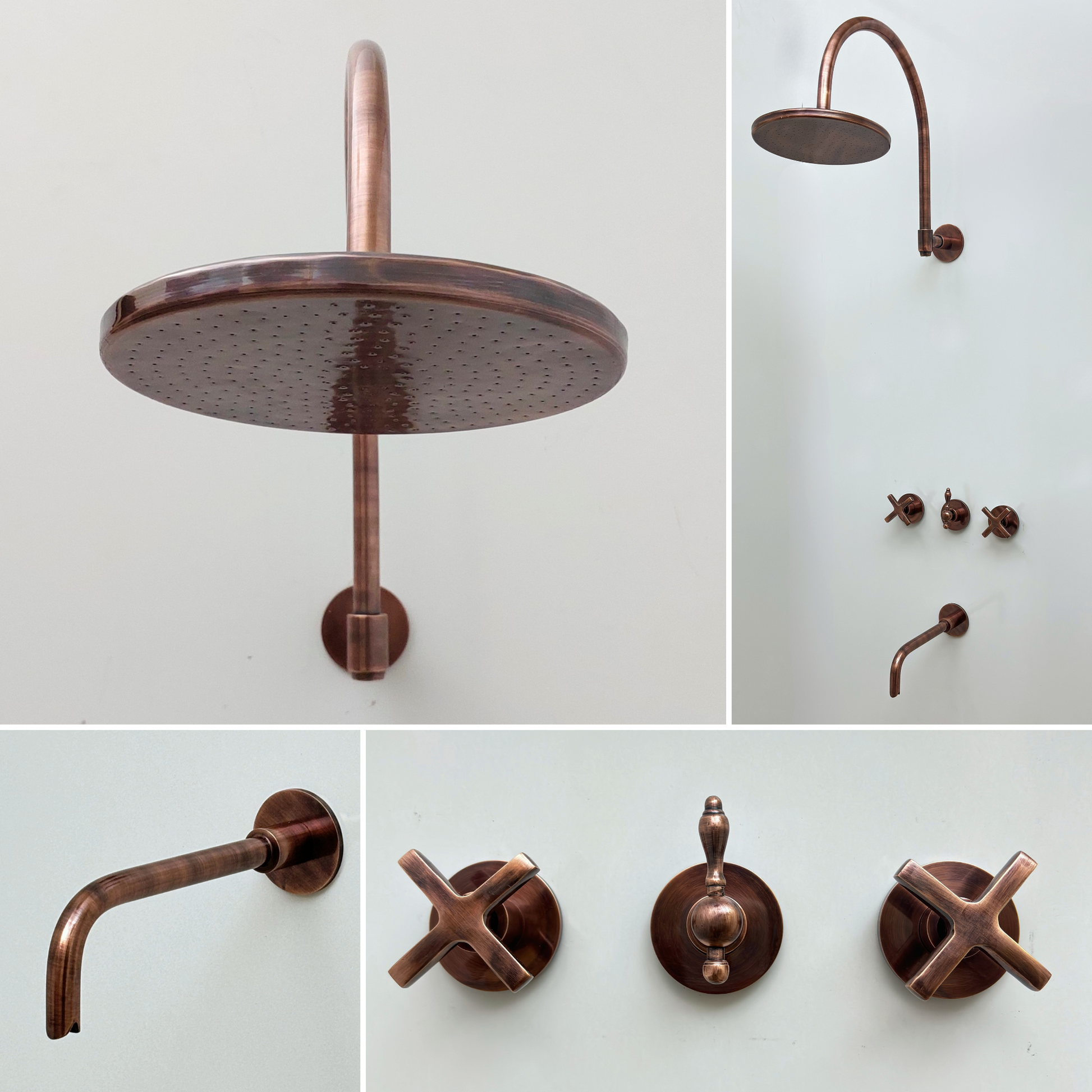 Transform your bathroom with this stunning Antique Copper Finish Shower System, a perfect blend of classic design and modern functionality. Crafted from solid brass, this shower system is built to last while offering timeless elegance. The round rain shower head with an arcuate arm ensures a soothing and luxurious shower experience, mimicking the feeling of gentle rainfall. The integrated tub filler adds convenience for filling your bathtub quickly, while the cross handles provide precise and effortless control over water flow and temperature.