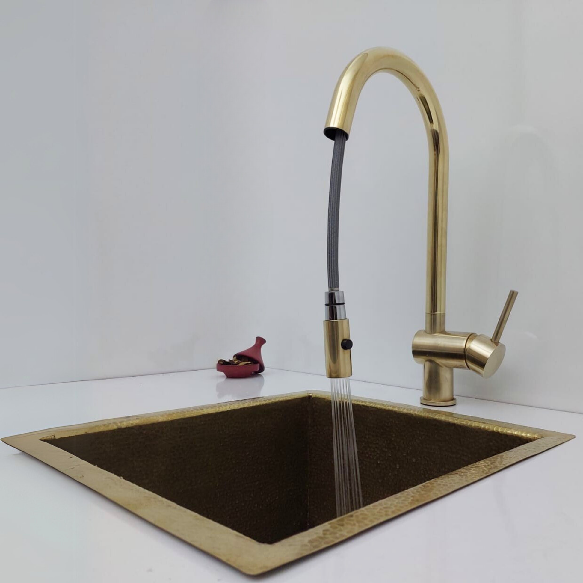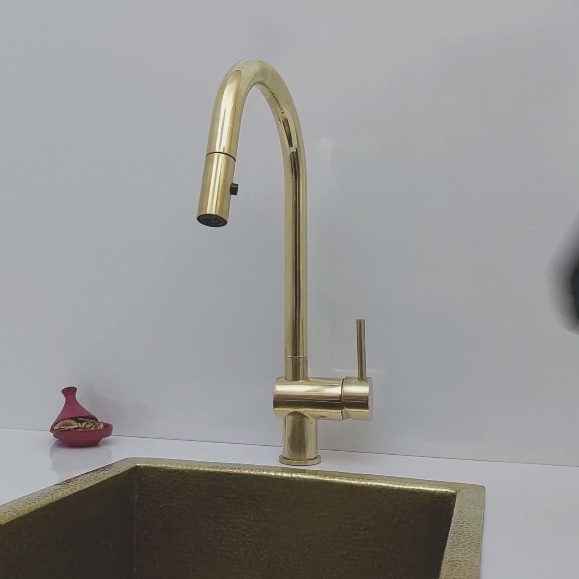 Elevate your kitchen with this Unlacquered Brass Mixer Kitchen Faucet, crafted from solid brass with an unlacquered finish that develops a rich patina over time. This faucet features two modes, a steady stream mode for daily use and a powerful sprayer mode for efficient rinsing, easily switched with the side black button. The pull-down sprayer hose extends your reach, making it convenient to fill pots and clean hard-to-reach areas, while retracting smoothly when not in use. The single mixer lever allows for seamless control of water temperature and flow, blending timeless style with modern functionality for your kitchen.