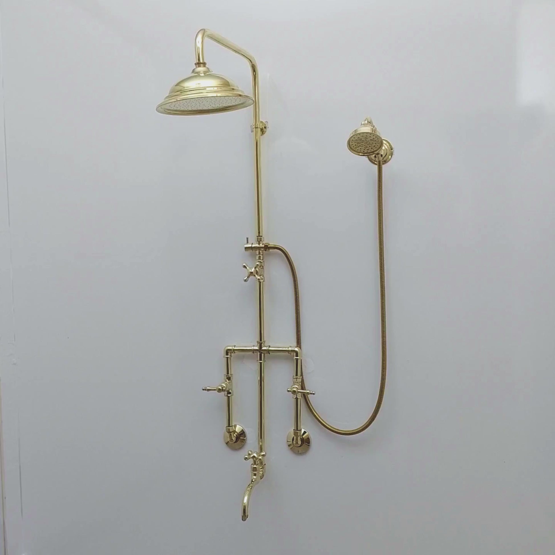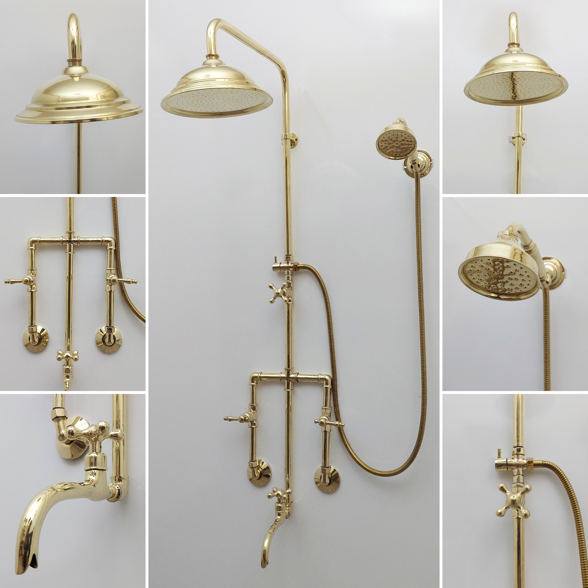 Bring elegance and timeless style to your bathroom with this Unlacquered Brass Shower System. Featuring a sleek Round Rain Shower Head for a luxurious rain-like experience, a convenient Tub Filler for versatile use, and classic Lever Handles for easy water control, this system also includes a Water Flow Diverter Handle. When closed, the diverter directs the water flow exclusively to the tub filler. When open, it allows water to reach the upper part of the system for the Shower Head and the Handheld Shower Head, offering complete versatility. The Handheld Shower Head also features a water control shut-off valve for precise usage. Crafted from premium brass with an unlacquered finish, this shower system develops a natural patina over time, enhancing its vintage appeal and timeless charm.