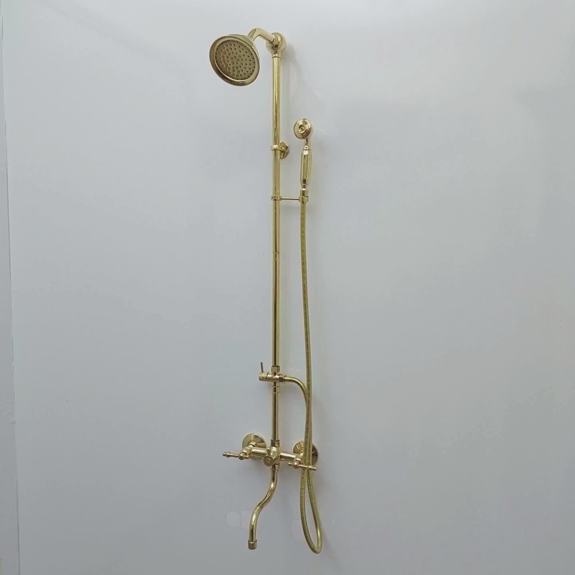 Bring elegance and timeless style to your bathroom with this Unlacquered Brass Shower System. Featuring a sleek Round Shower Head for a luxurious rain-like experience, a convenient Tub Filler for versatile use, classic Lever Handles for easy water control, a Handheld Shower Head with a water control shut-off valve, and a small Lever Handle Diverter to seamlessly switch water flow between the shower head and tub filler, this shower system is the perfect blend of functionality and sophistication. Crafted from premium brass with an unlacquered finish, this shower system develops a natural patina over time, enhancing its vintage appeal.