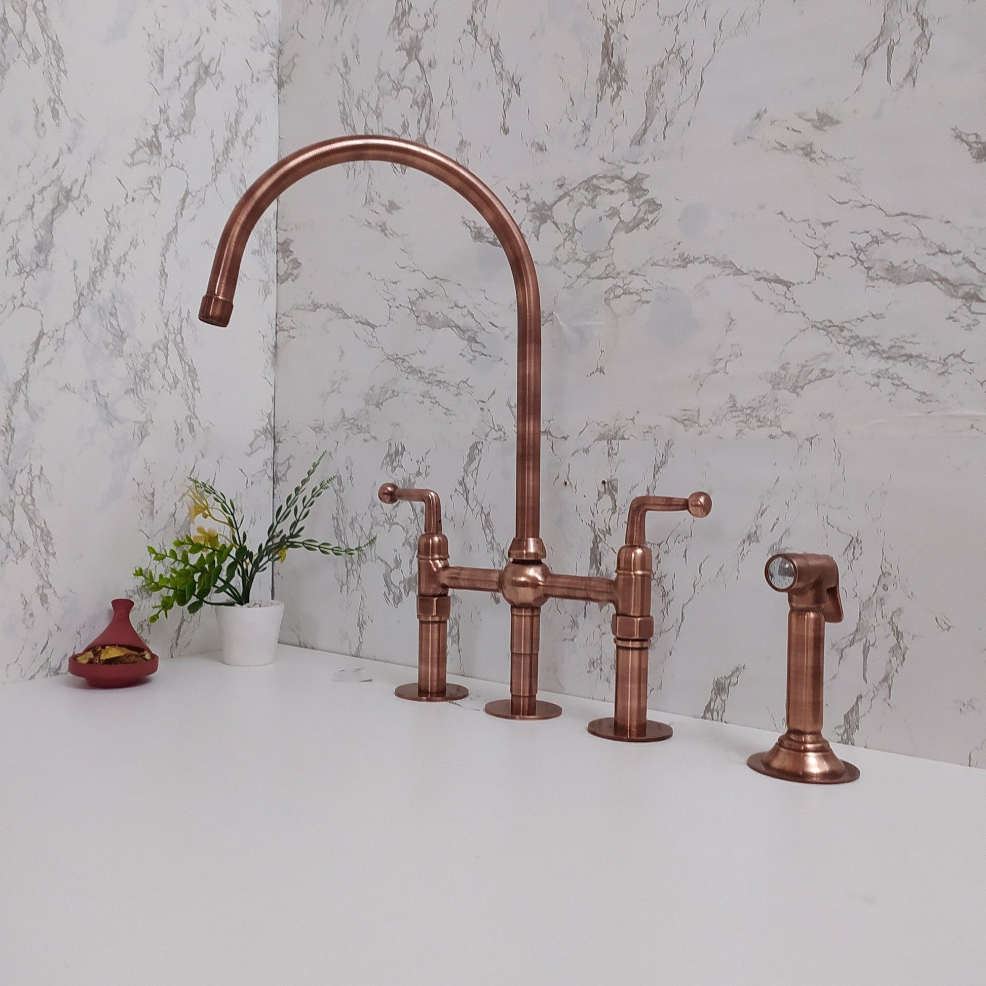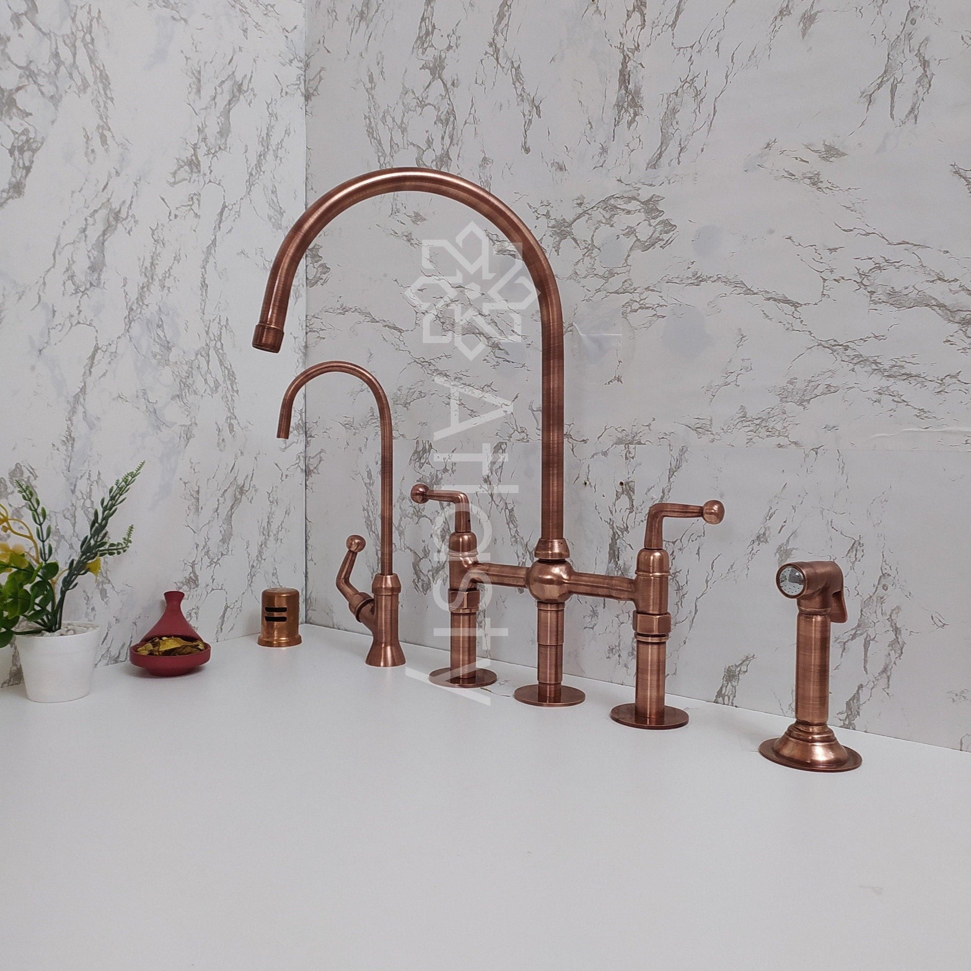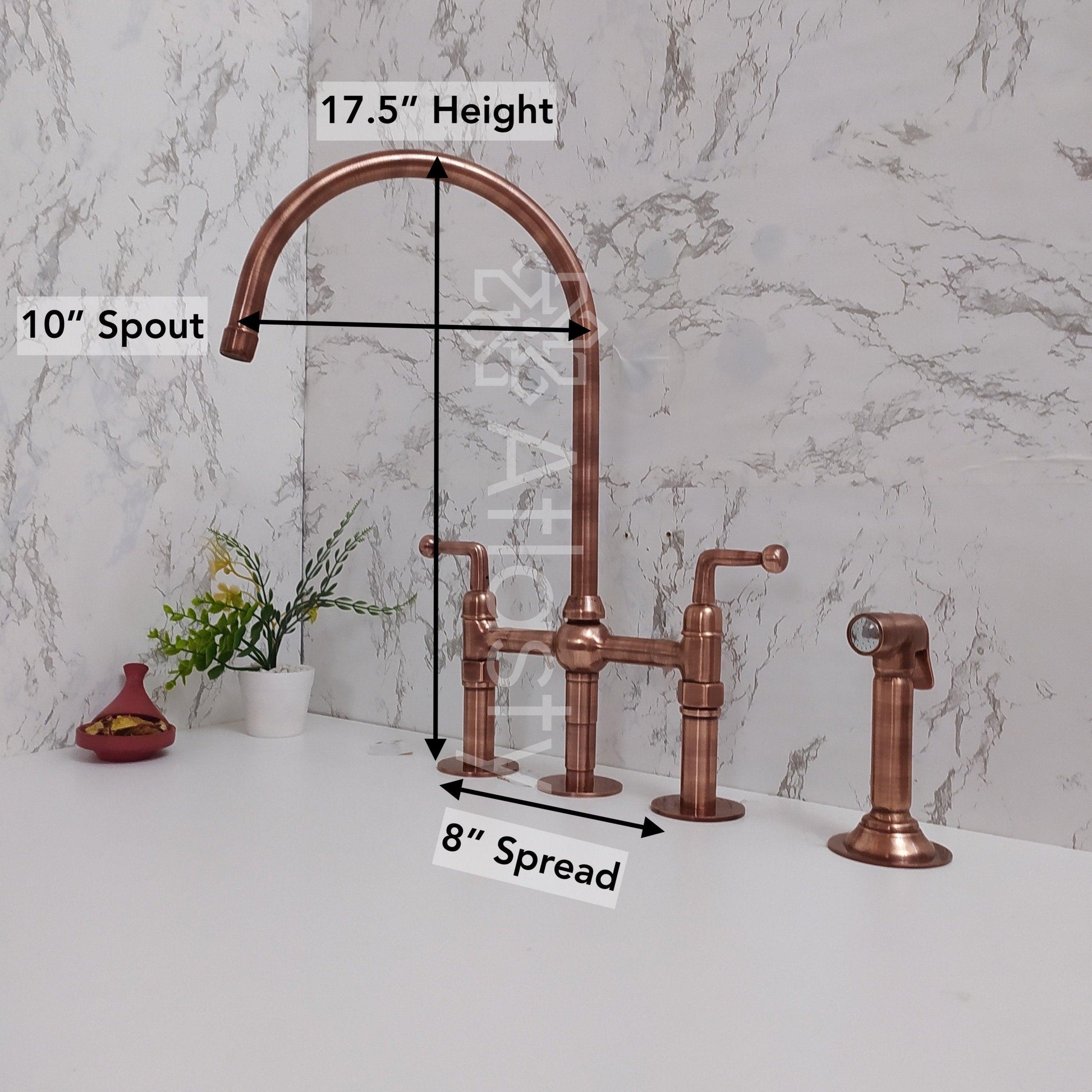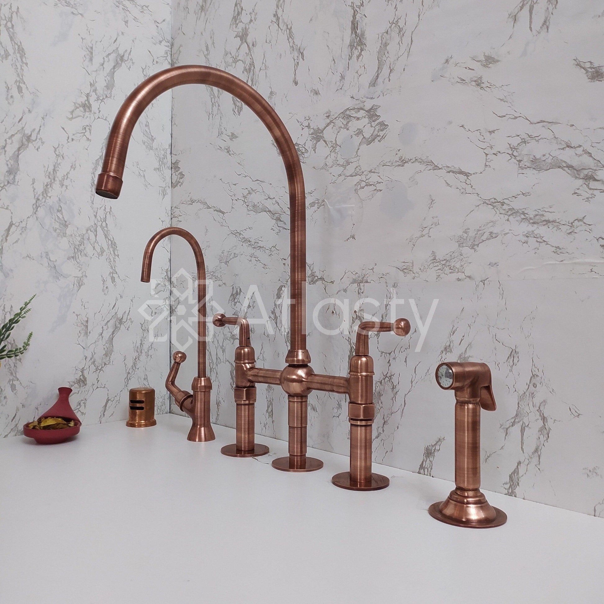 Antique Copper Kitchen Bridge Faucet with Sprayer and Cold Water Faucet - Unique and Functional Design for Traditional & Farmhouse Kitchens