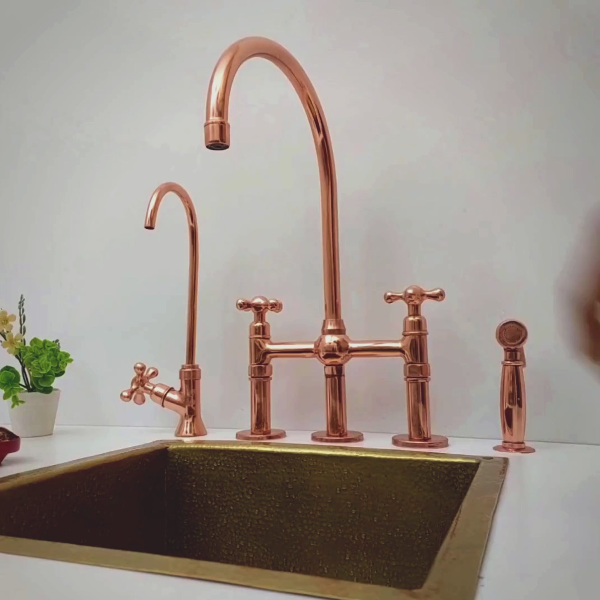 This antique-inspired kitchen centerpiece boasts the timeless elegance of a bridge-style faucet design in brass with a Polished Copper finish, accentuated by classic cross handles. A perfect fusion of vintage charm and modern convenience, it elevates any traditional or farmhouse-style kitchen with its distinctive allure. Equipped with a practical sprayer and a separate cold water faucet, it offers both functionality and style for effortless water control and enduring beauty.