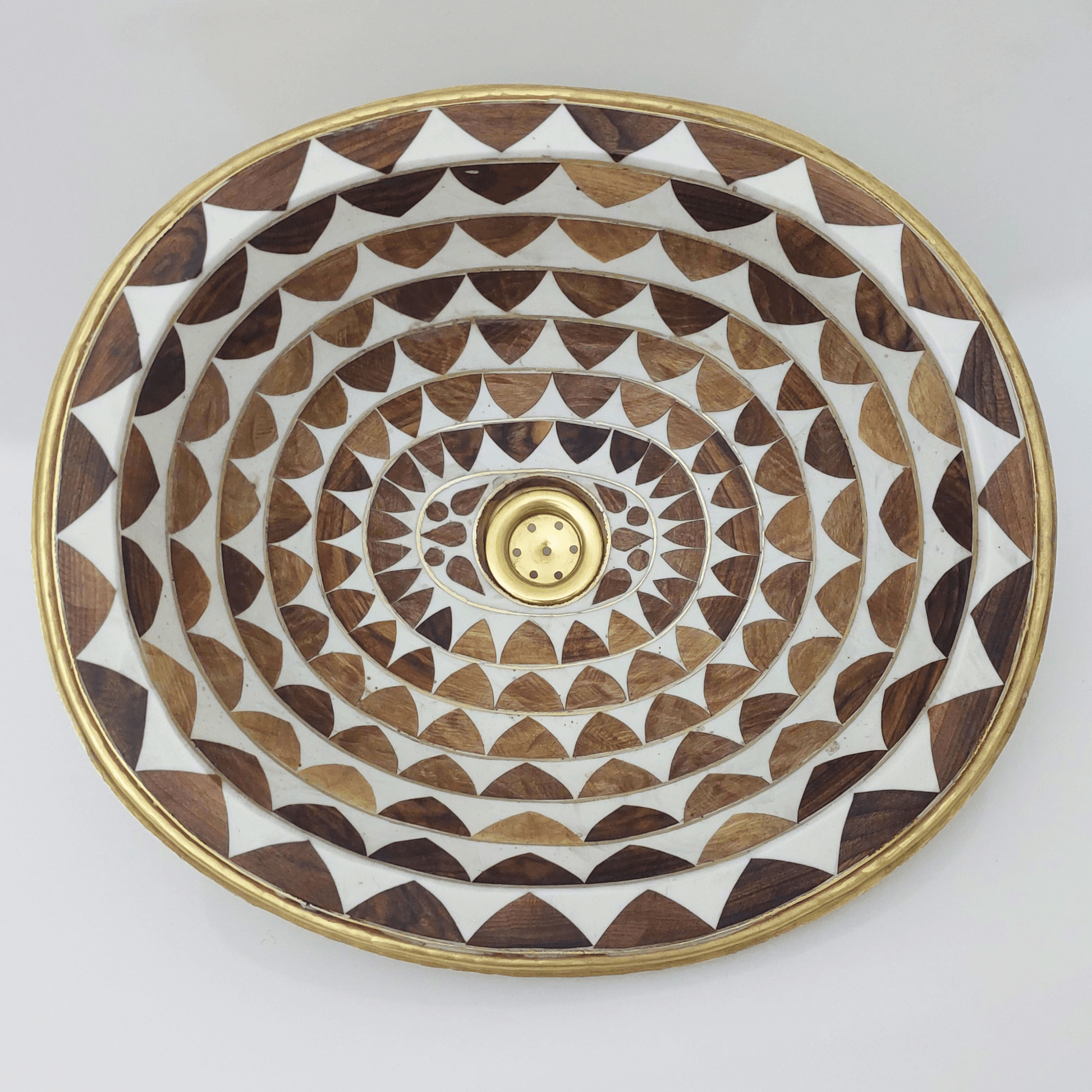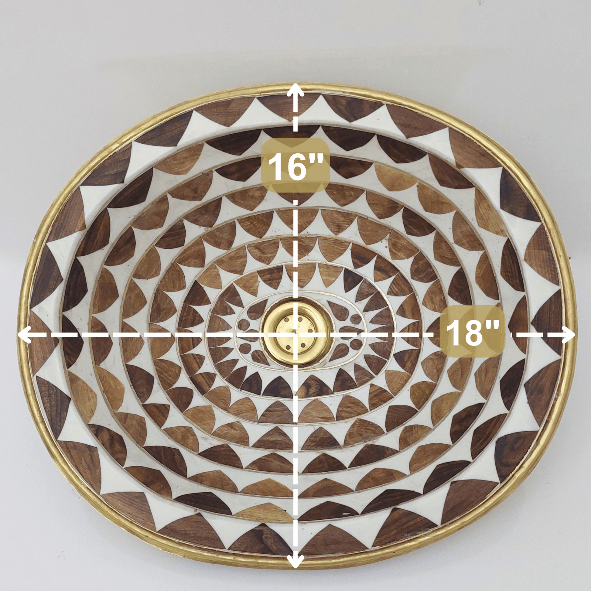 Brass Oval Bathroom Drop-in Sink, White and Brown Pattern Studded Solid Brass Sink With Wood And Resin - Ref: SWRWB001