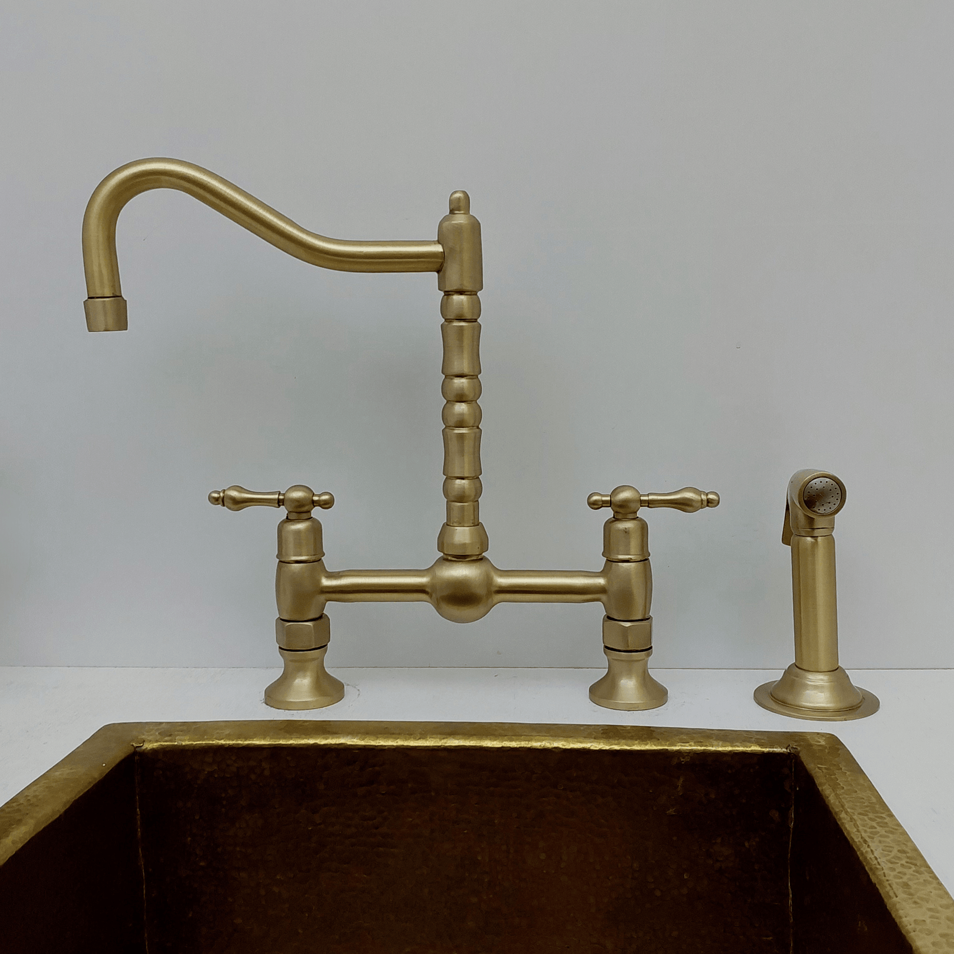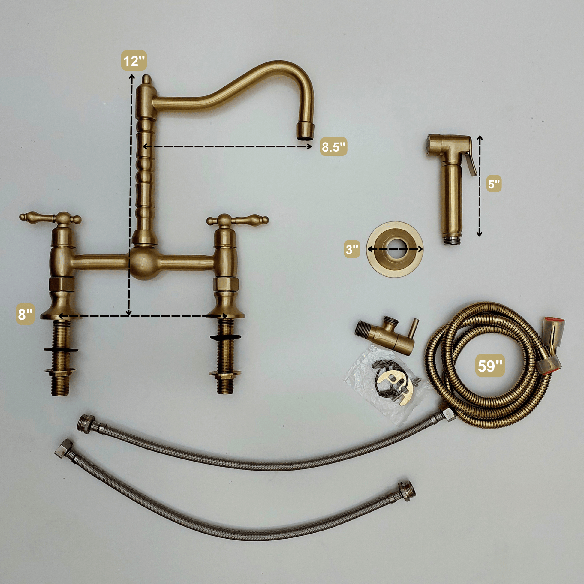 Elevate the elegance and functionality of your kitchen with our Brushed Brass Bridge Kitchen Faucet with Sprayer. This timeless piece combines classic design with modern utility, offering a perfect balance of form and function. Crafted from high-quality materials and finished in a luxurious brushed brass, this faucet adds a touch of sophistication to any kitchen decor.