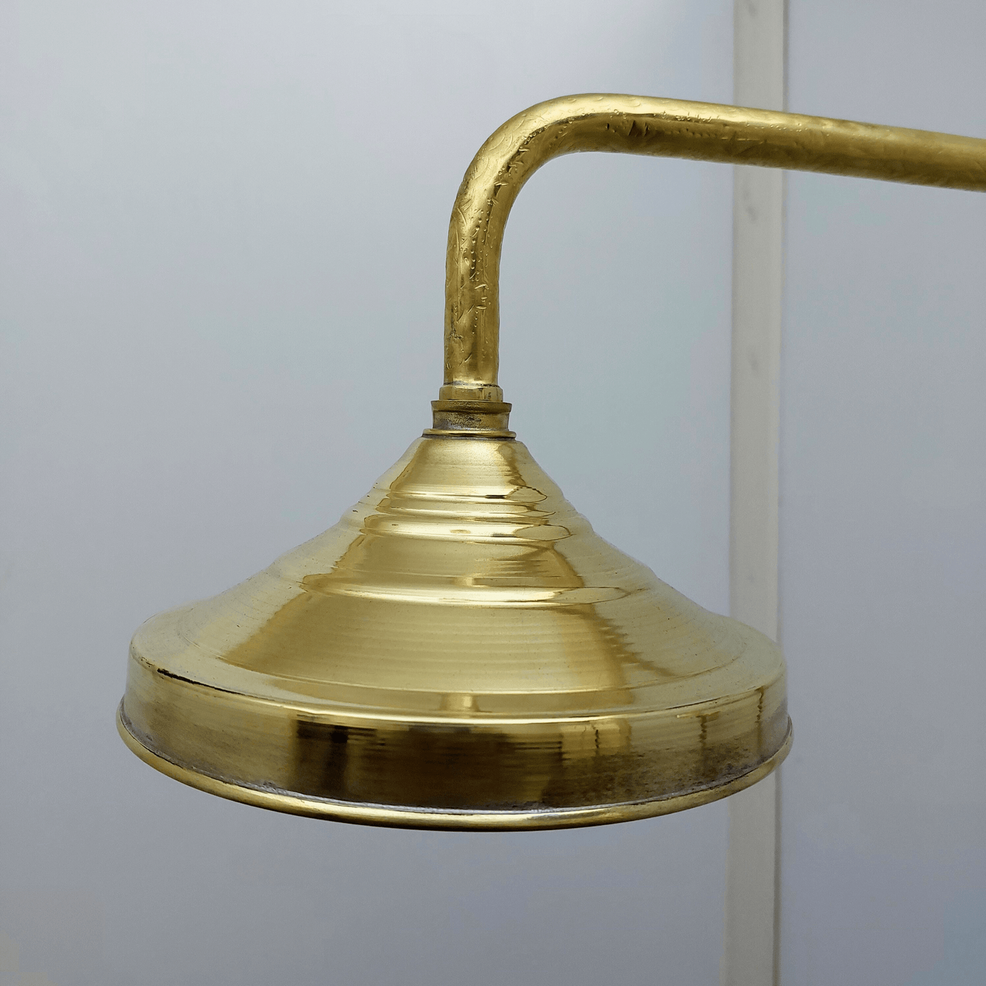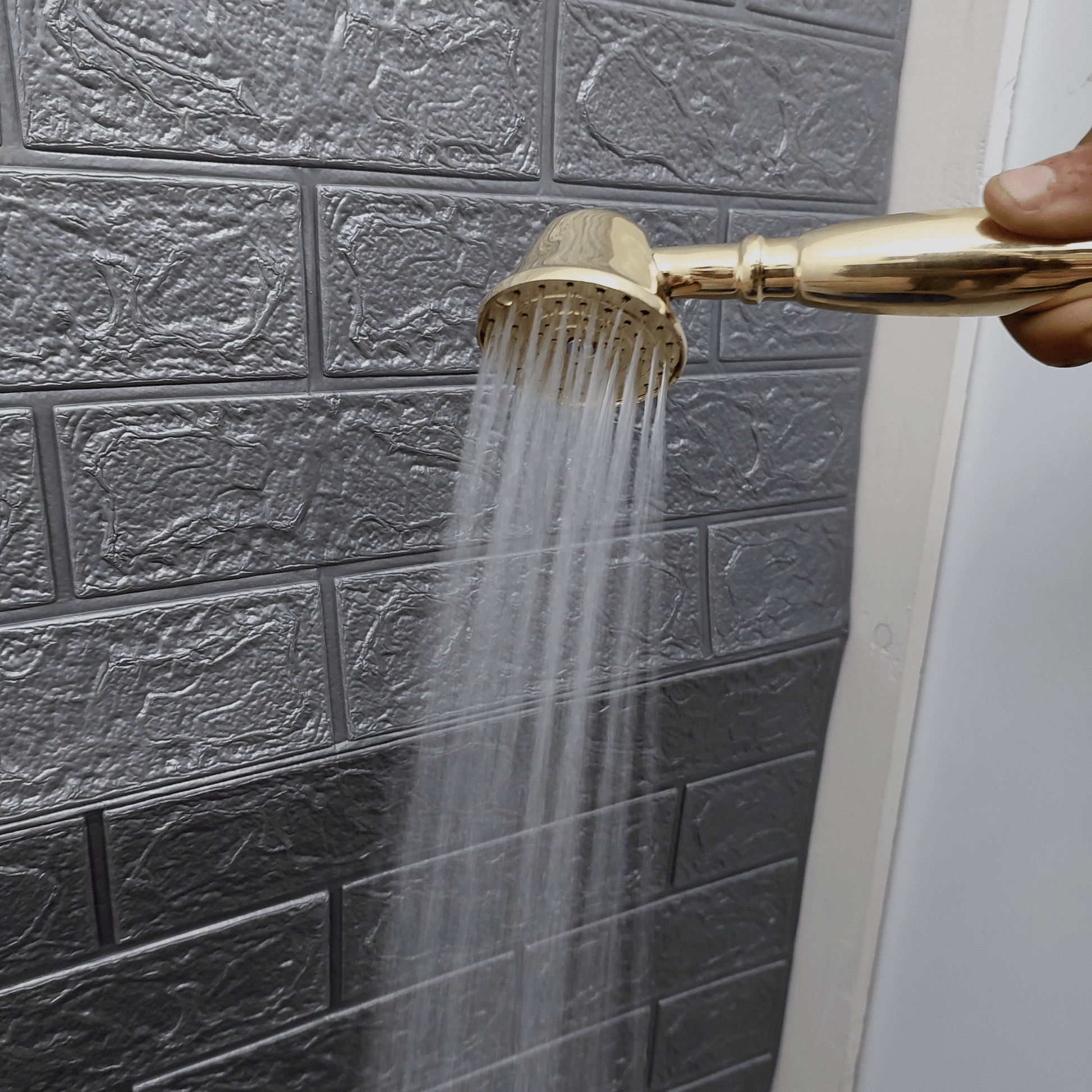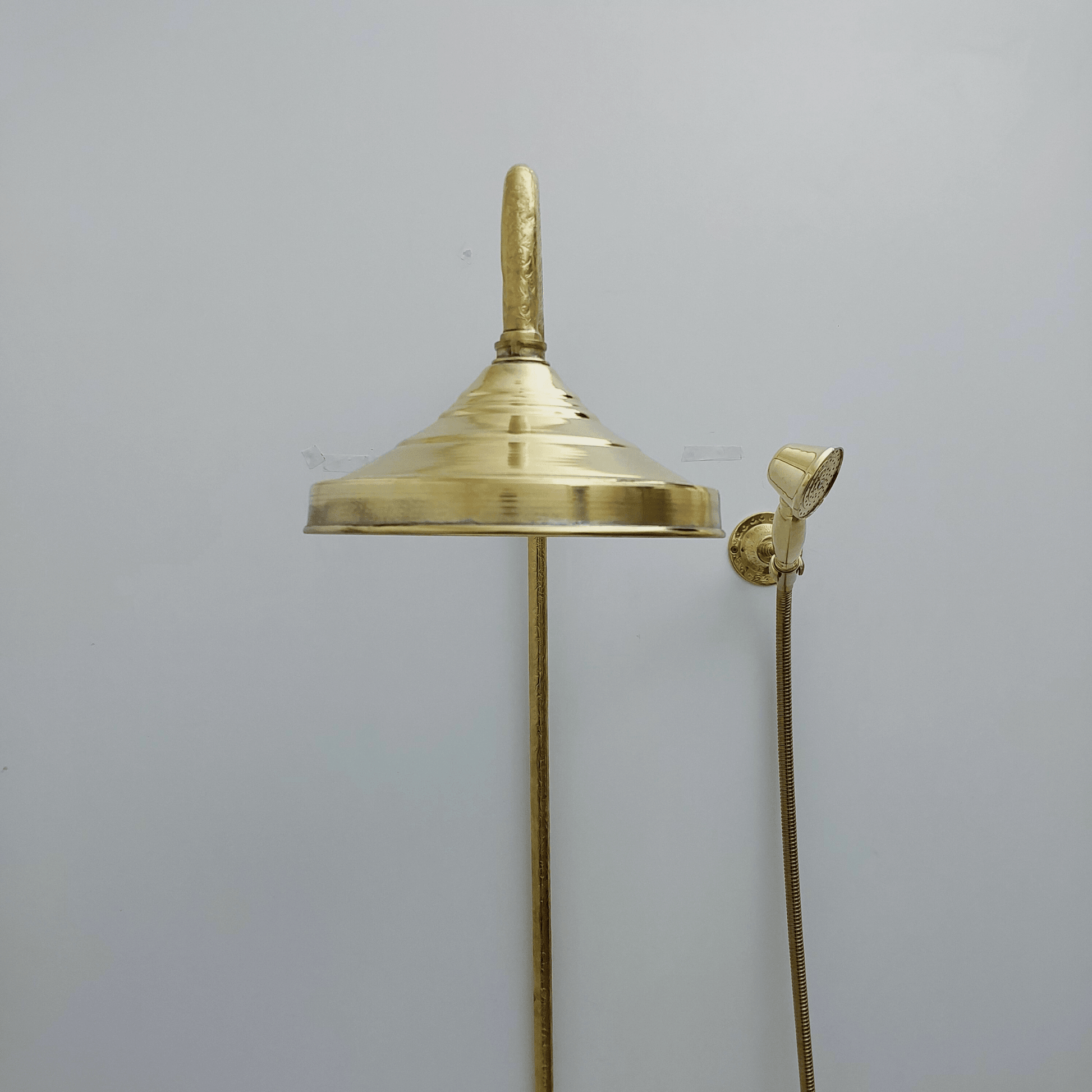 Elevate your bathroom with our Engraved Unlacquered Brass Shower System. Featuring both a handheld and a round rain shower head, this sophisticated system is crafted from high-quality brass for a timeless, elegant addition to any décor. The unlacquered finish develops a natural patina over time, while intricate engravings enhance its luxurious appeal. Two cross handles offer precise control of water temperature and flow, and a convenient middle lever pivots water between the shower heads.