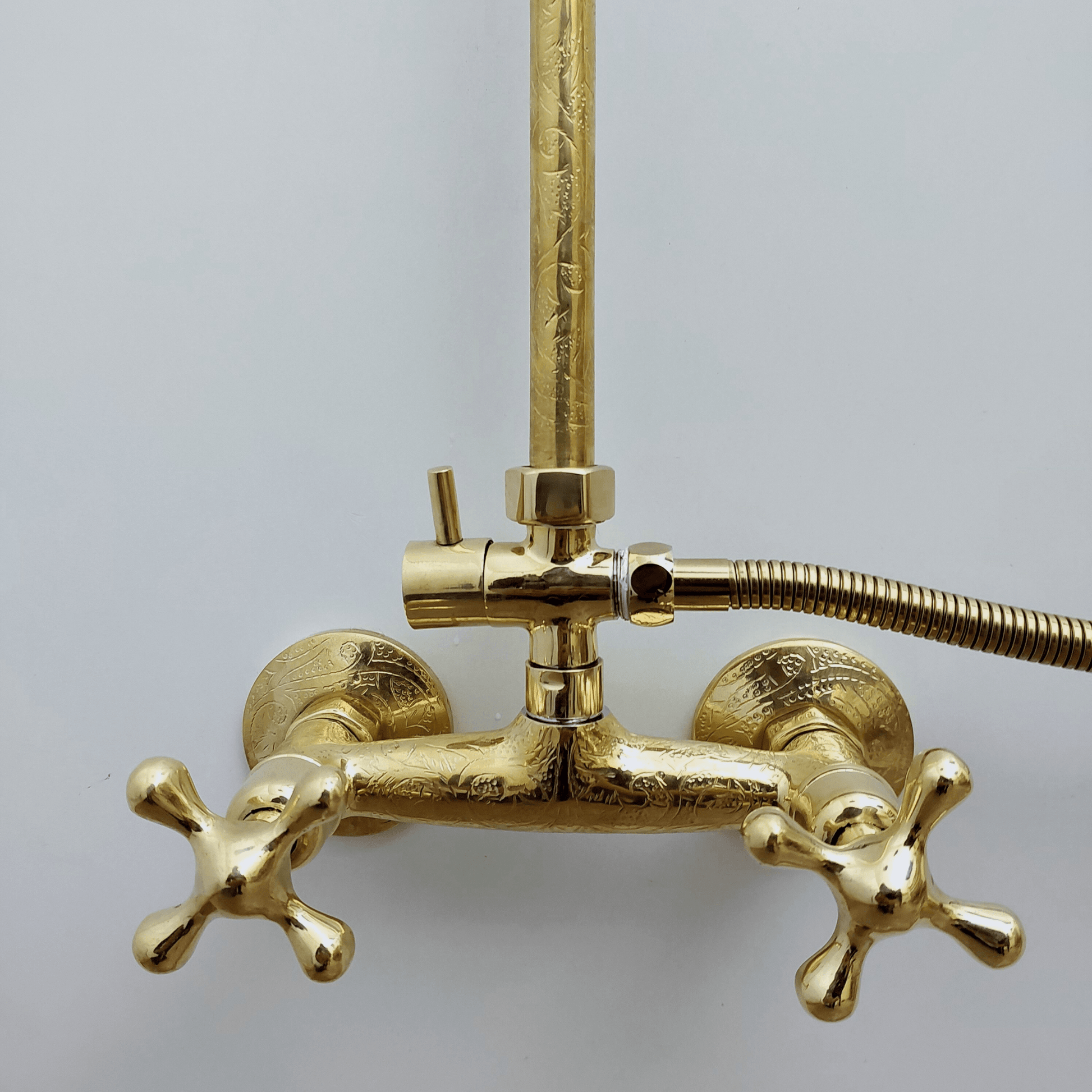 Engraved Unlacquered Brass Shower System with Handheld Shower Head, Round Rain Shower Head and Cross Handles - Ref: ATLASS46