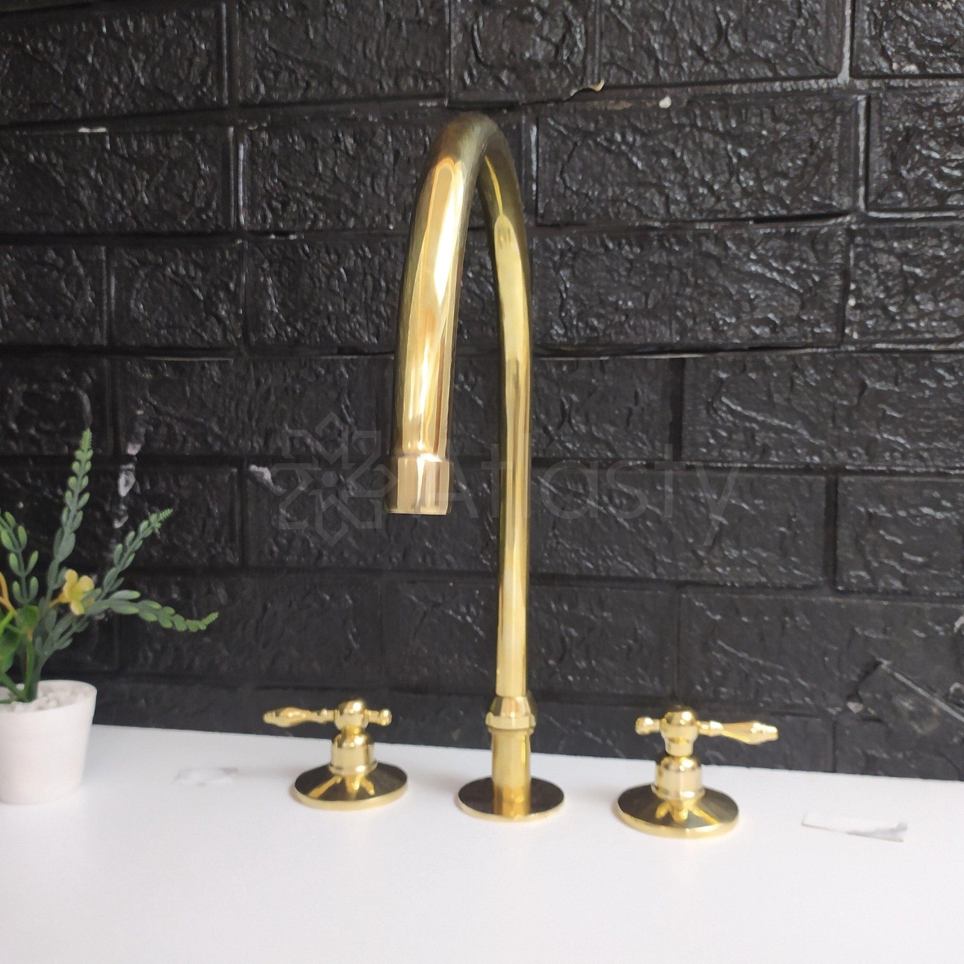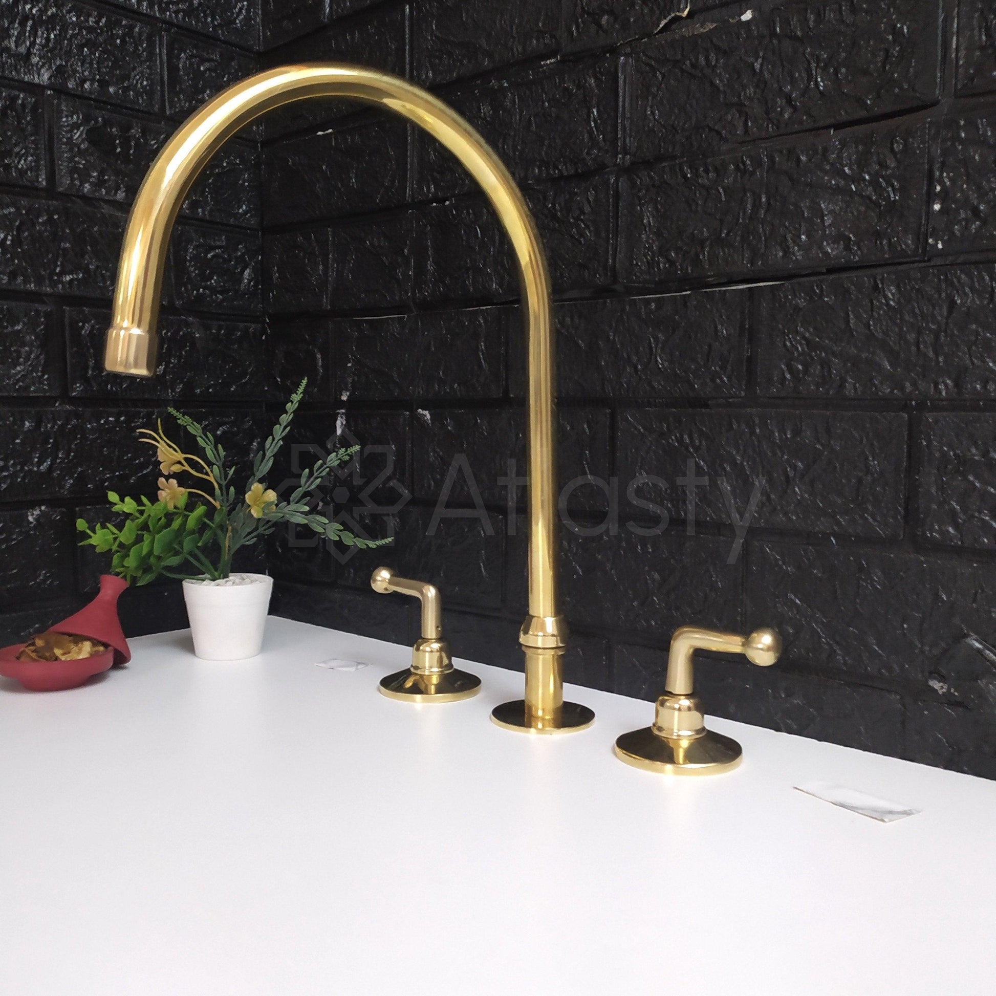 Unlacquered Brass 3 Holes Faucet | Deck Mounted Faucet | Lever Handles | Swivel Spout | Gold Antique Faucet