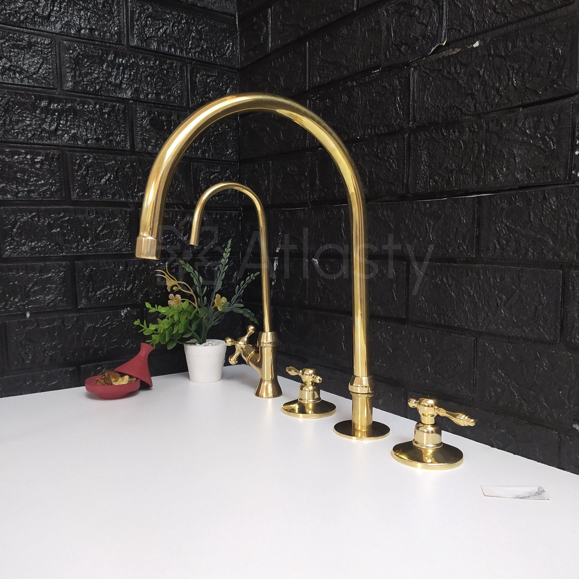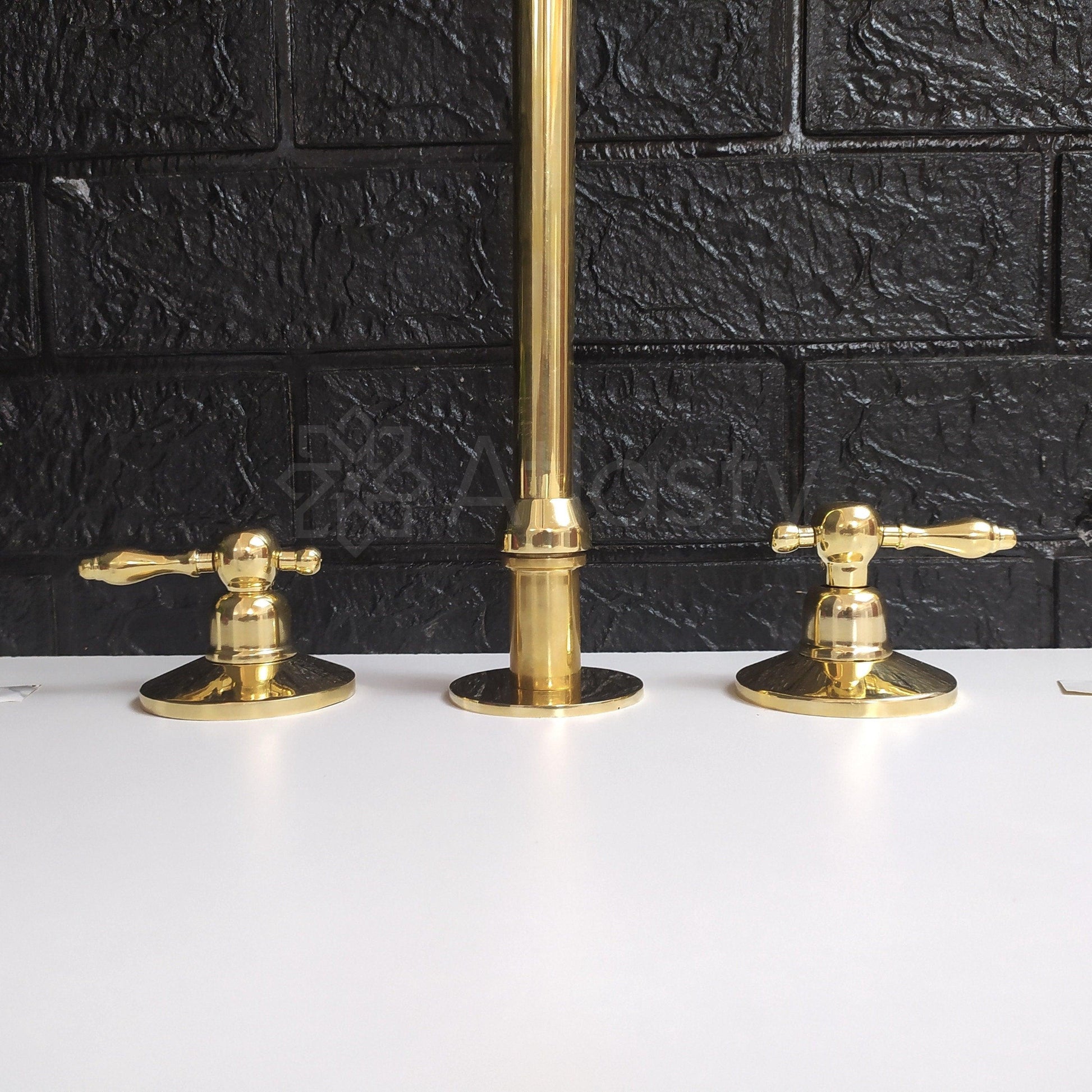 Unlacquered Brass 3 Holes Faucet | Deck Mounted Faucet | Lever Handles | Swivel Spout | Sprayer & Filtered Water Tap | Gold Antique Faucet