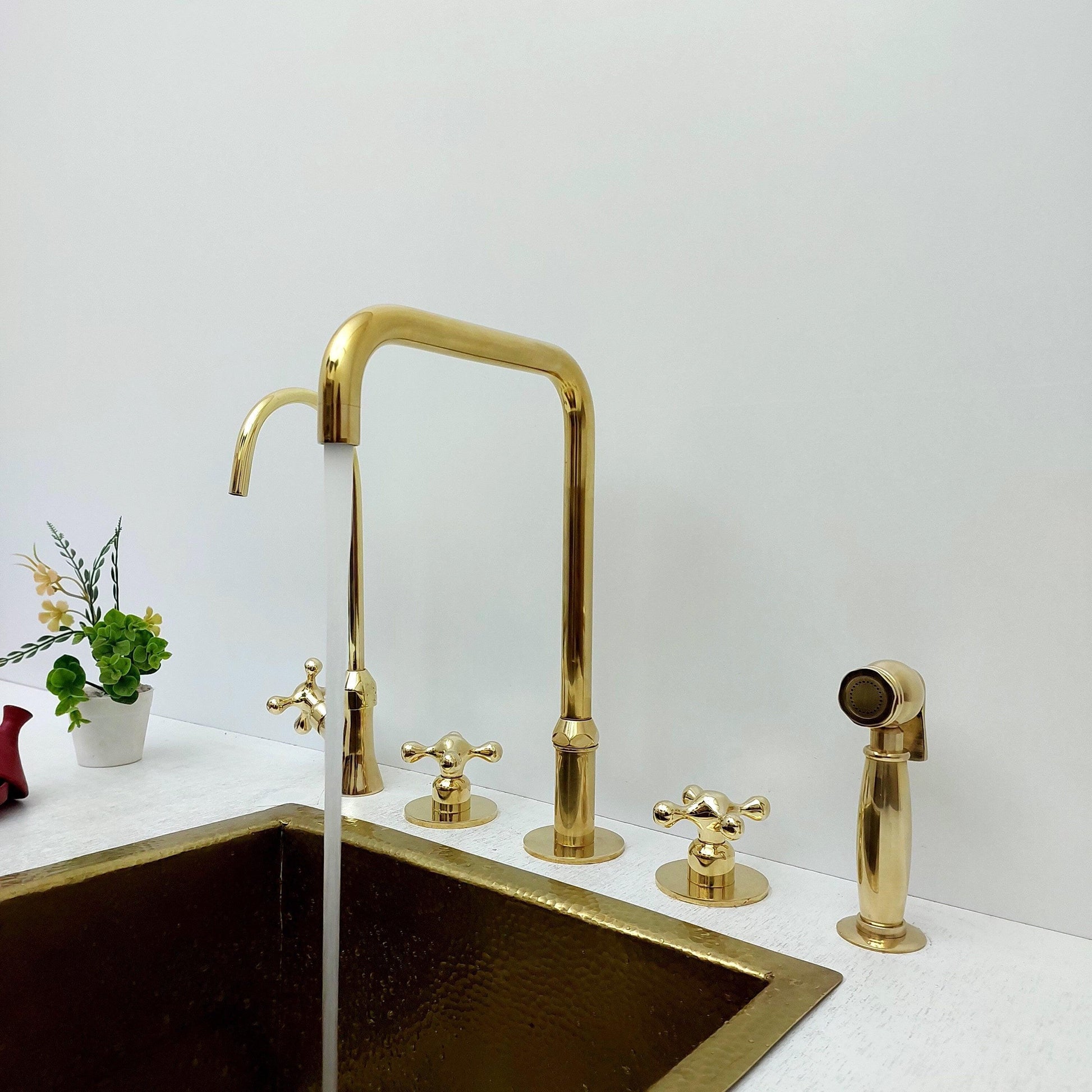 Unlacquered Brass 3 Holes Faucet, Vintage Deck Mounted Faucet with Sprayer & Cold Water Tap - Ref: THF01