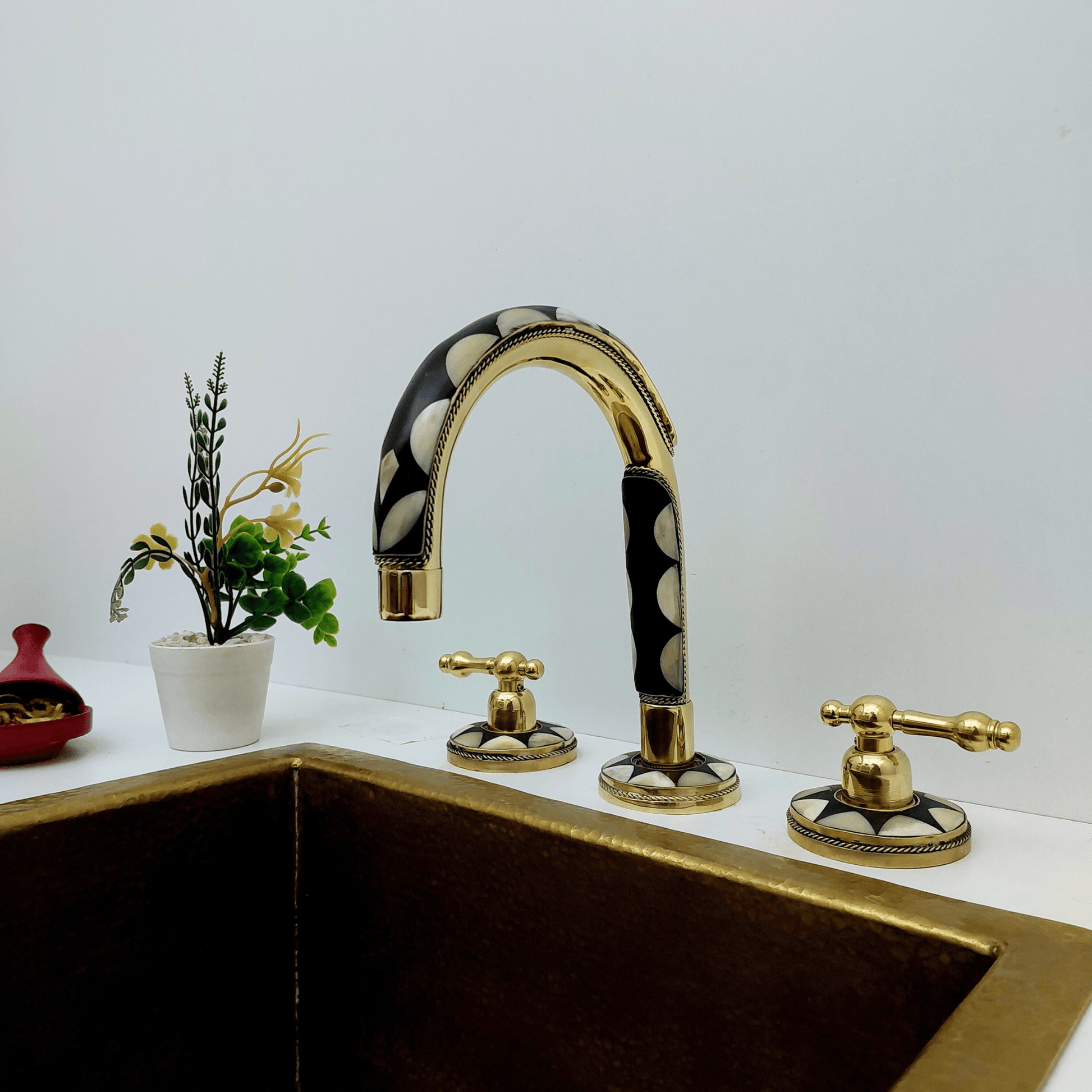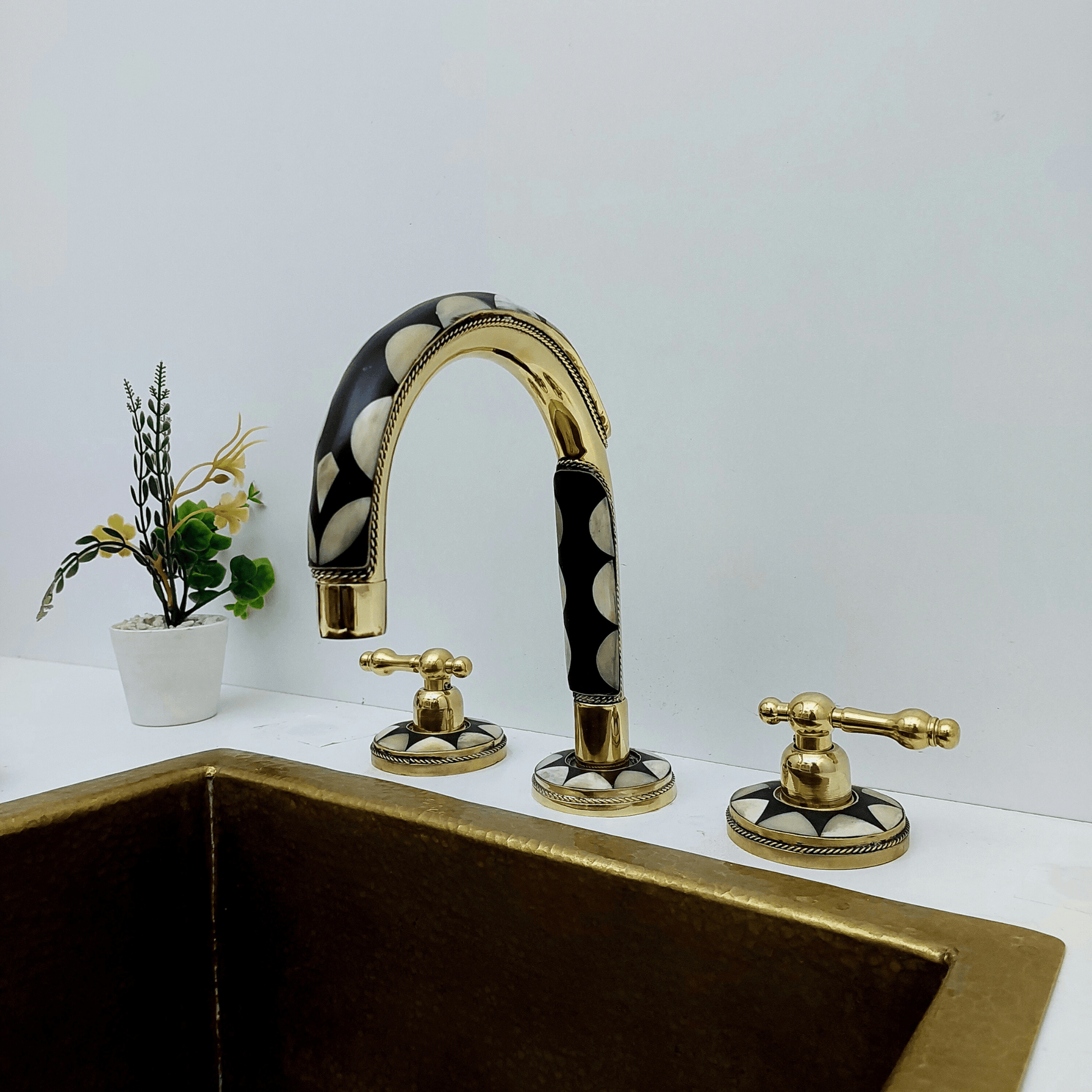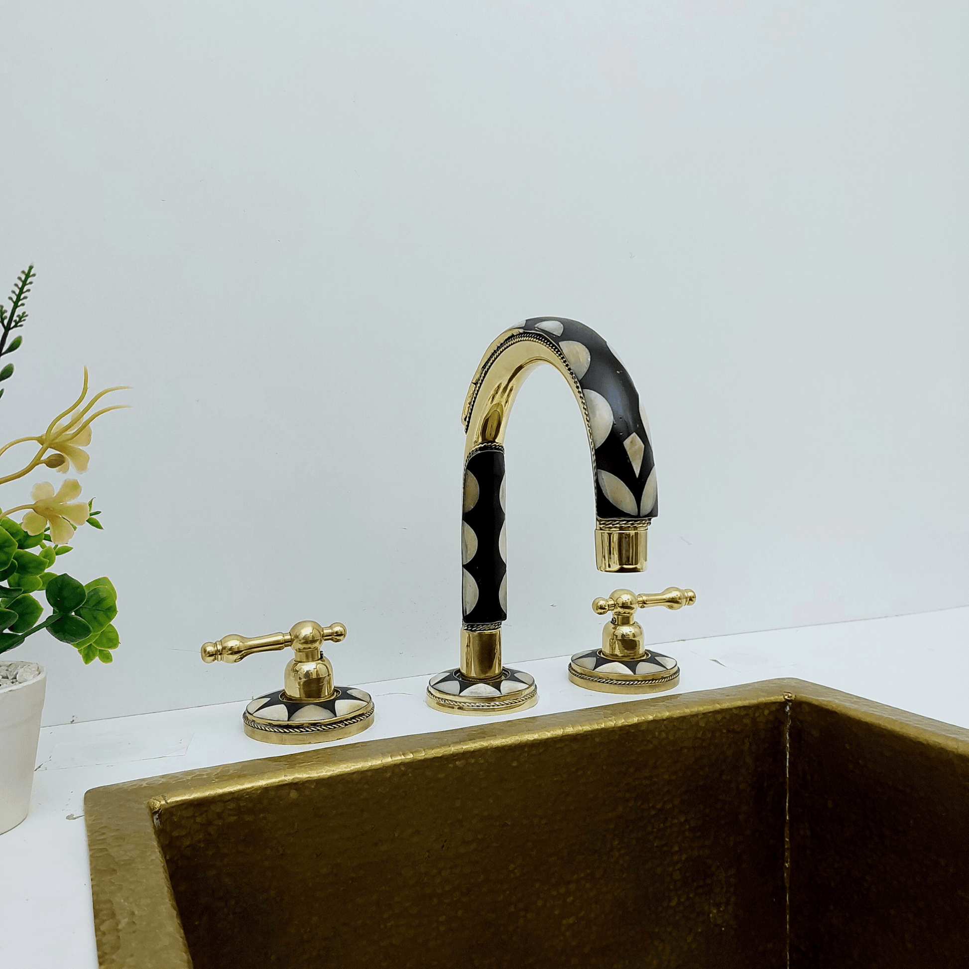 Elevate your bathroom's elegance with our Unlacquered Brass and Resin Bathroom Faucet. This antique-inspired faucet combines timeless design with modern functionality, creating a stunning centerpiece for your bathroom. Crafted from high-quality unlacquered brass, it features a distinctive patina that will develop over time, adding a unique, vintage charm to your space. The faucet is designed with lever handles that offer precise control over water flow and temperature, ensuring a seamless user experience.