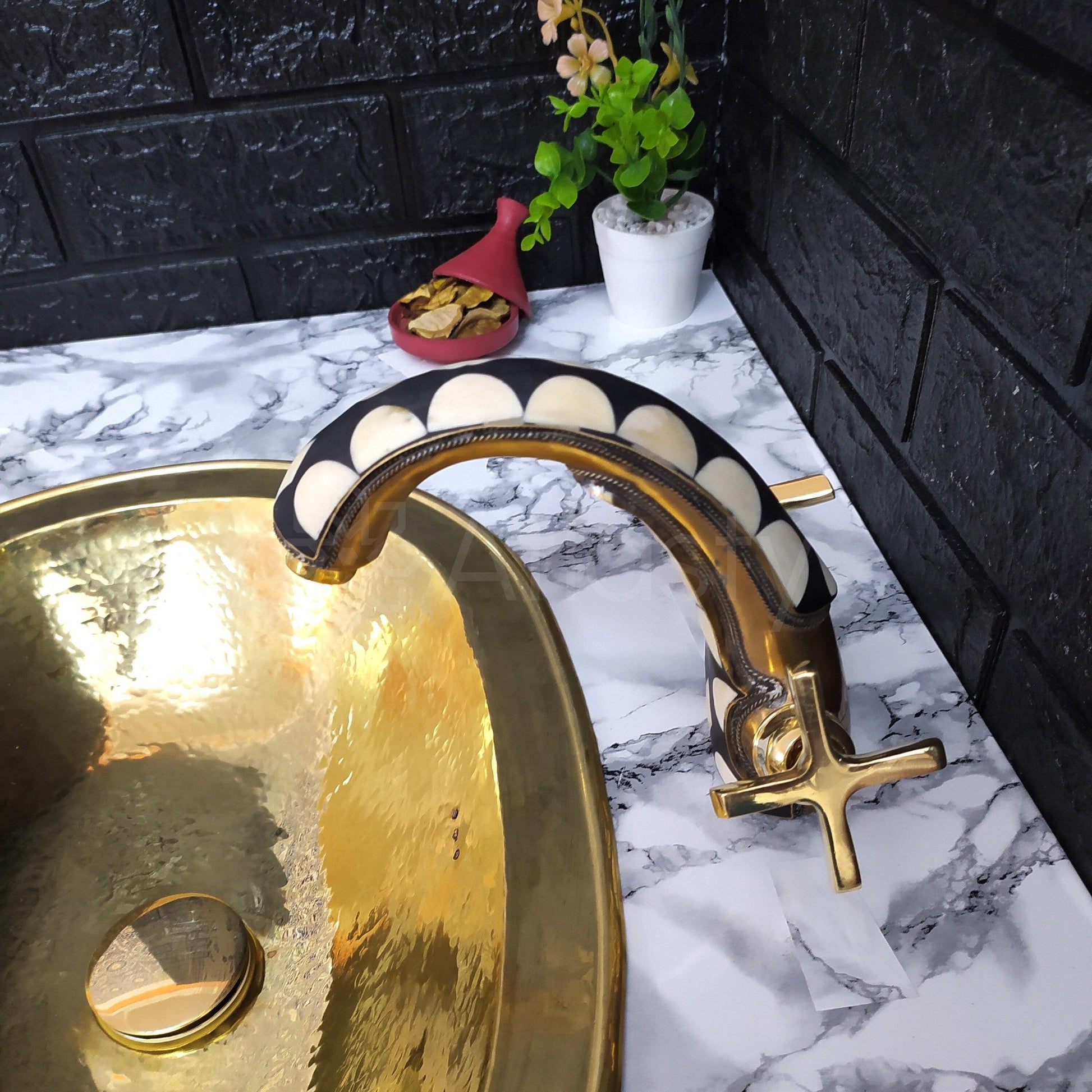 Unlacquered Brass and Resin Bathroom Faucet with Cross Handles