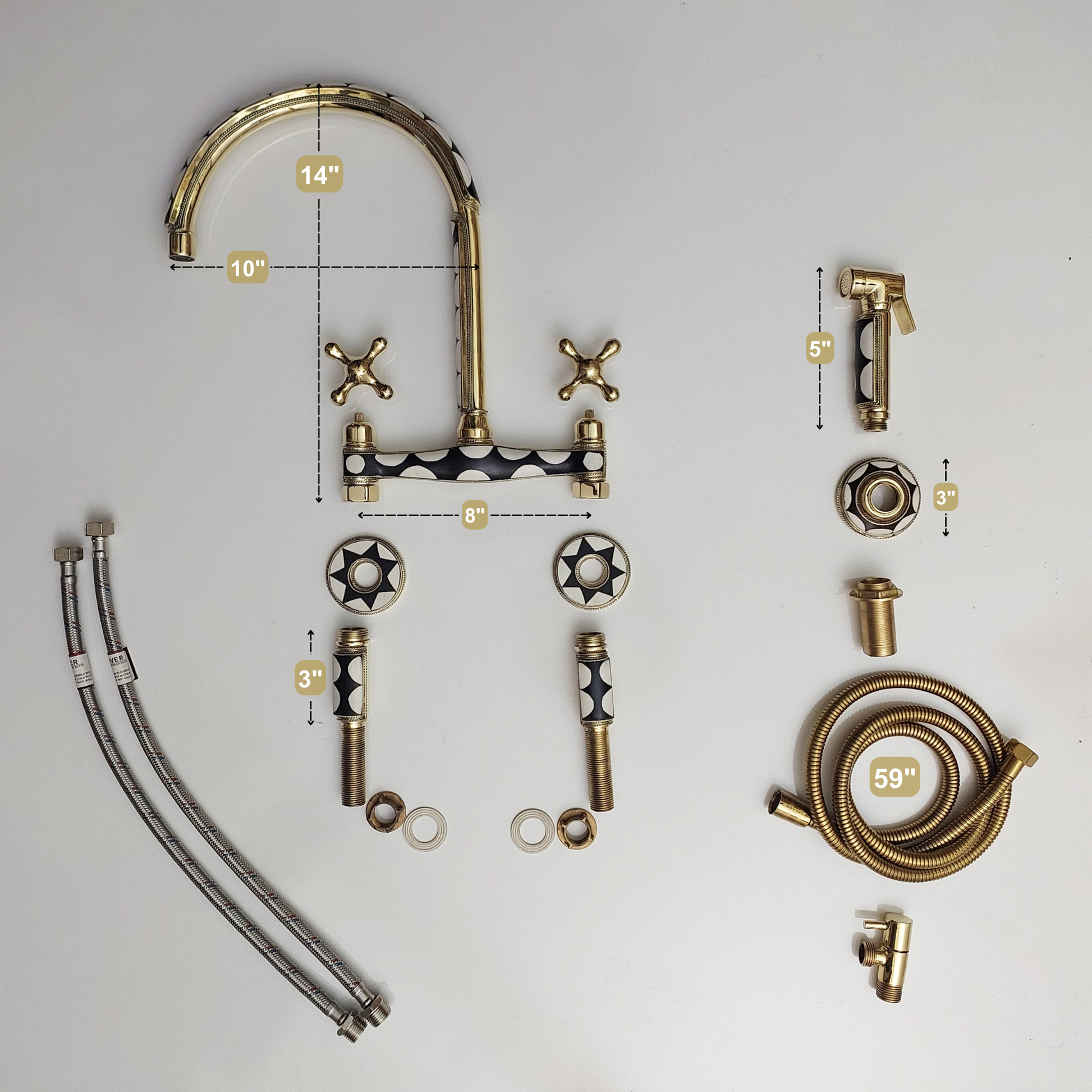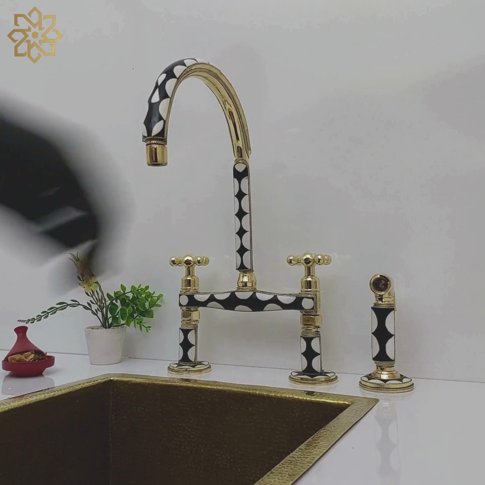 Elevate your Kitchen or bathroom with the timeless elegance of this Unlacquered Brass and Resin Bridge Faucet. Combining the warmth of natural materials with the durability of premium brass, this faucet is a stunning centerpiece for any bathroom or Kitchen design. The Unlacquered Finish allows the brass to develop a natural patina over time, enhancing its vintage charm and character. Featuring Cross Handles for effortless water flow and temperature control, and an integrated Sprayer that is optimal for rinsing, this faucet seamlessly blends style and functionality.