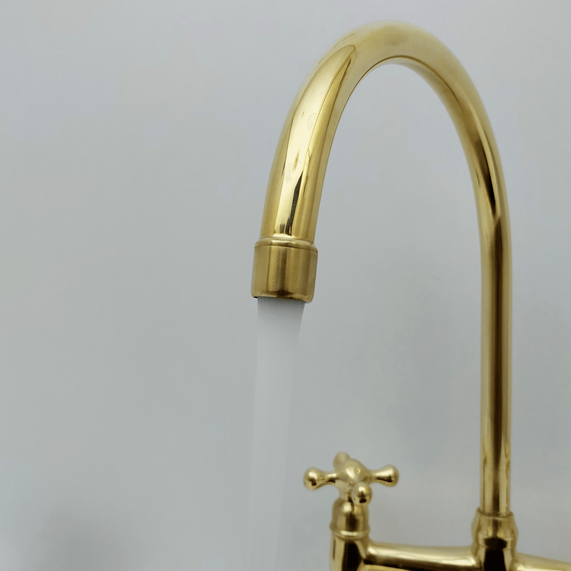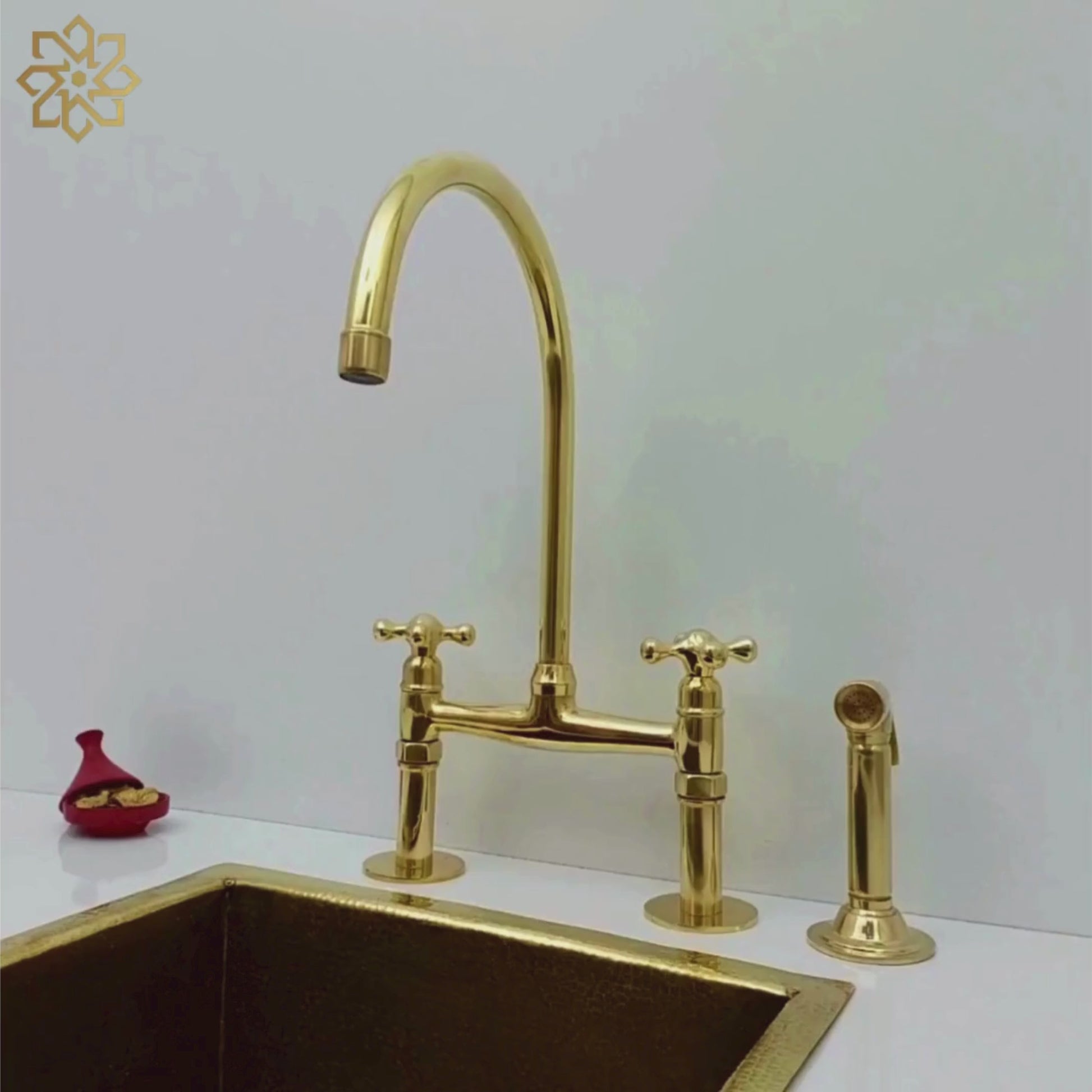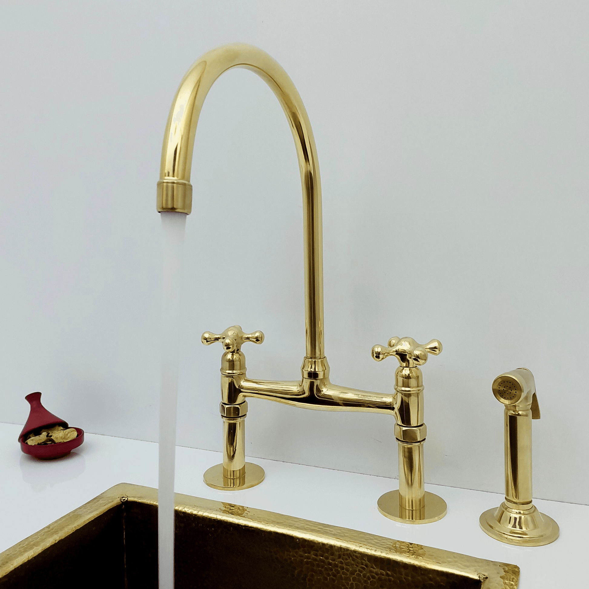 Introducing the Unlacquered Brass Bridge Faucet with sprayer, a luxurious addition to any kitchen, blending elegance with functionality. This faucet set, crafted from solid unlacquered brass, features a timeless bridge design paired with traditional cross handles. The warm gold tone of the brass will naturally develop a beautiful patina over time, enhancing its antique appeal.