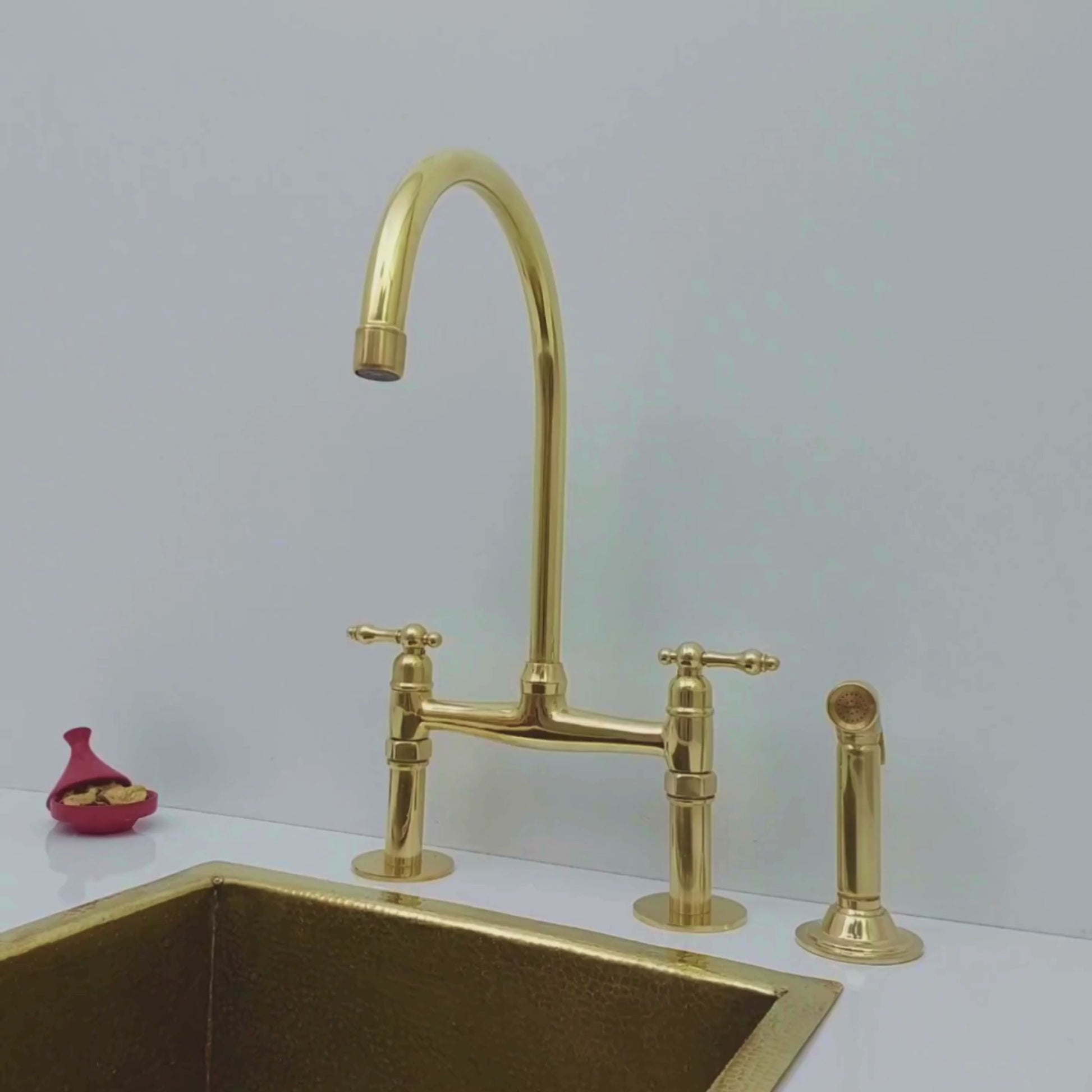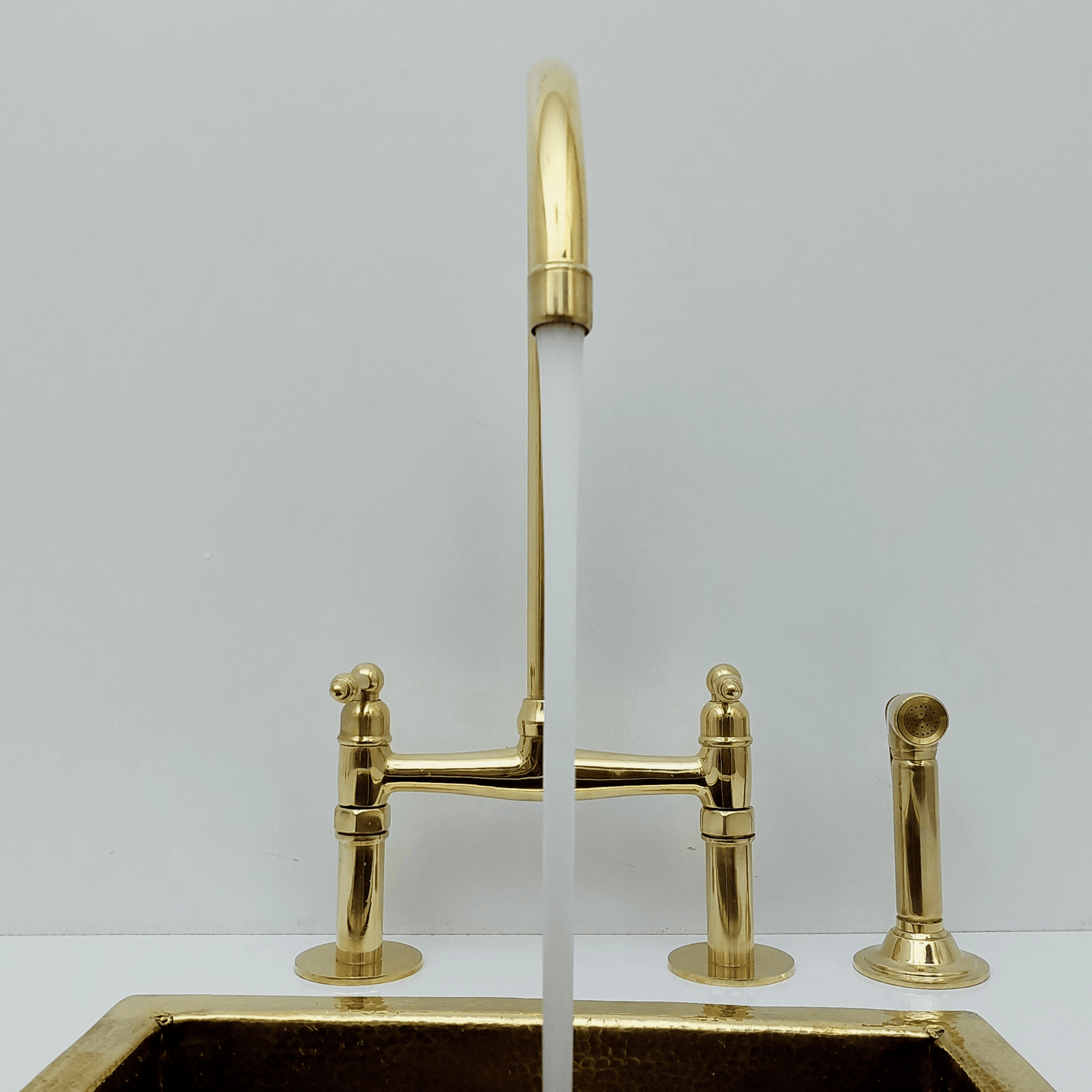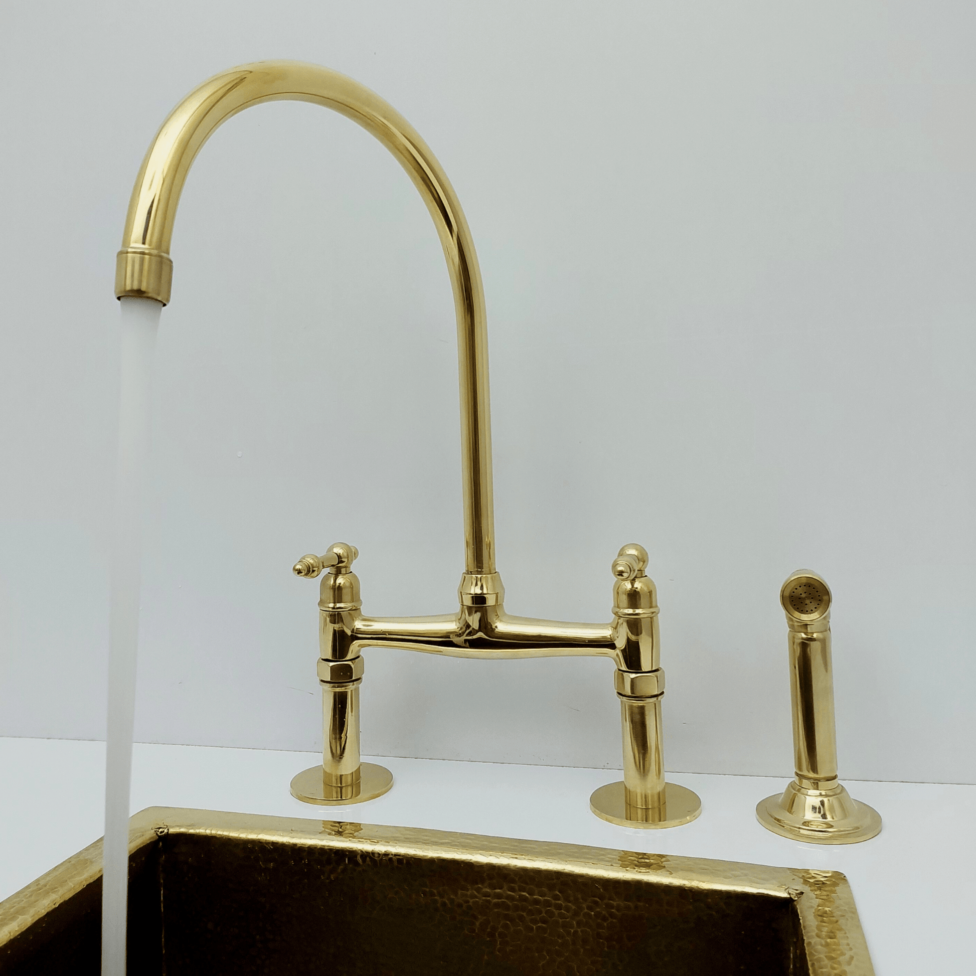 Introducing the Unlacquered Brass Bridge Faucet with sprayer, a luxurious addition to any kitchen, blending elegance with functionality. This faucet set, crafted from solid unlacquered brass, features a timeless bridge design paired with traditional lever handles. The warm gold tone of the brass will naturally develop a beautiful patina over time, enhancing its antique appeal.