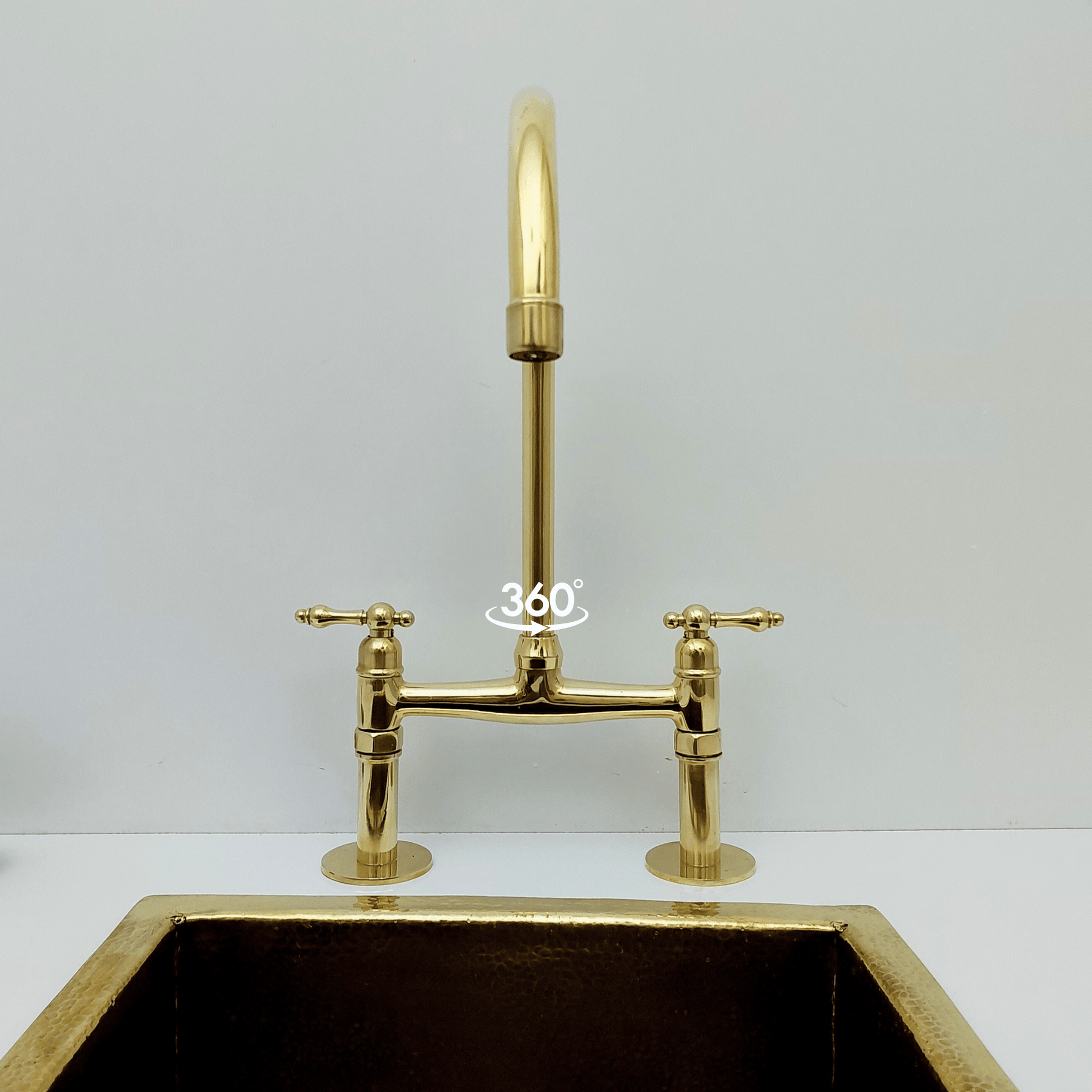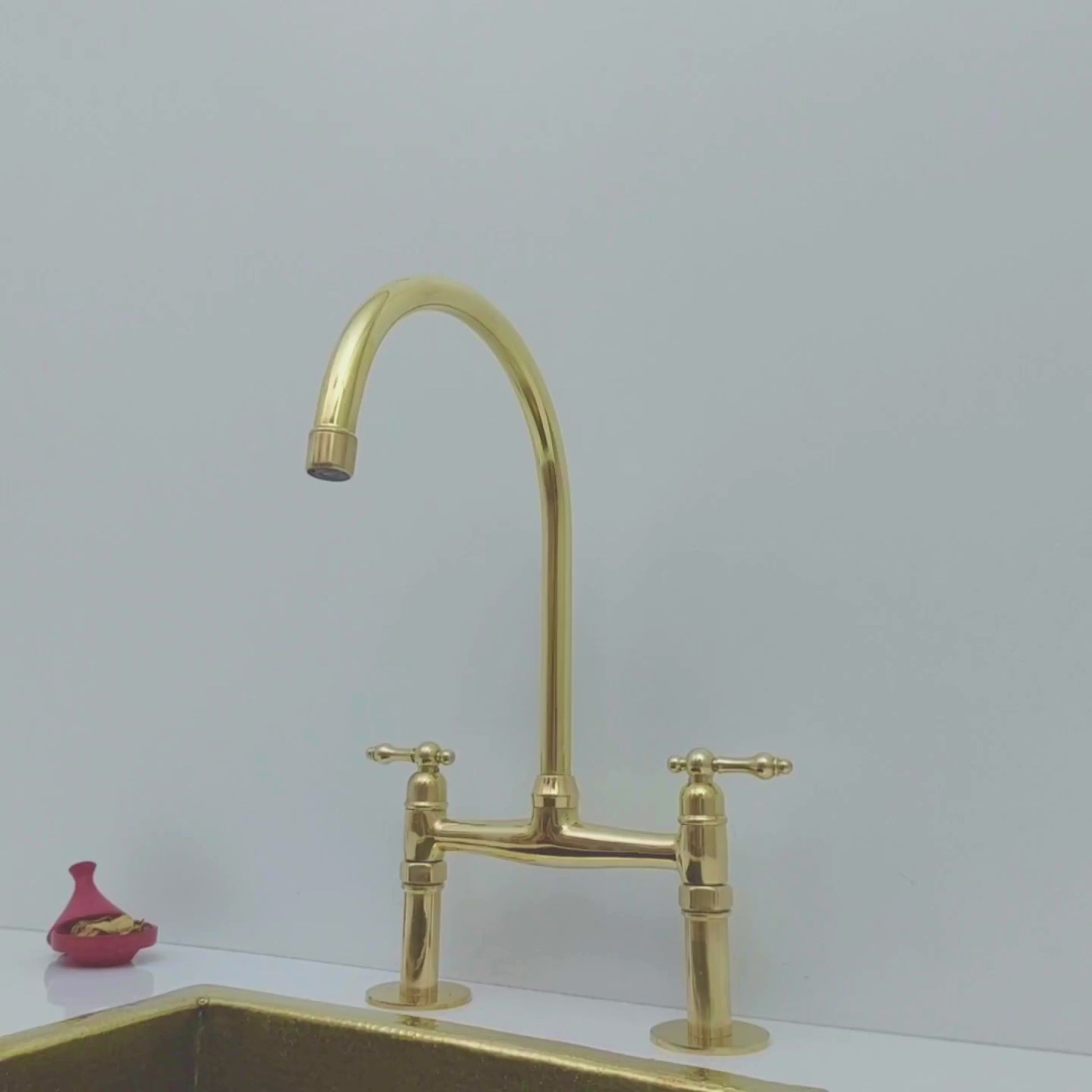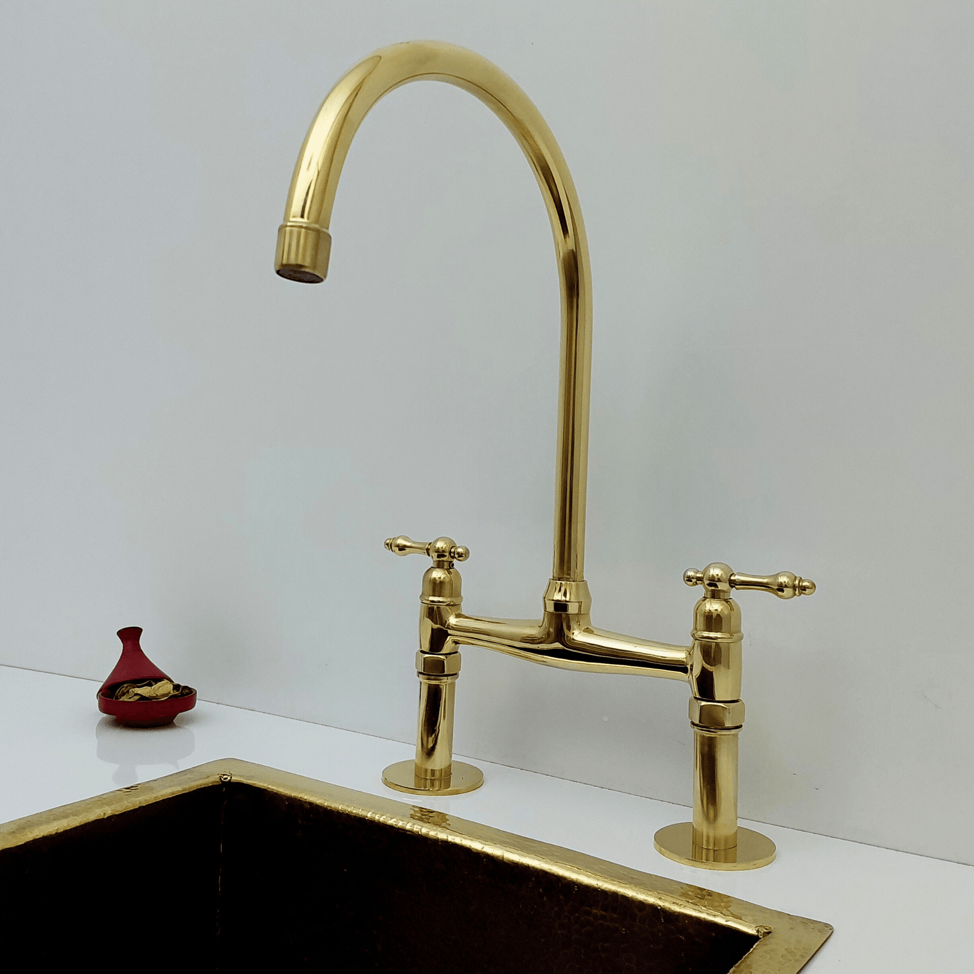 Enhance your kitchen with this stunning Unlacquered Brass Bridge Kitchen Faucet with lever handles, a timeless piece designed to bring elegance and functionality to your space. Crafted from solid brass, this faucet features a polished, unlacquered finish that will develop a rich patina over time, adding character to your kitchen. Its classic bridge design with lever handles offers a blend of traditional and modern appeal, making it a versatile addition to any kitchen style.