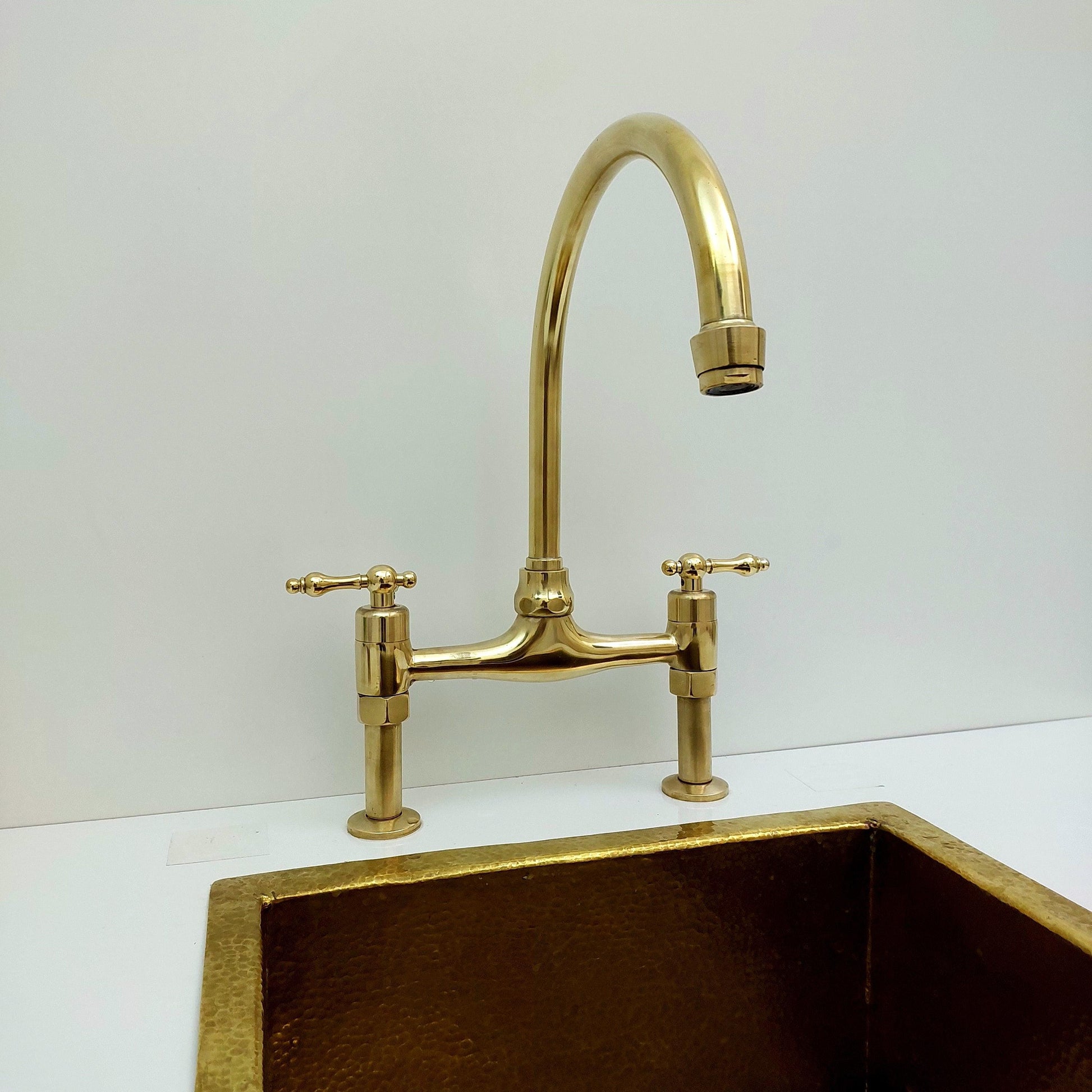 An unlacquered brass bridge kitchen faucet is a traditional style faucet with two handles and a bridge connecting the hot and cold water supply. It is made of solid brass that is untreated, allowing it to age naturally and develop a unique patina over time. This type of faucet is a popular choice for those who want to achieve a vintage look in their kitchen.