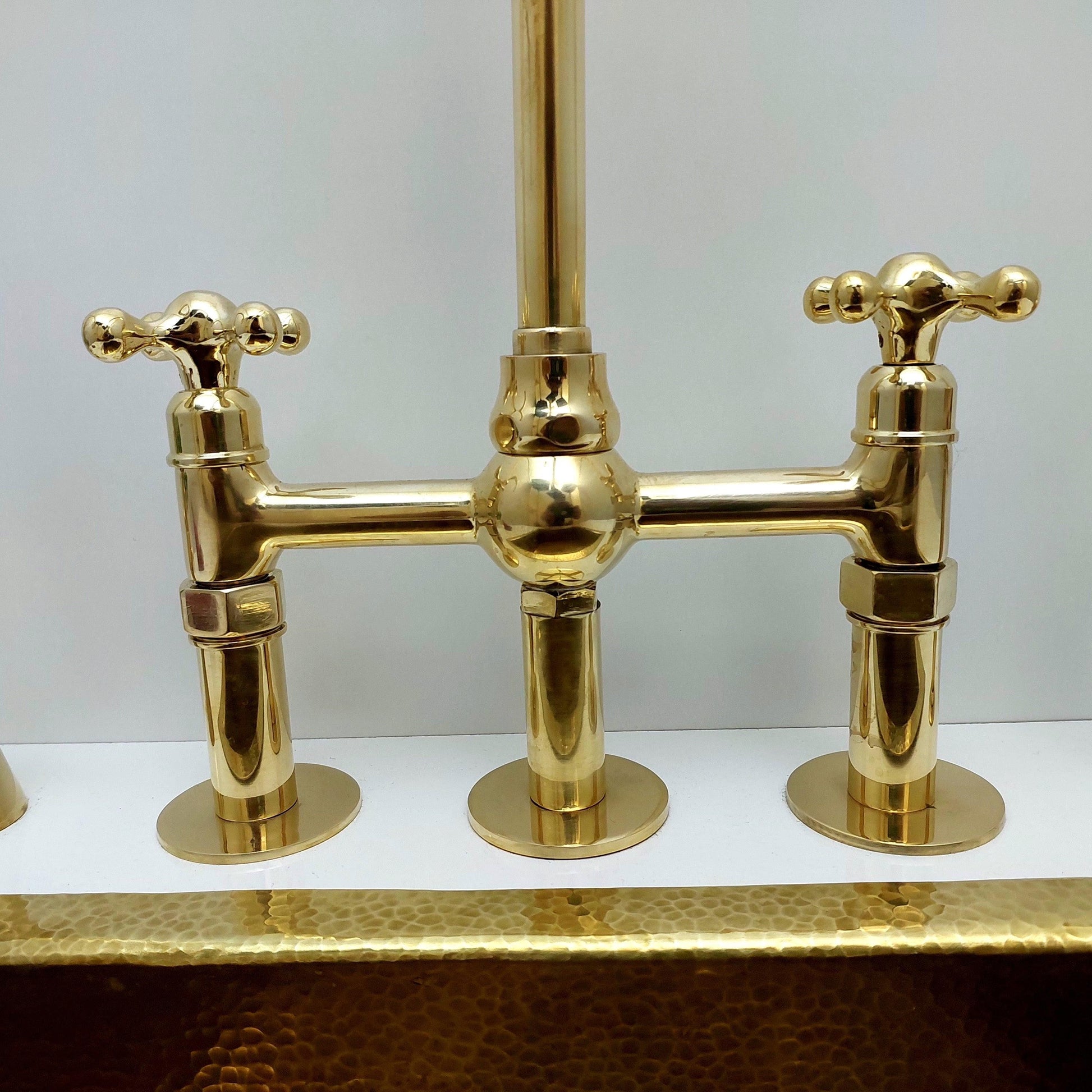Unlacquered Brass Bridge Kitchen Faucet With Ball Center, 3 Straight Legs, And Cross Handles - 8" Spread - Ref: APC-4