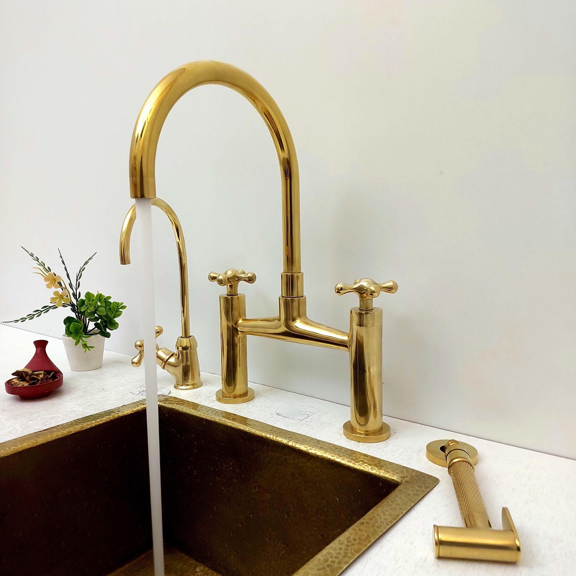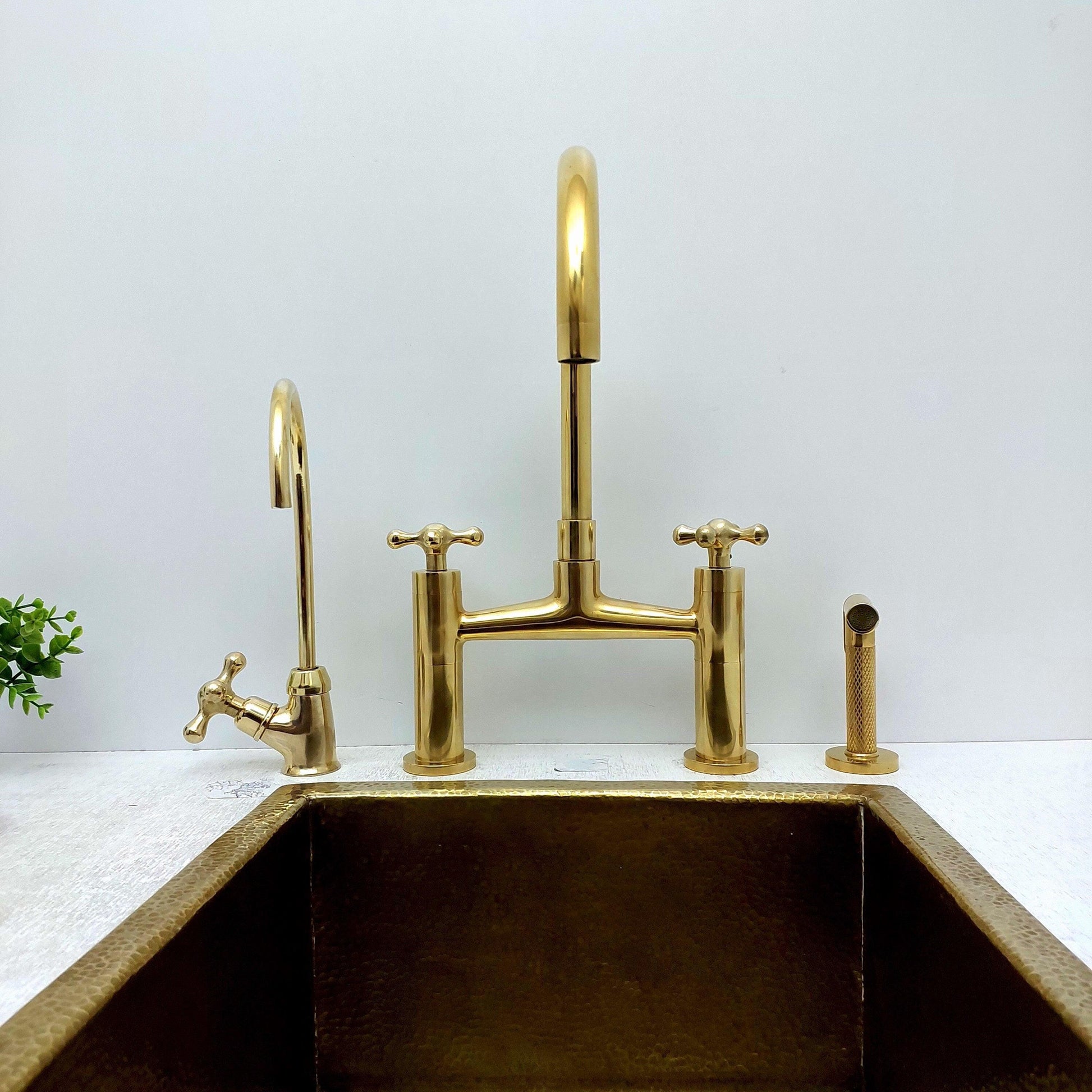 Unlacquered Brass Bridge Kitchen Faucet With Sprayer, Cold Water Faucet And Cross Handles - Ref:AKFC-1