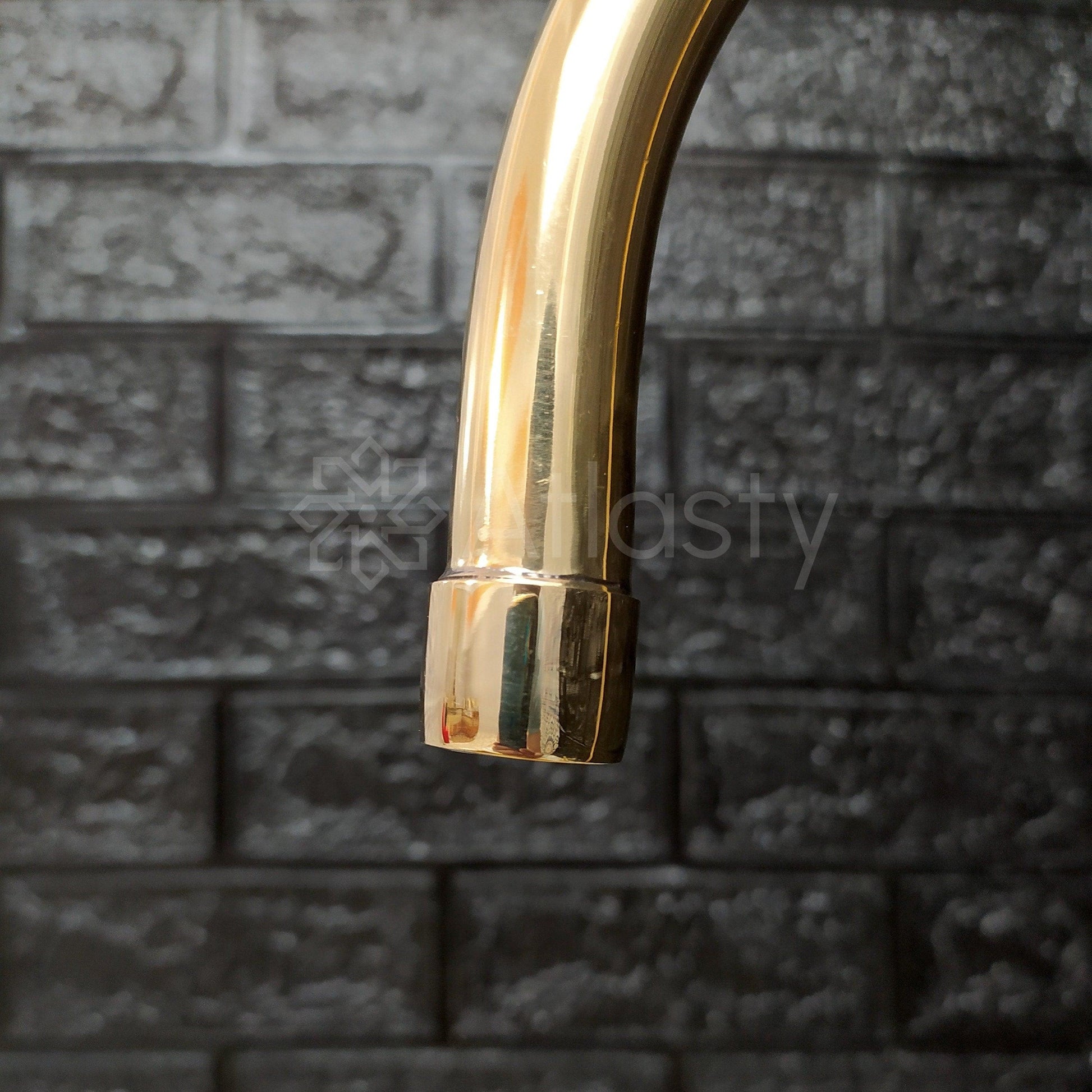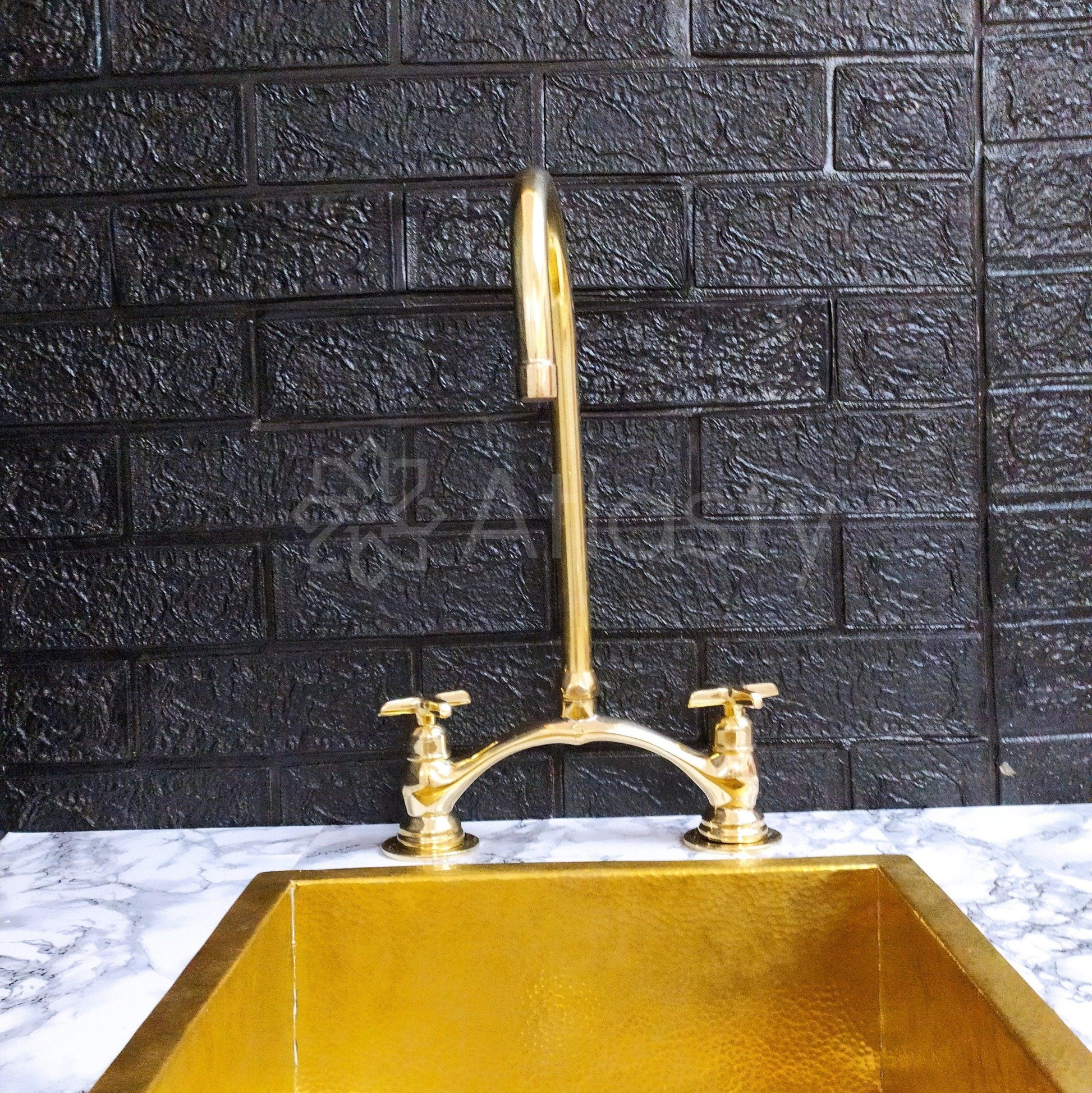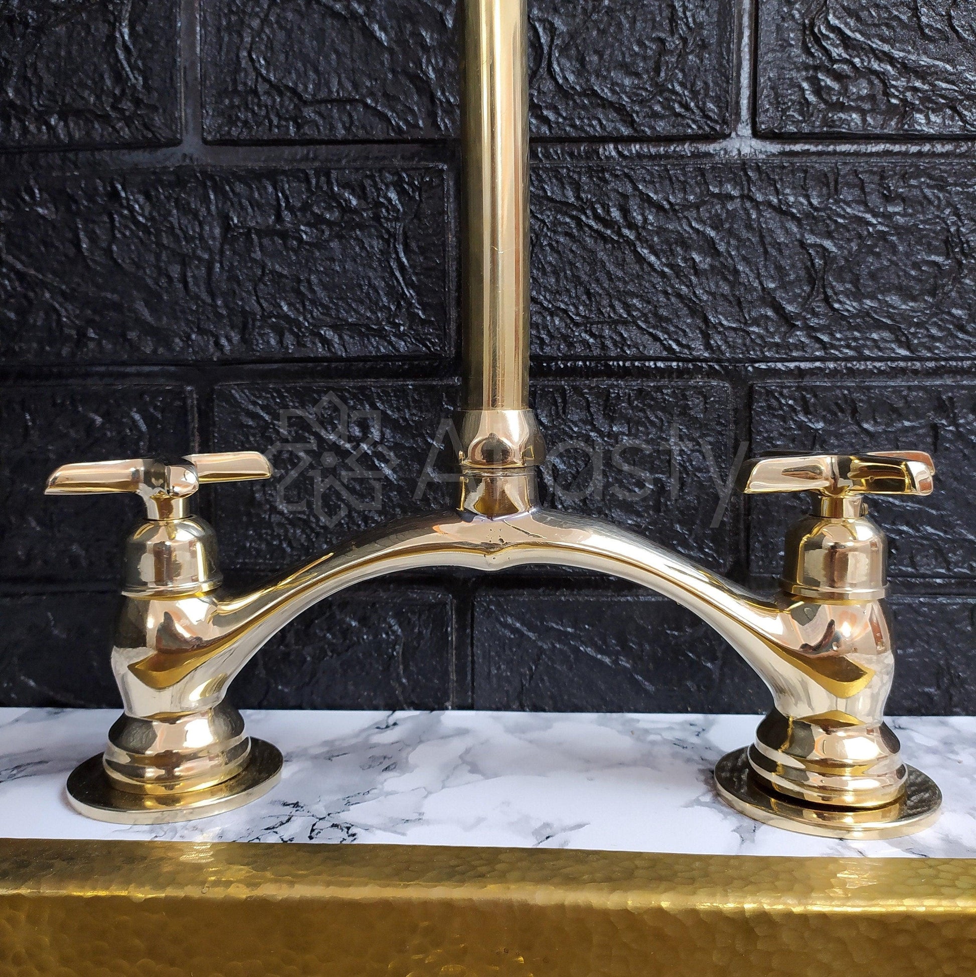 An unlacquered brass bridge kitchen faucet is a traditional style faucet with two handles and a bridge connecting the hot and cold water supply. It is made of solid brass that is untreated, allowing it to age naturally and develop a unique patina over time. This type of faucet is a popular choice for those who want to achieve a vintage look in their kitchen.