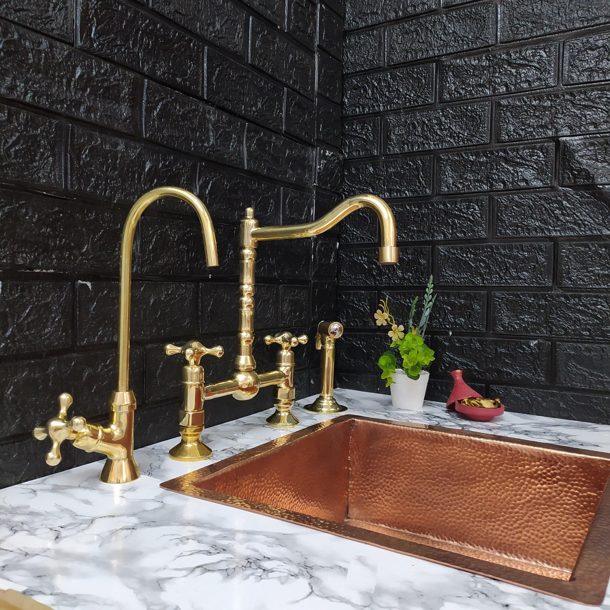 Unlacquered Brass Bridge Kitchen Faucet with Sprayer, Cold Water Tap, and Cross Handles - Ref: APC-92