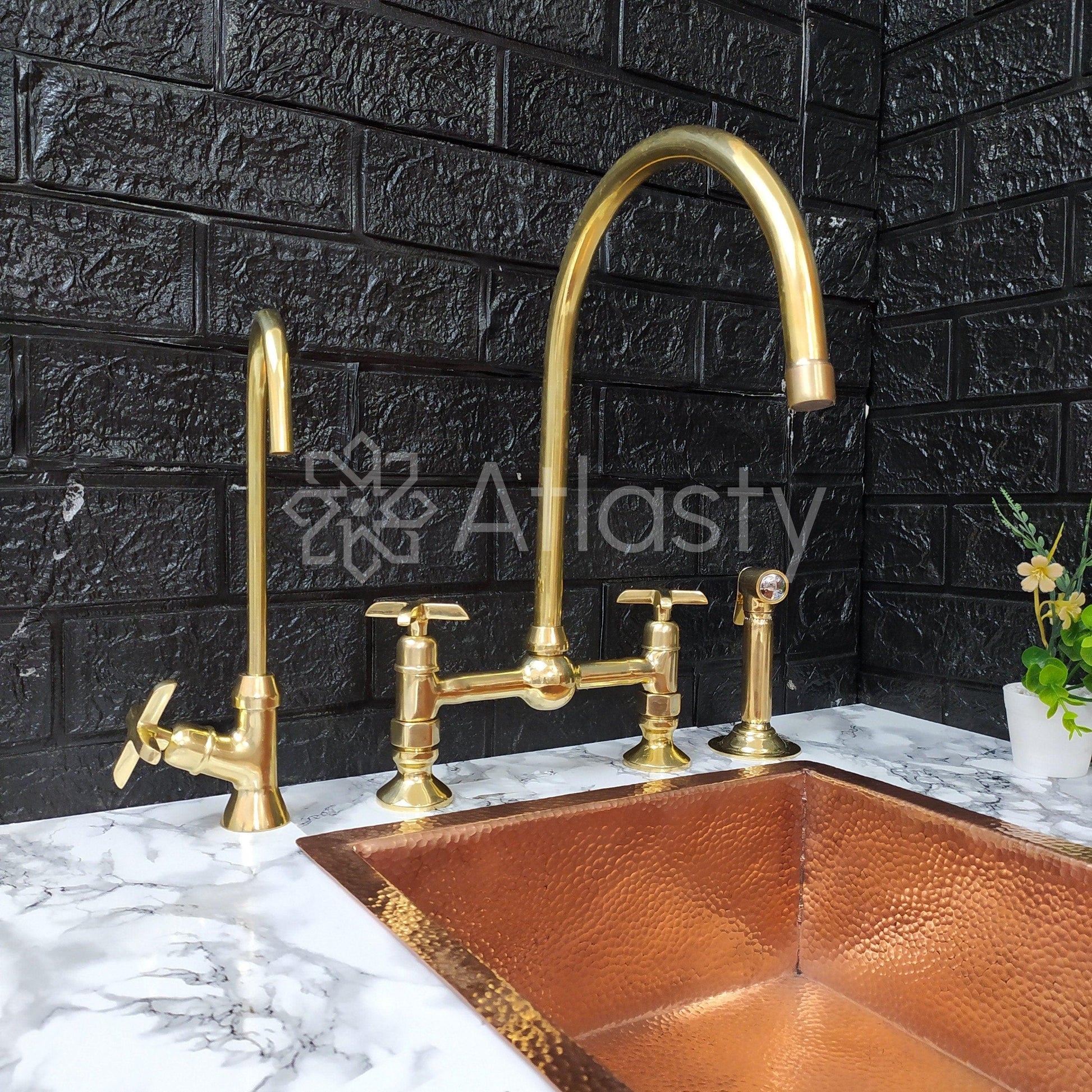 Unlacquered Brass Bridge Kitchen Faucet with Sprayer, Cold Water Tap, and Cross Handles - Ref: APC-93