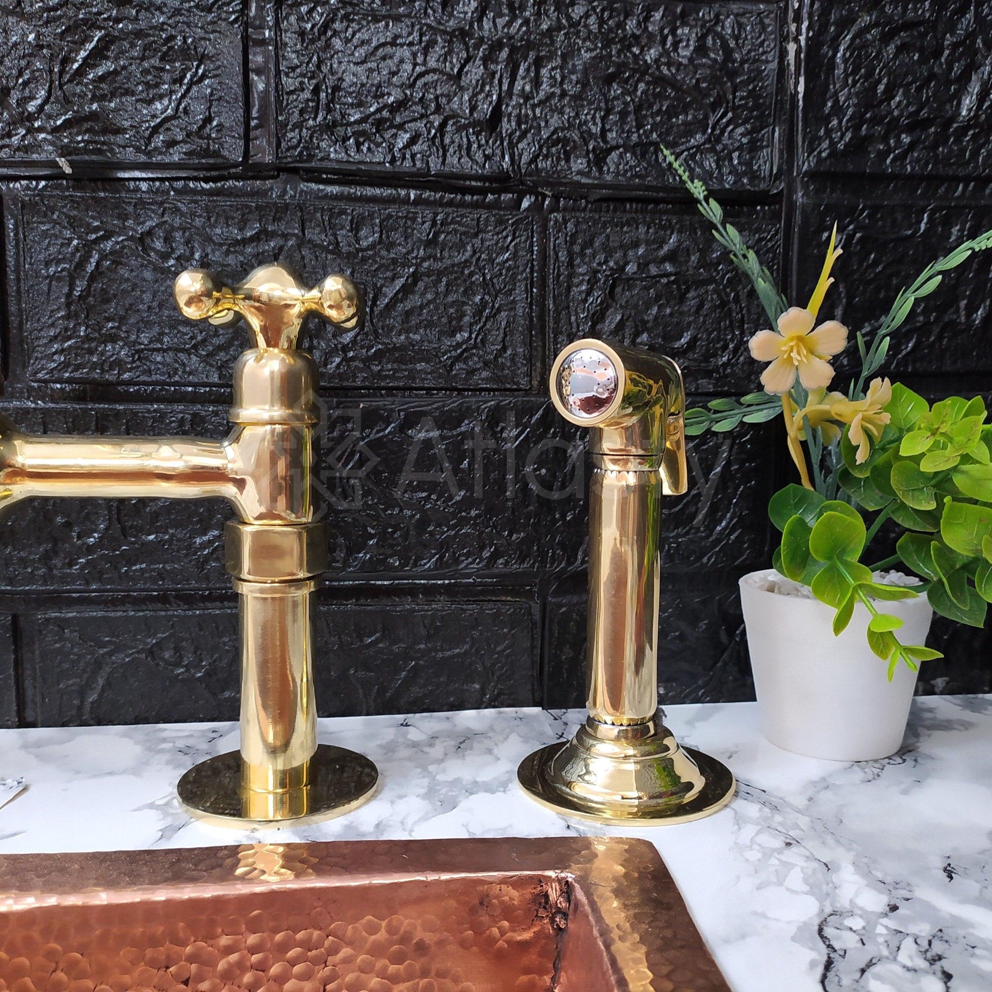 Unlacquered Brass Bridge Kitchen Faucet with Sprayer, Cold Water Tap, and Cross Handles - Ref: APC-98