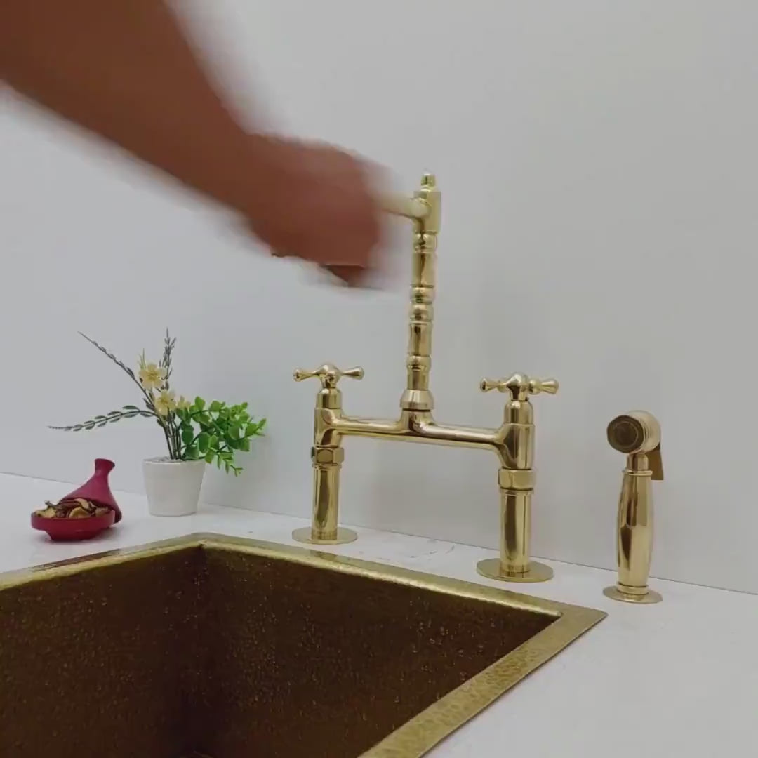 Unlacquered Brass Bridge Kitchen Faucet with Sprayer - Ref: APCL-4