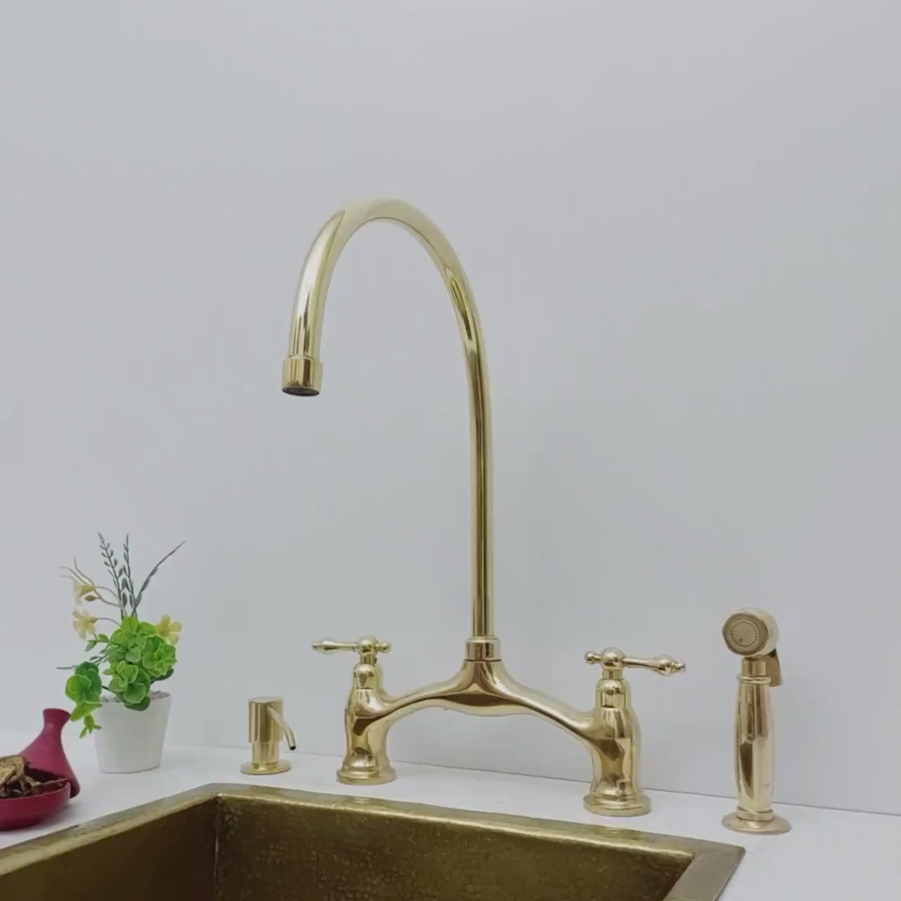 Unlacquered Brass Bridge Vintage Kitchen Faucet With Sprayer and Soap Dispenser, Living Finish Antique Brass Kitchen Faucet-ref:APCL-8