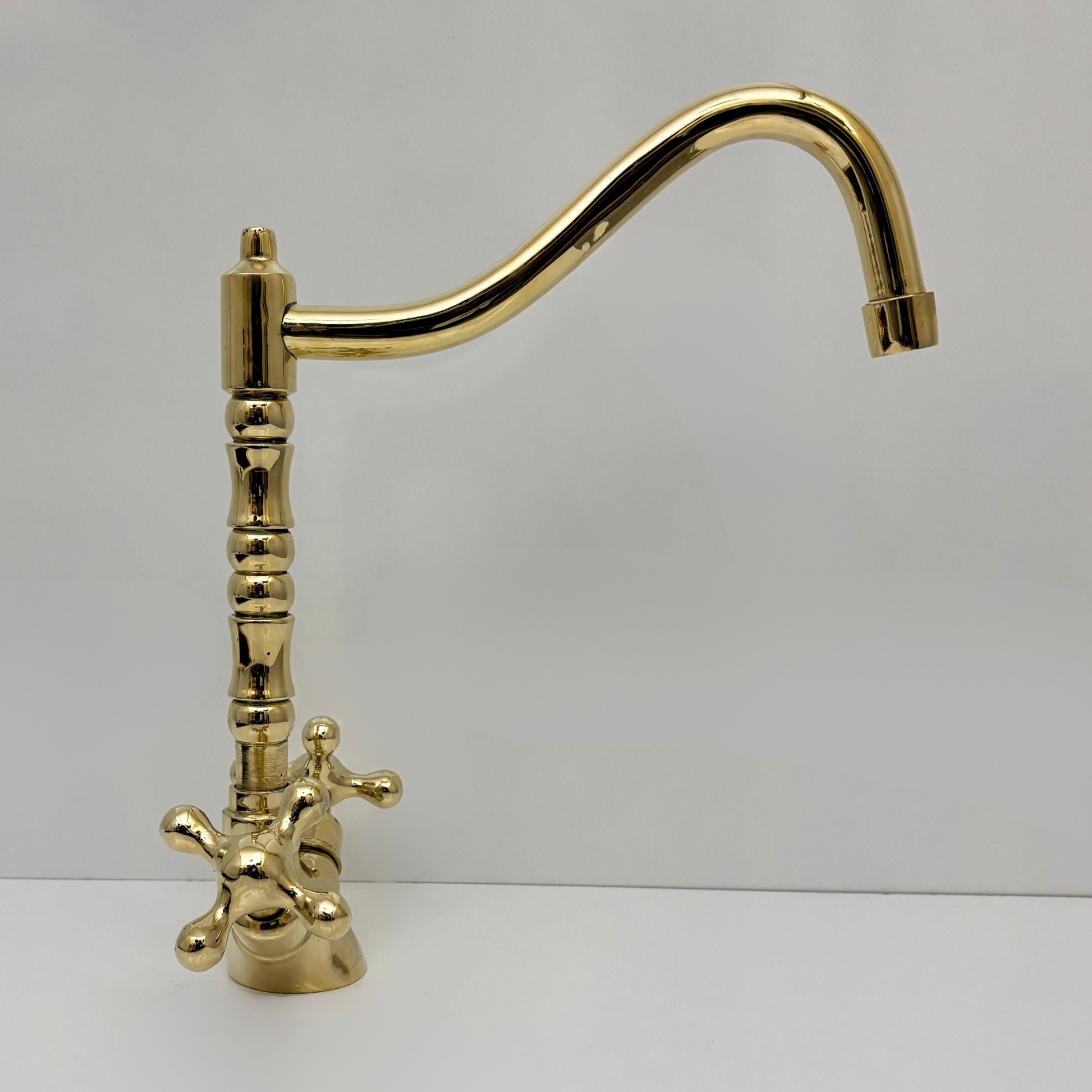 Unlacquered Brass Gooseneck Faucet with double Cross Handles, Solid Brass Kitchen Faucet - Ref: UBFDH1C