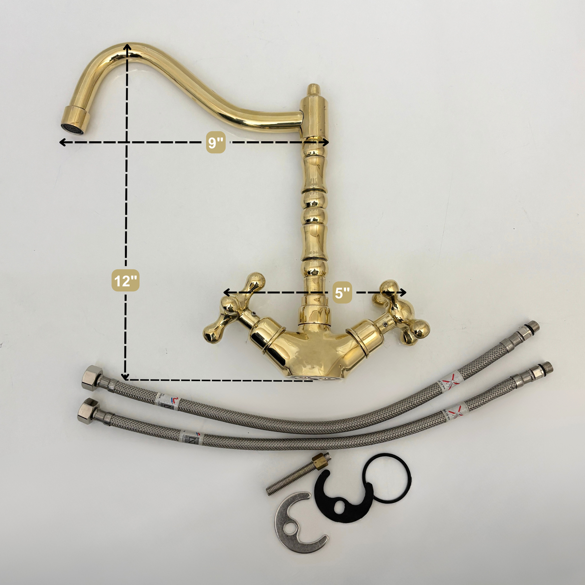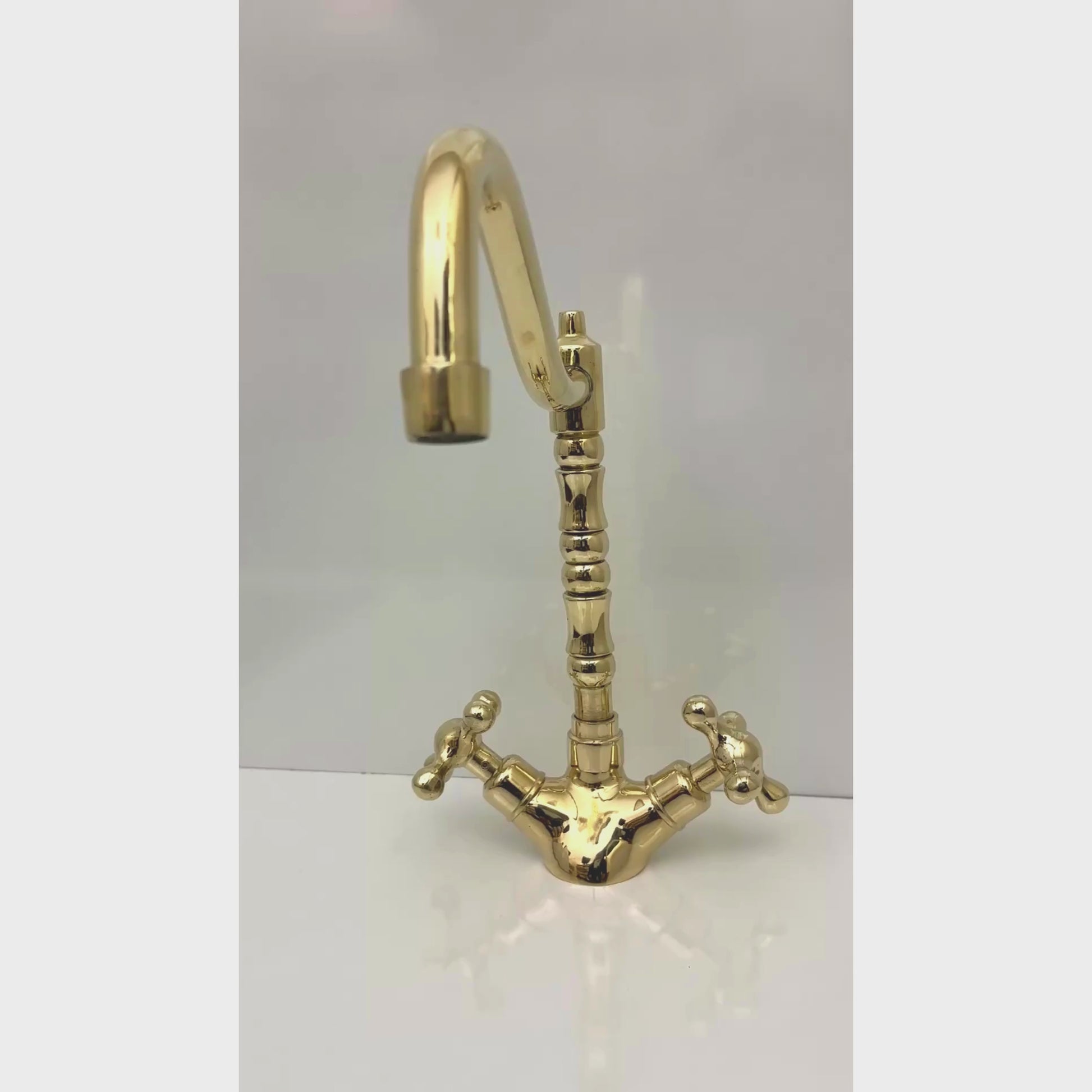 Unlacquered Brass Gooseneck Faucet crafted from solid brass, this faucet is perfect for your kitchen. It features a graceful gooseneck spout for ample clearance, making it perfect for filling large pots or cleaning dishes. The double cross handles add a touch of vintage charm while offering precise control over water flow and temperature. The unlacquered brass finish develops a unique patina over time. Perfect for traditional, vintage, or modern rustic spaces, this faucet is as durable as it is stylish.