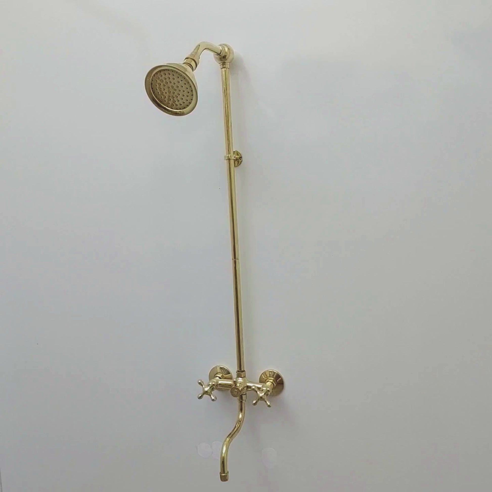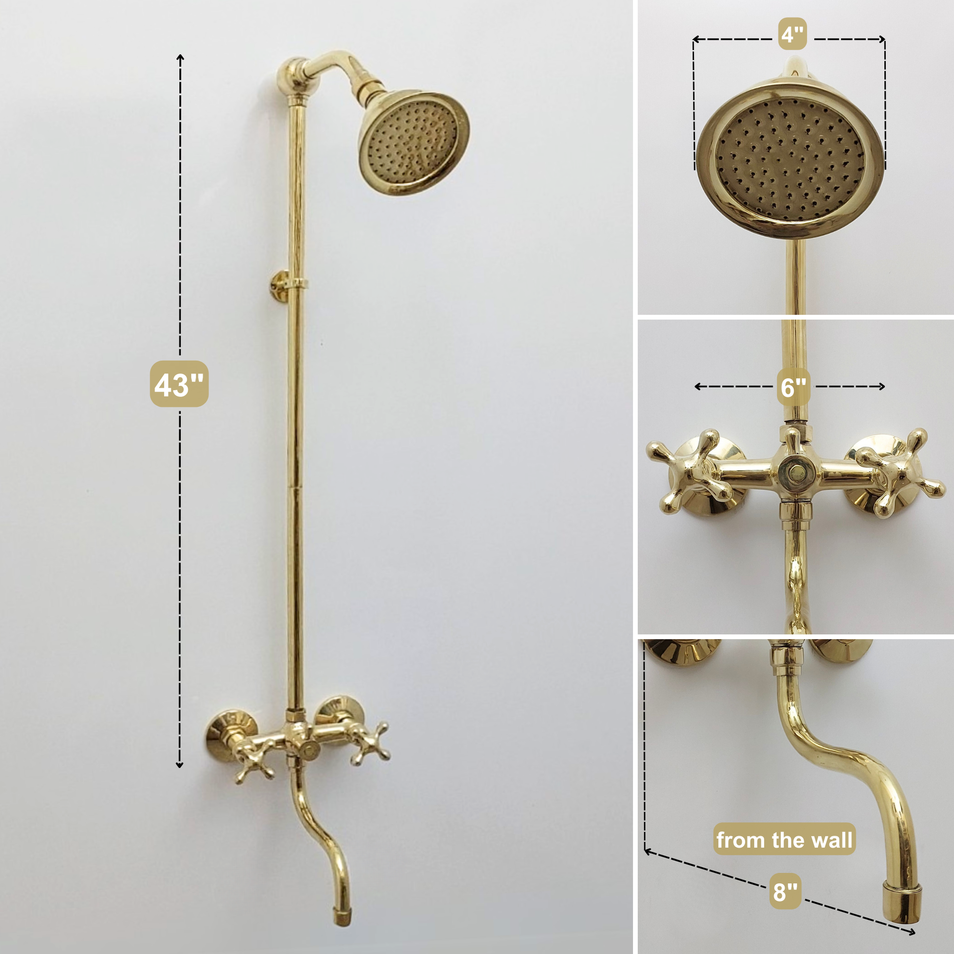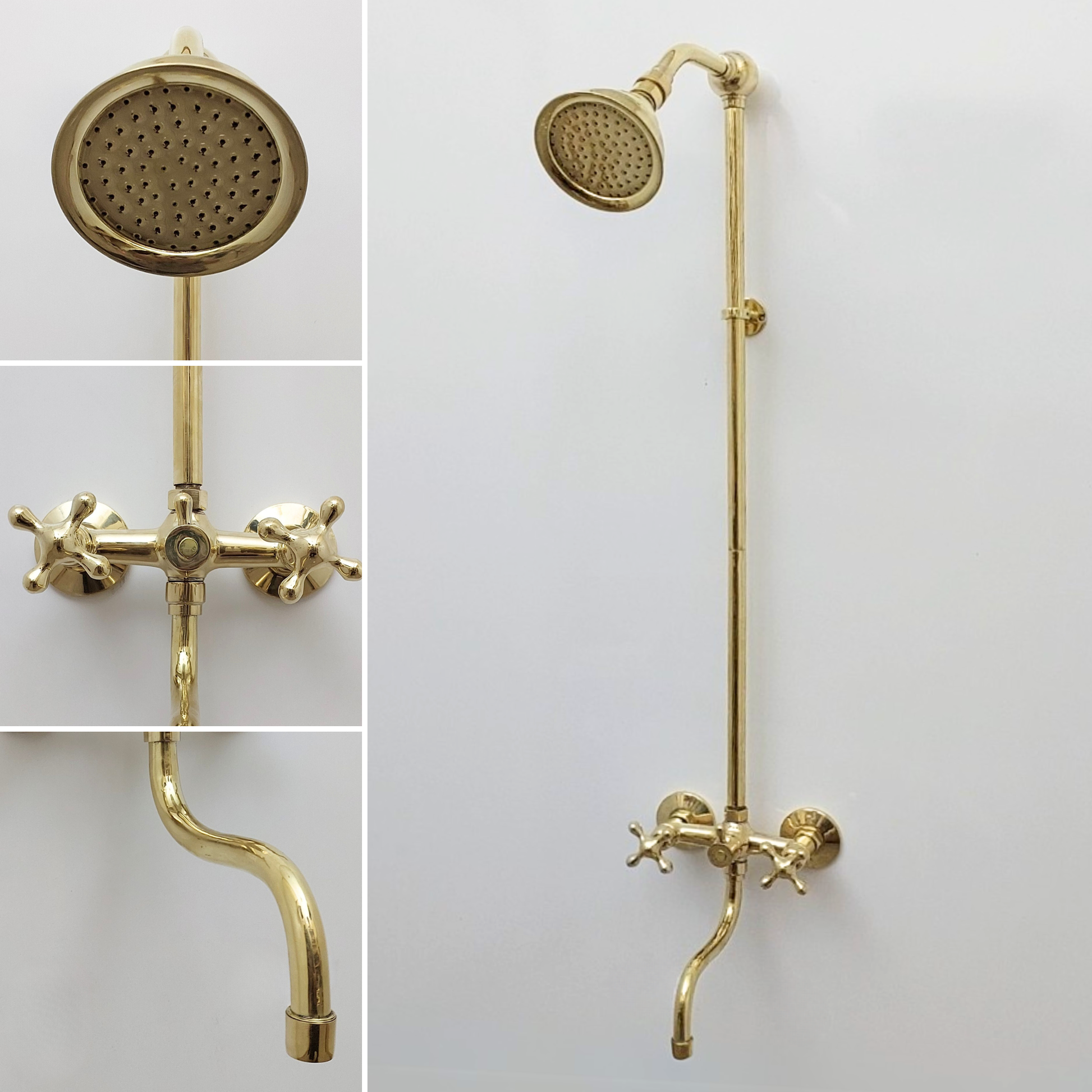 Bring elegance and timeless style to your bathroom with this Unlacquered Brass Shower System. Featuring an Adjustable Round Shower Head for a luxurious rain-like experience, a convenient Tub Filler for versatile use, classic Cross Handles for easy water control, and a small Lever Handle Diverter to seamlessly switch water flow between the shower head and tub filler. Crafted from premium brass with an unlacquered finish, this shower system develops a natural patina over time, enhancing its vintage appeal and making it the perfect blend of functionality and sophistication.