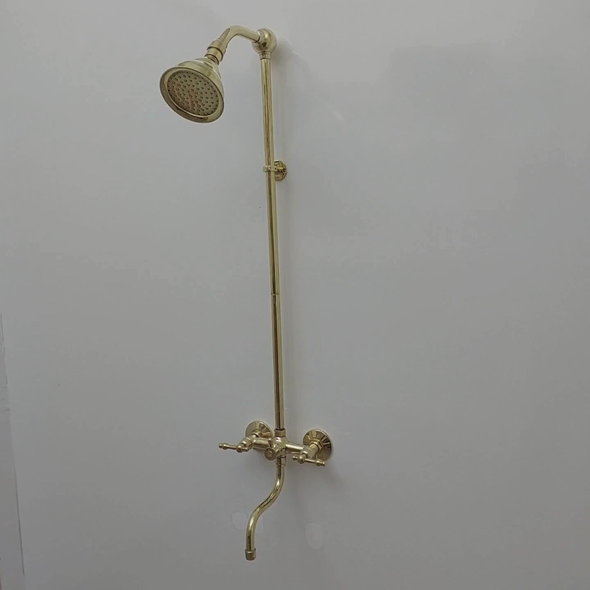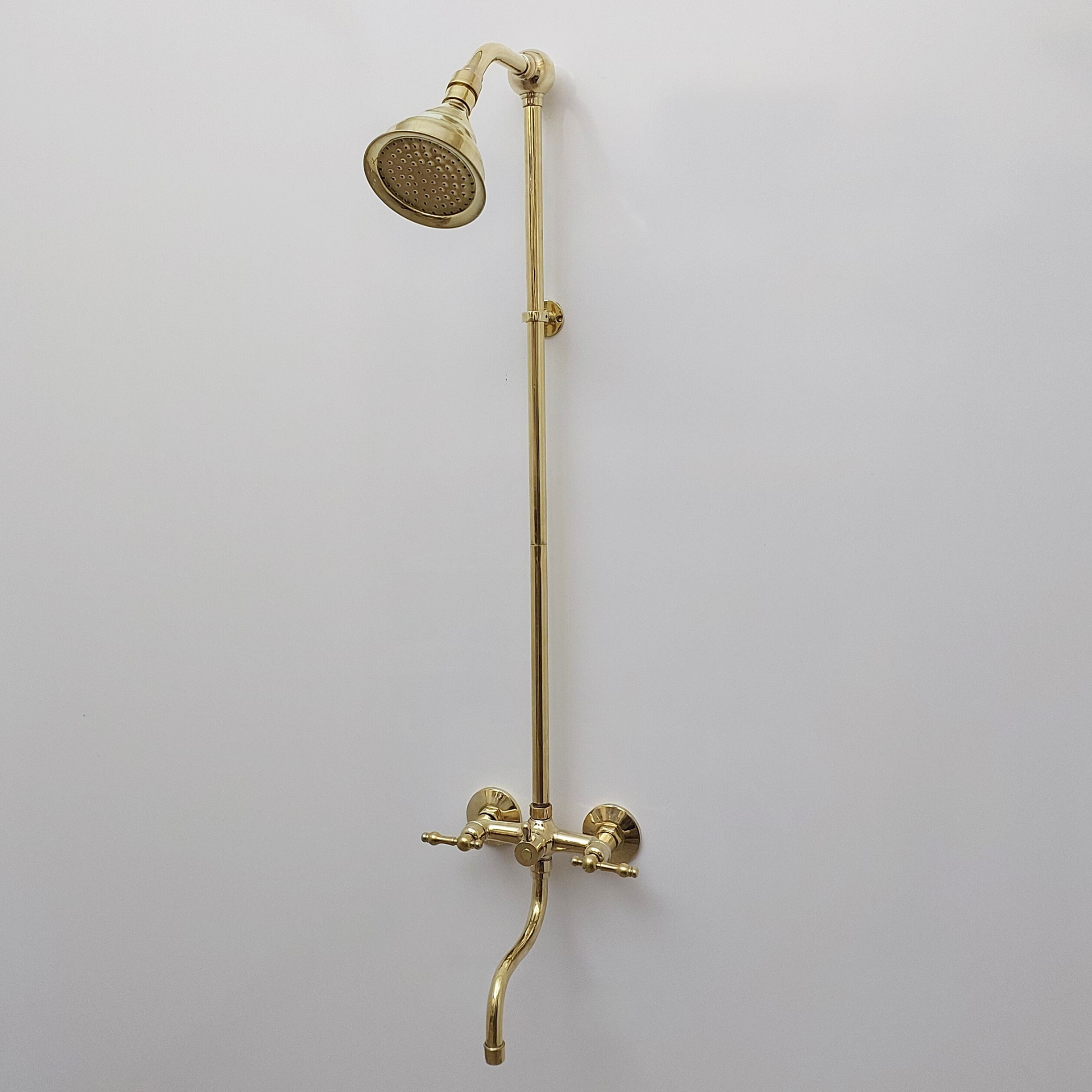 Bring elegance and timeless style to your bathroom with this Unlacquered Brass Shower System. Featuring an Adjustable Round Shower Head for a luxurious rain-like experience, a convenient Tub Filler for versatile use, classic Lever Handles for easy water control, and a small Lever Handle Diverter to seamlessly switch water flow between the shower head and tub filler. Crafted from premium brass with an unlacquered finish, this shower system develops a natural patina over time, enhancing its vintage appeal and making it the perfect blend of functionality and sophistication.