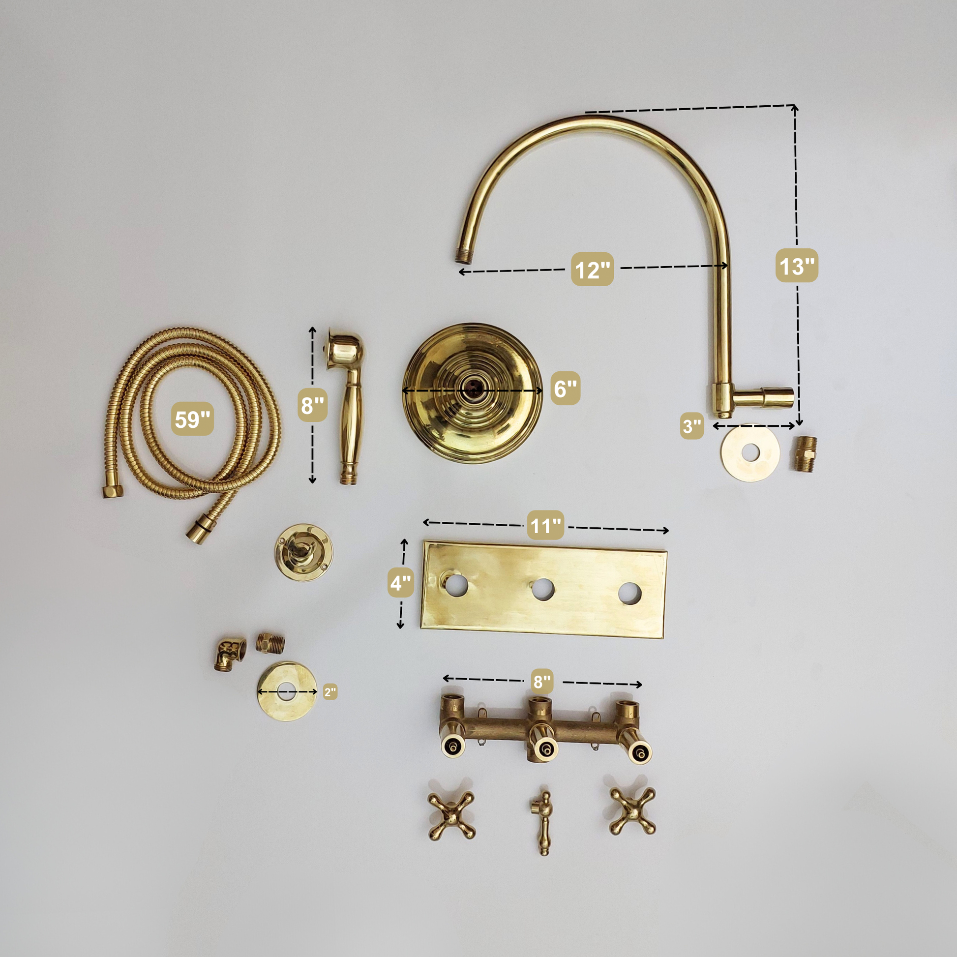 Transform your bathroom into a luxurious retreat with this Unlacquered Brass Shower System, featuring a striking Central Brass Plaque with Cross Handles and a bridge arm supporting a large, round rain shower head for a spa-like experience. Made from solid brass, this system will develop a rich patina over time, adding unique character to your space. The brass plaque serves as the control hub, with smooth cross handles for precise water temperature and flow adjustment. Paired with a versatile handheld shower head, this system offers both luxury and practicality, making it the perfect centerpiece for any bathroom.