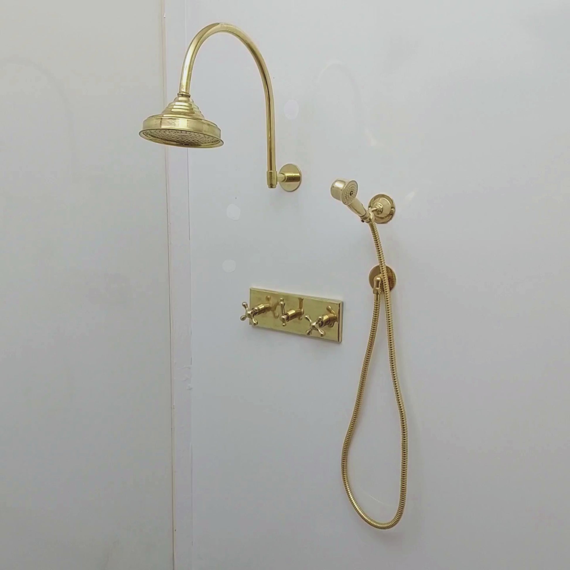 Unlacquered Brass Shower System with Central Brass Plaque and Cross Handles, Bridge Arm Round Rain Shower Head - Ref: SSPH-UBC