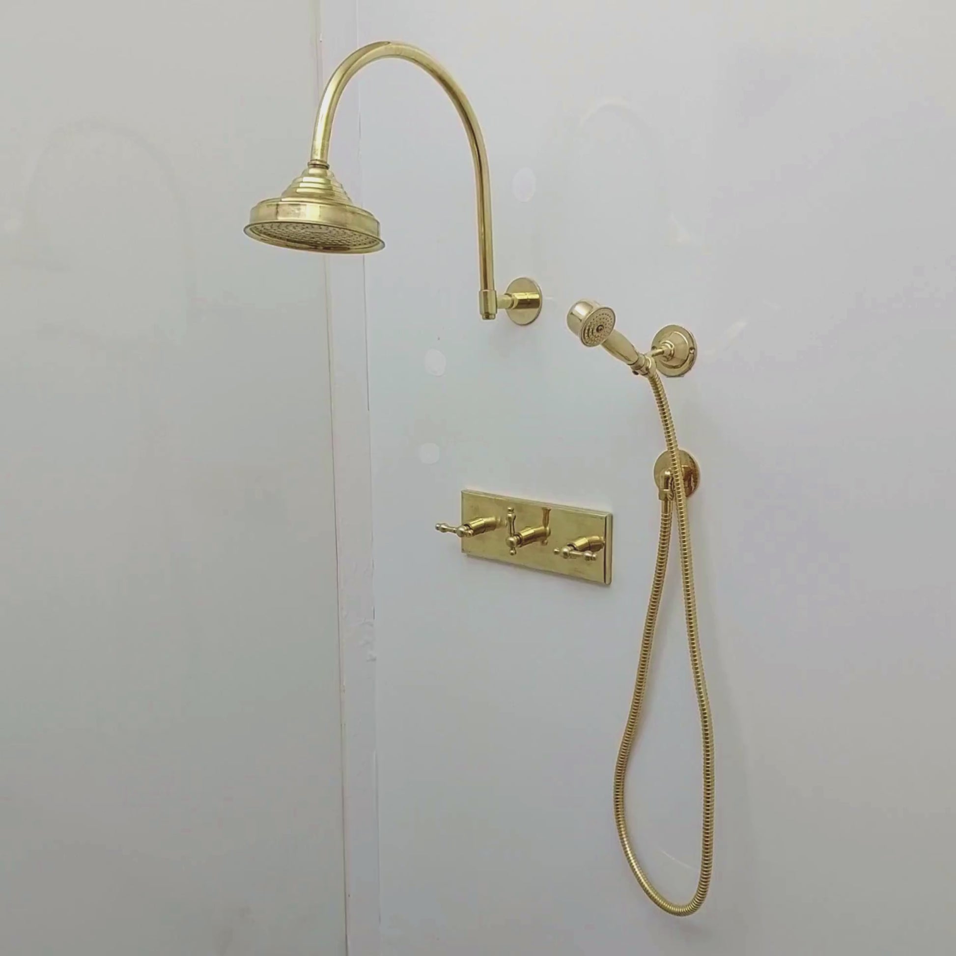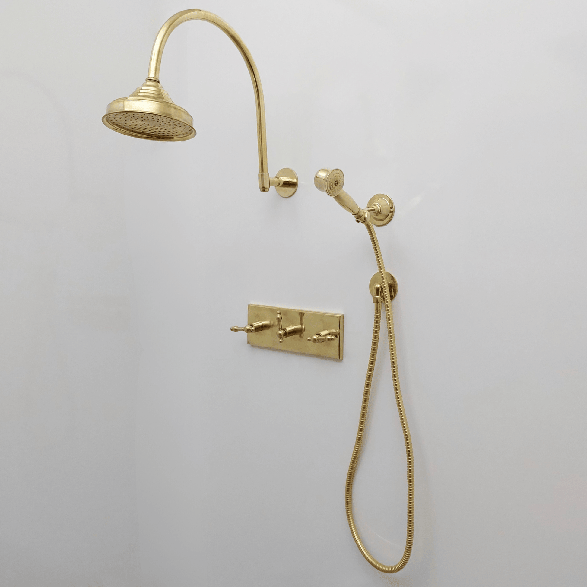 Transform your bathroom into a luxurious retreat with this Unlacquered Brass Shower System, featuring a striking Central Brass Plaque with Lever Handles and a bridge arm supporting a large, round rain shower head for a spa-like experience. Made from solid brass, this system will develop a rich patina over time, adding unique character to your space. The brass plaque serves as the control hub, with smooth lever handles for precise water temperature and flow adjustment. Paired with a versatile handheld shower head, this system offers both luxury and practicality, making it the perfect centerpiece for any bathroom.
