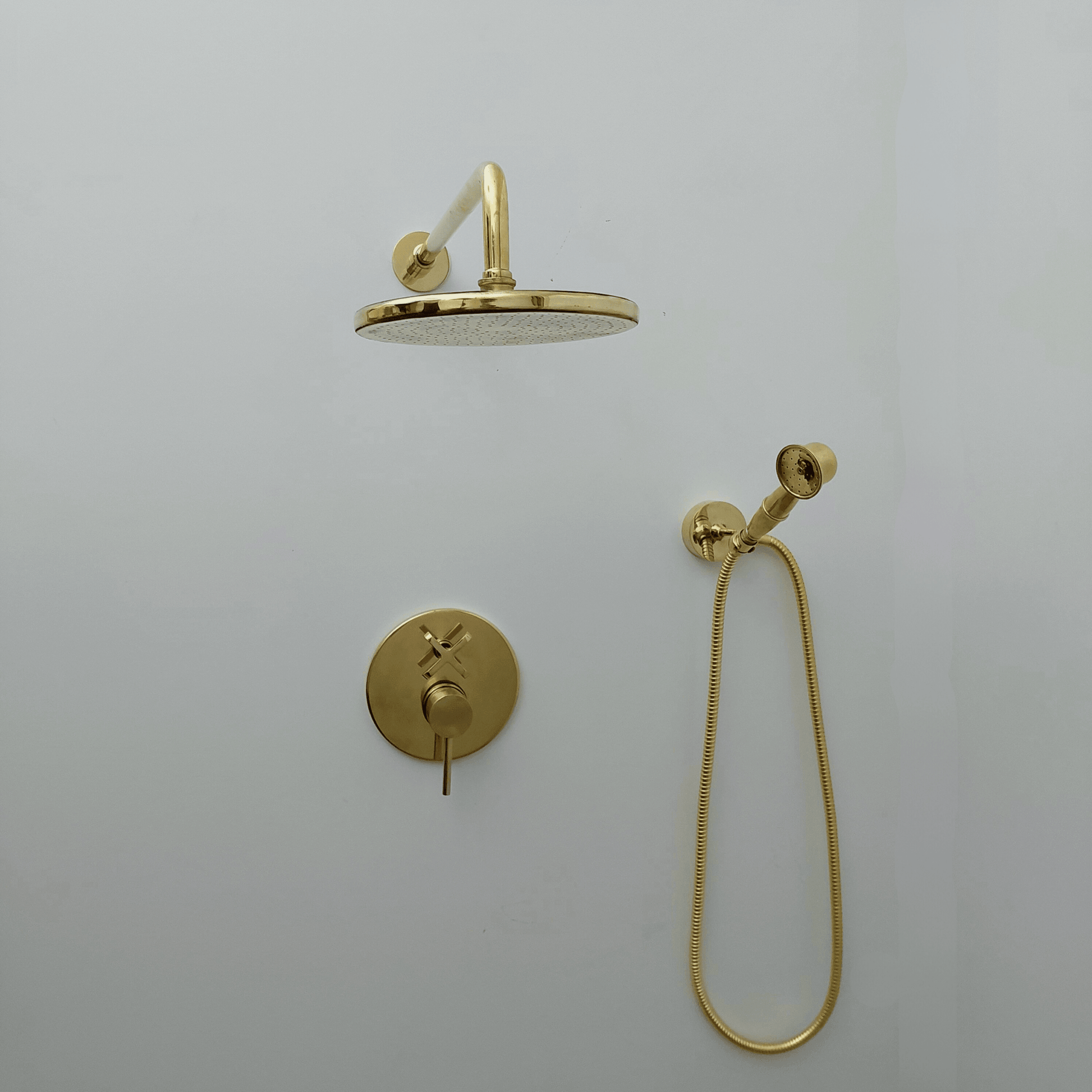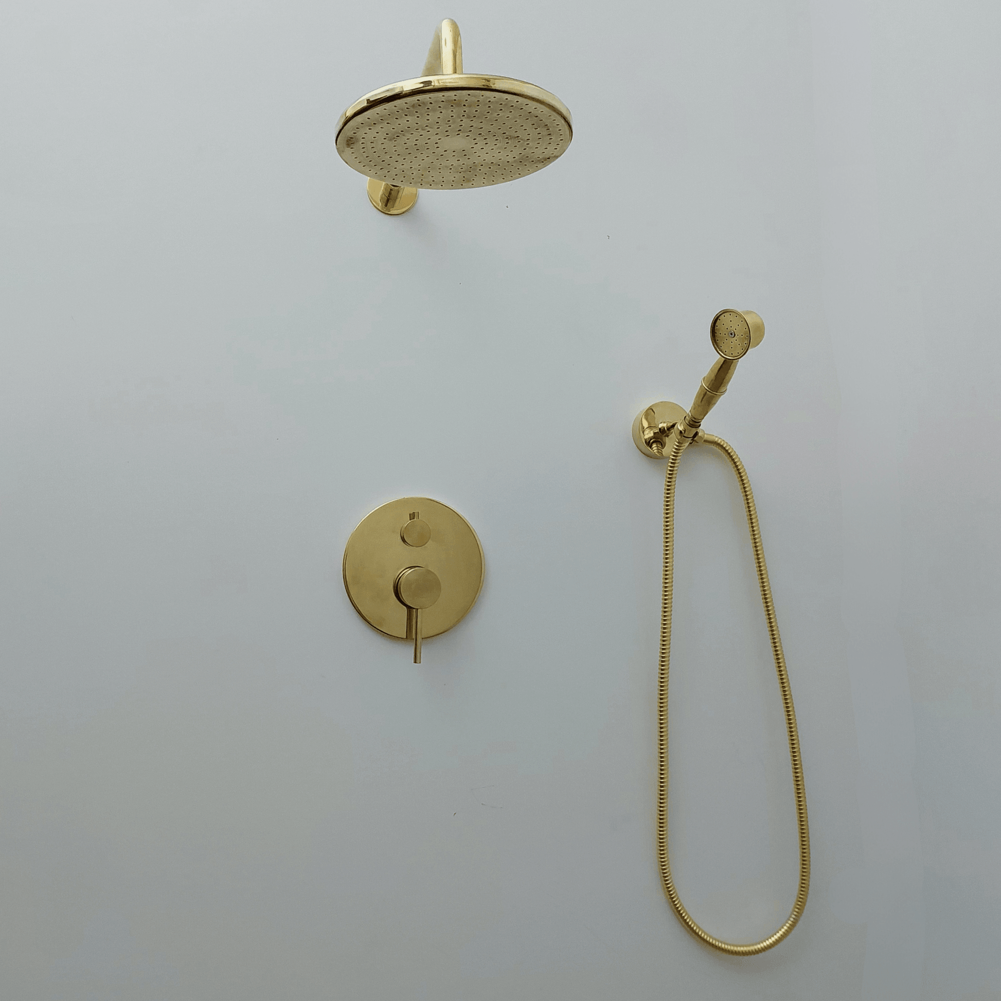 Enhance your bathroom with the elegant and functional Unlacquered Brass Shower System with Handheld Shower Head and Round Rain Shower Head. This premium shower system combines timeless design with modern convenience, offering a luxurious shower experience. The unlacquered brass finish adds a touch of vintage charm, ensuring it will age gracefully and develop a unique patina over time. Perfect for those who appreciate both style and substance, this shower system is an excellent addition to any bathroom decor.