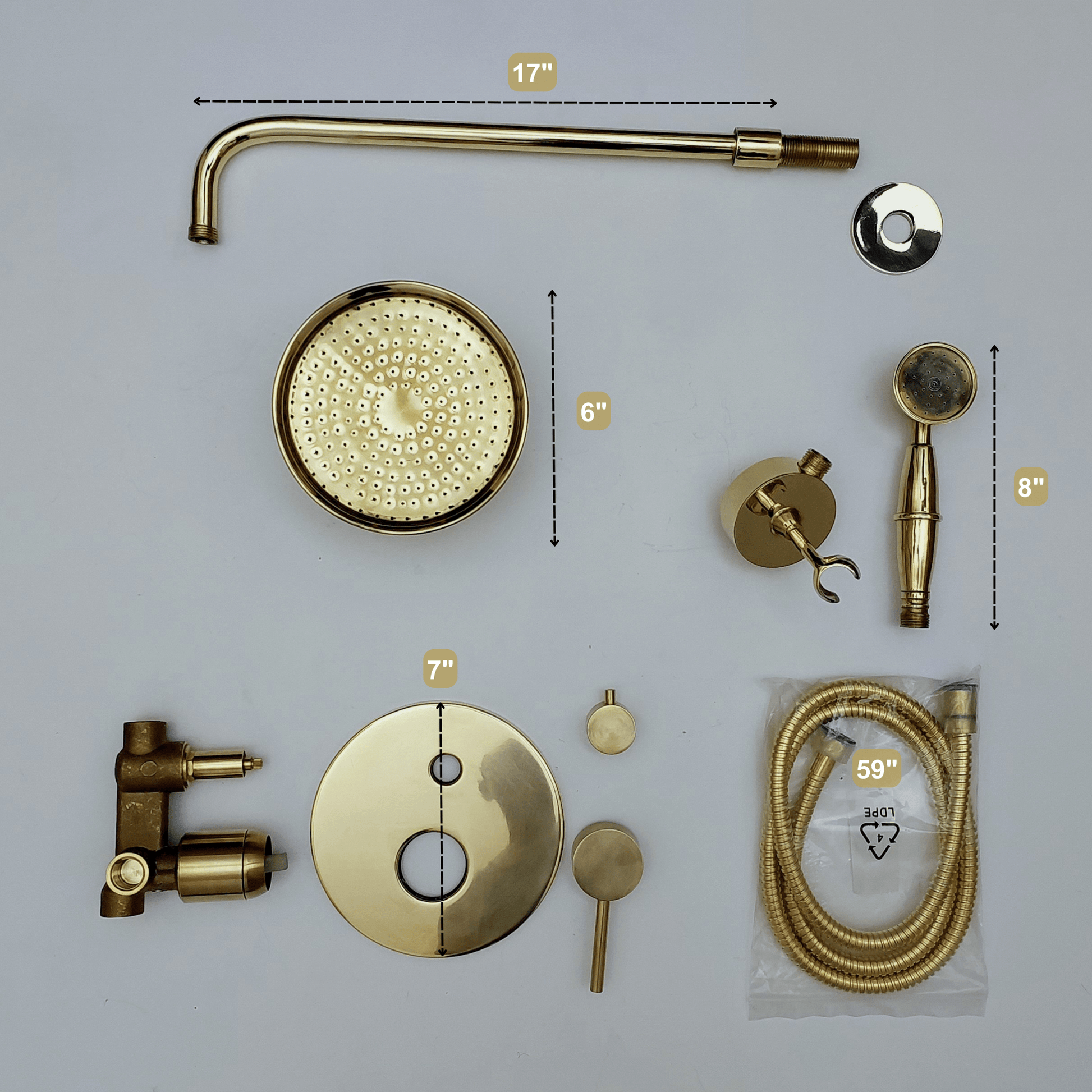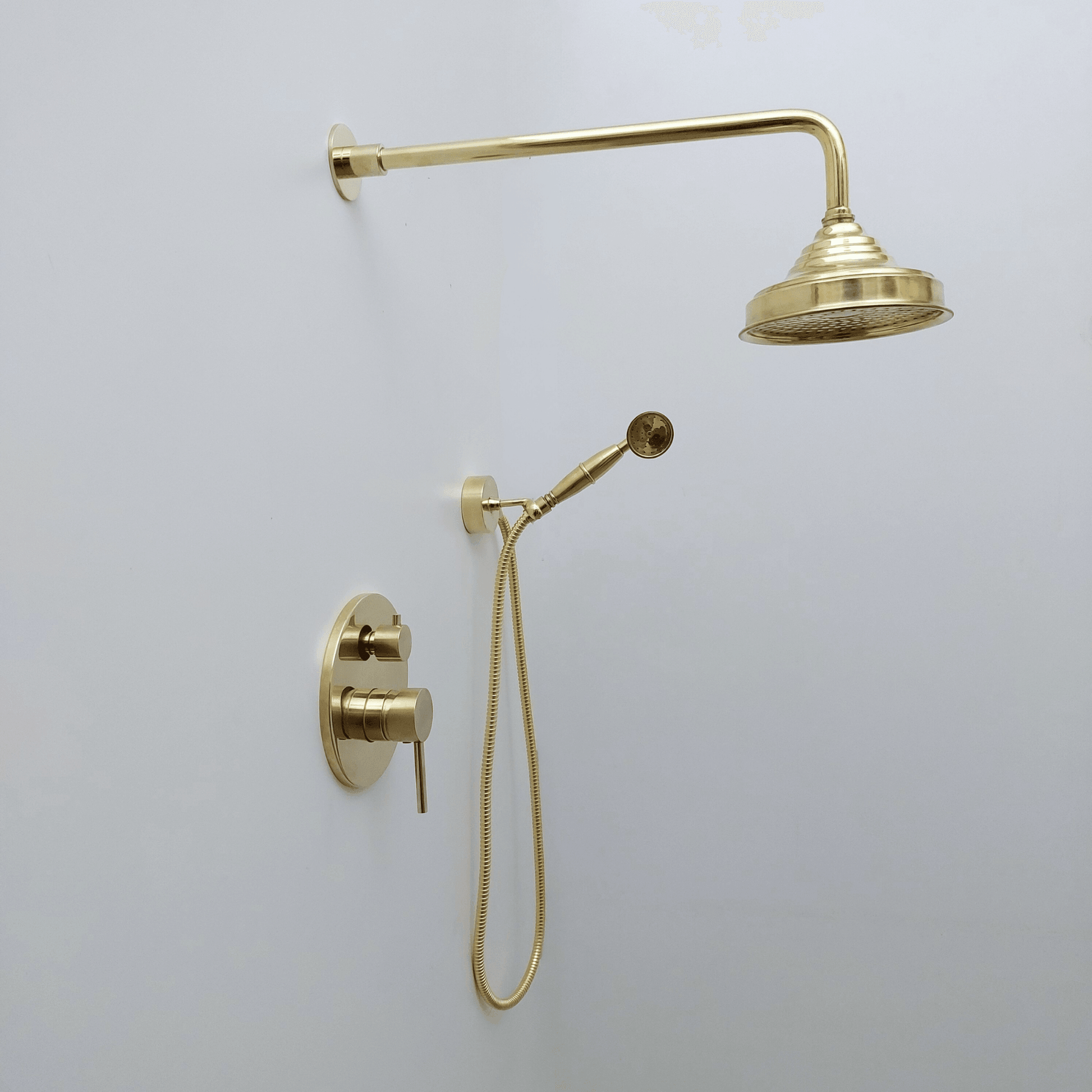 Enhance your bathroom with the elegant and functional Unlacquered Brass Shower System with Handheld Shower Head and Round Rain Shower Head. This premium shower system combines timeless design with modern convenience, offering a luxurious shower experience. The unlacquered brass finish adds a touch of vintage charm, ensuring it will age gracefully and develop a unique patina over time. Perfect for those who appreciate both style and substance, this shower system is an excellent addition to any bathroom decor.