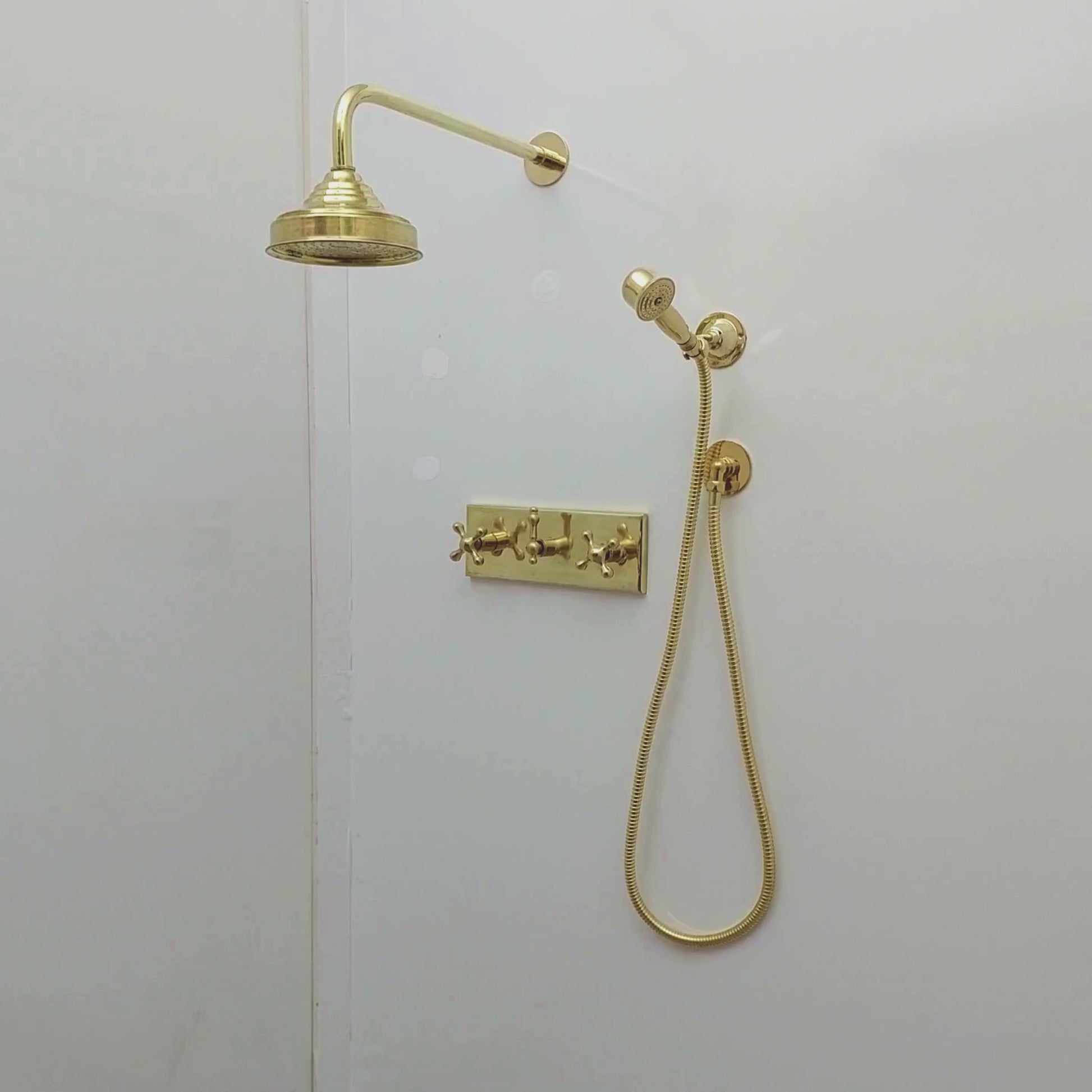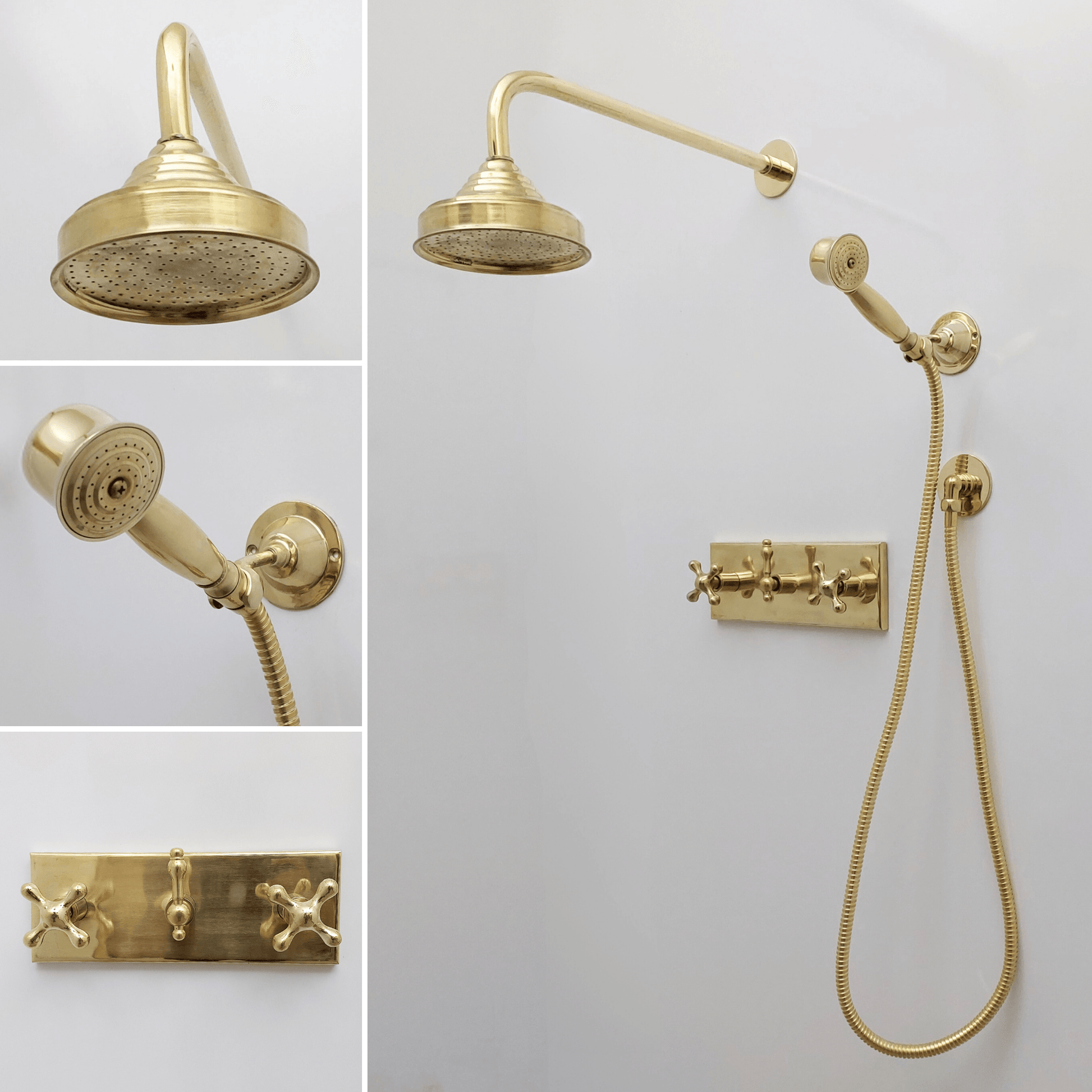 Elevate your bathroom with this Unlacquered Brass Shower System, featuring a classic Round Rain Shower Head, a Central Brass Plaque with Cross Handles for precise control, and a versatile Handheld Shower Head. Crafted from solid unlacquered brass, this system develops a beautiful patina over time, adding warmth and character. The luxurious rain shower head provides full coverage, while the handheld head offers targeted rinsing and easy cleaning, combining functionality with timeless elegance for both modern and traditional bathrooms.