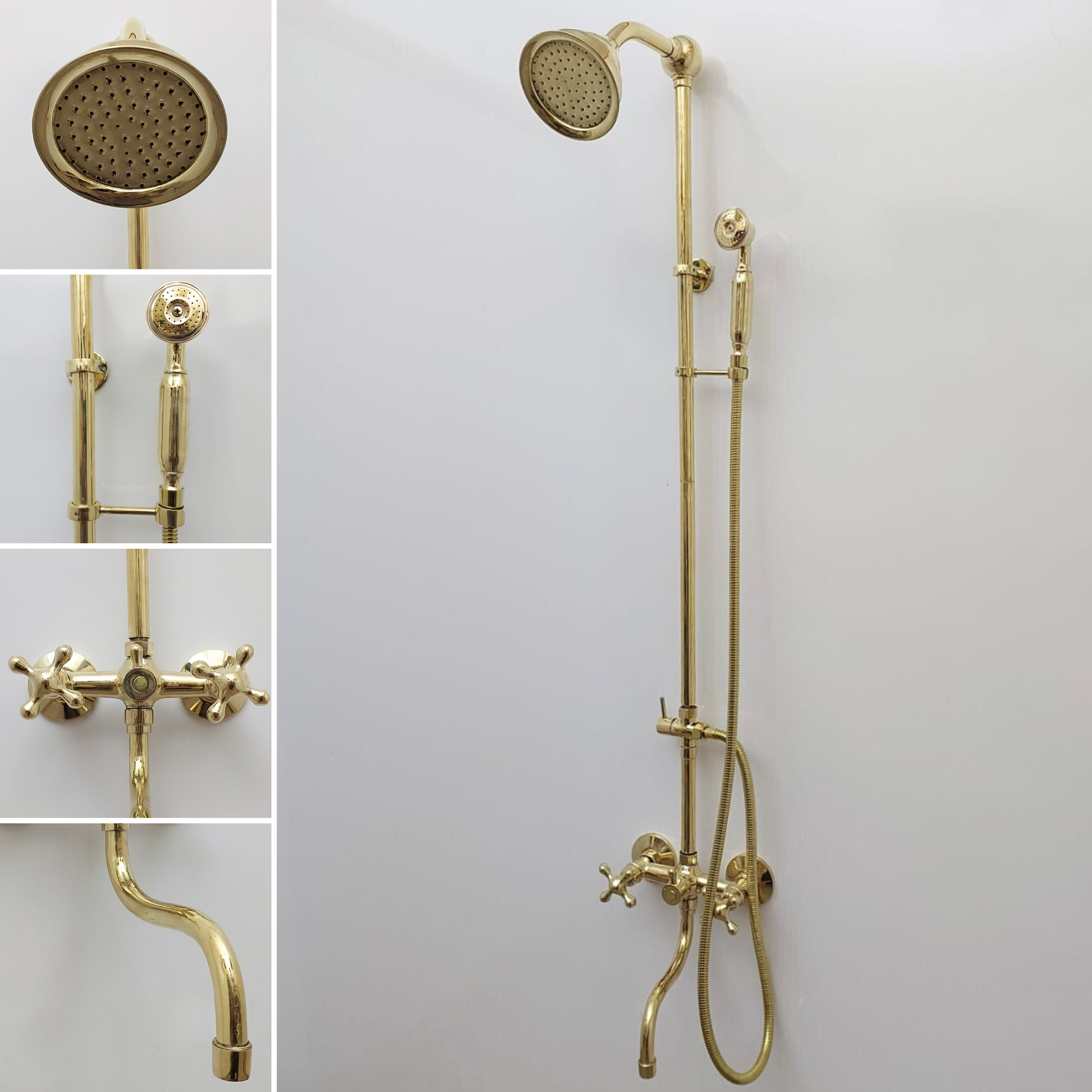 Bring elegance and timeless style to your bathroom with this Unlacquered Brass Shower System. Featuring a sleek Round Shower Head for a luxurious rain-like experience, a convenient Tub Filler for versatile use, classic Cross Handles for easy water control, a Handheld Shower Head with a water control shut-off valve, and a small Lever Handle Diverter to seamlessly switch water flow between the shower head and tub filler, this shower system is the perfect blend of functionality and sophistication. Crafted from premium brass with an unlacquered finish, this shower system develops a natural patina over time, enhancing its vintage appeal.