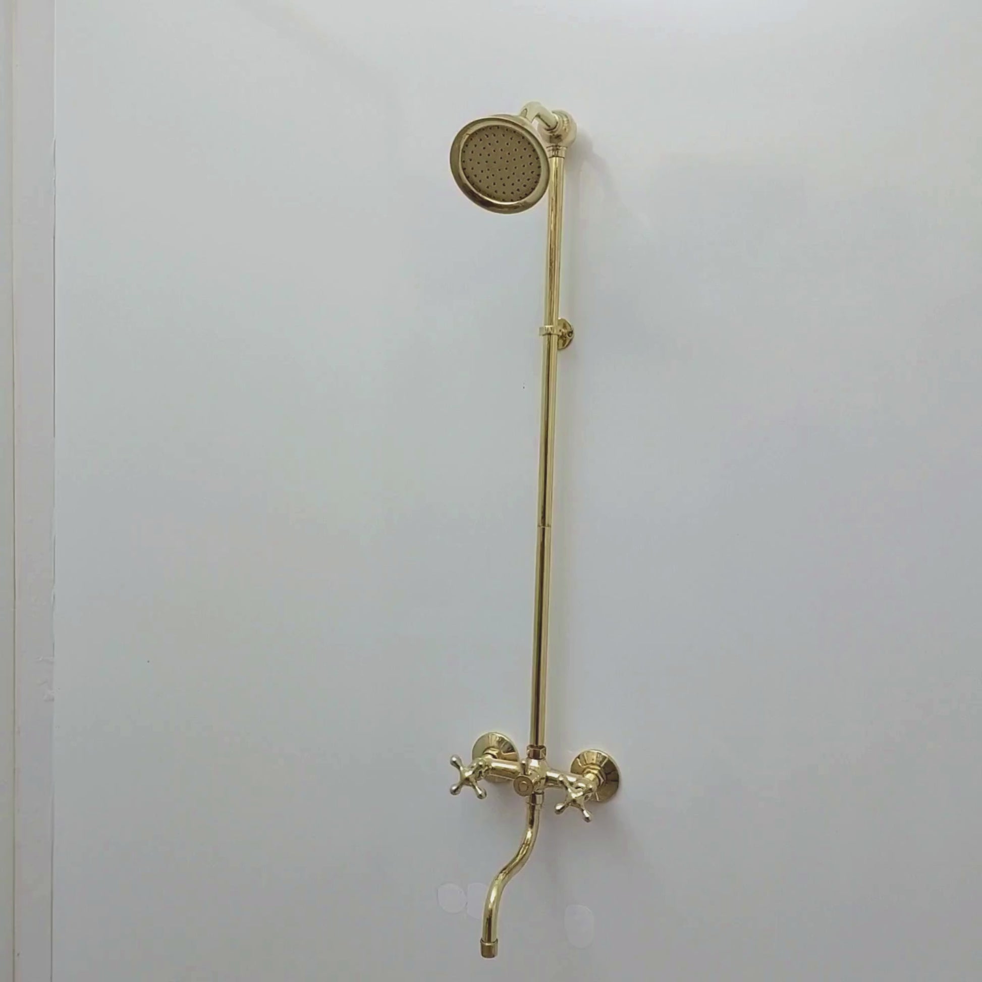 Bring elegance and timeless style to your bathroom with this Unlacquered Brass Shower System. Featuring a sleek Round Shower Head for a luxurious rain-like experience, a convenient Tub Filler for versatile use, classic Cross Handles for easy water control, and a small Lever Handle Diverter to seamlessly switch water flow between the shower head and tub filler, this shower system is the perfect blend of functionality and sophistication. Crafted from premium brass with an unlacquered finish, this shower system develops a natural patina over time, enhancing its vintage appeal.