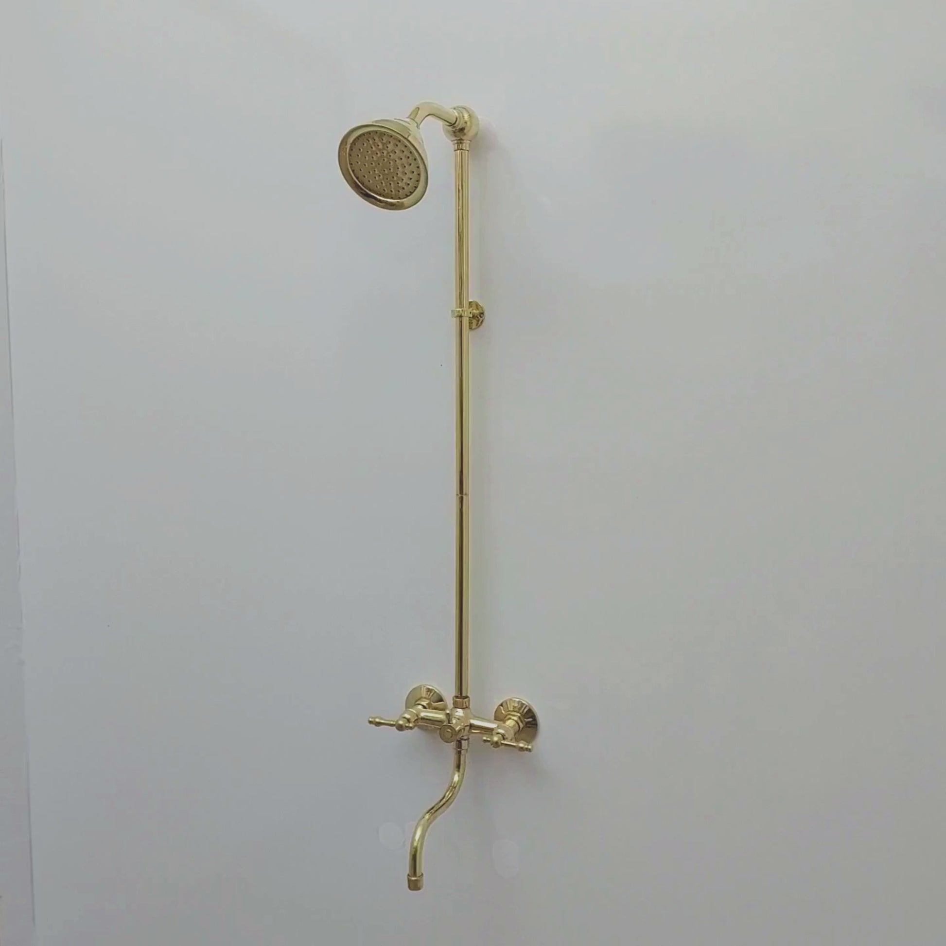 Bring elegance and timeless style to your bathroom with this Unlacquered Brass Shower System. Featuring a sleek Round Shower Head for a luxurious rain-like experience, a convenient Tub Filler for versatile use, classic Lever Handles for easy water control, and a small Lever Handle Diverter to seamlessly switch water flow between the shower head and tub filler, this shower system is the perfect blend of functionality and sophistication. Crafted from premium brass with an unlacquered finish, this shower system develops a natural patina over time, enhancing its vintage appeal.