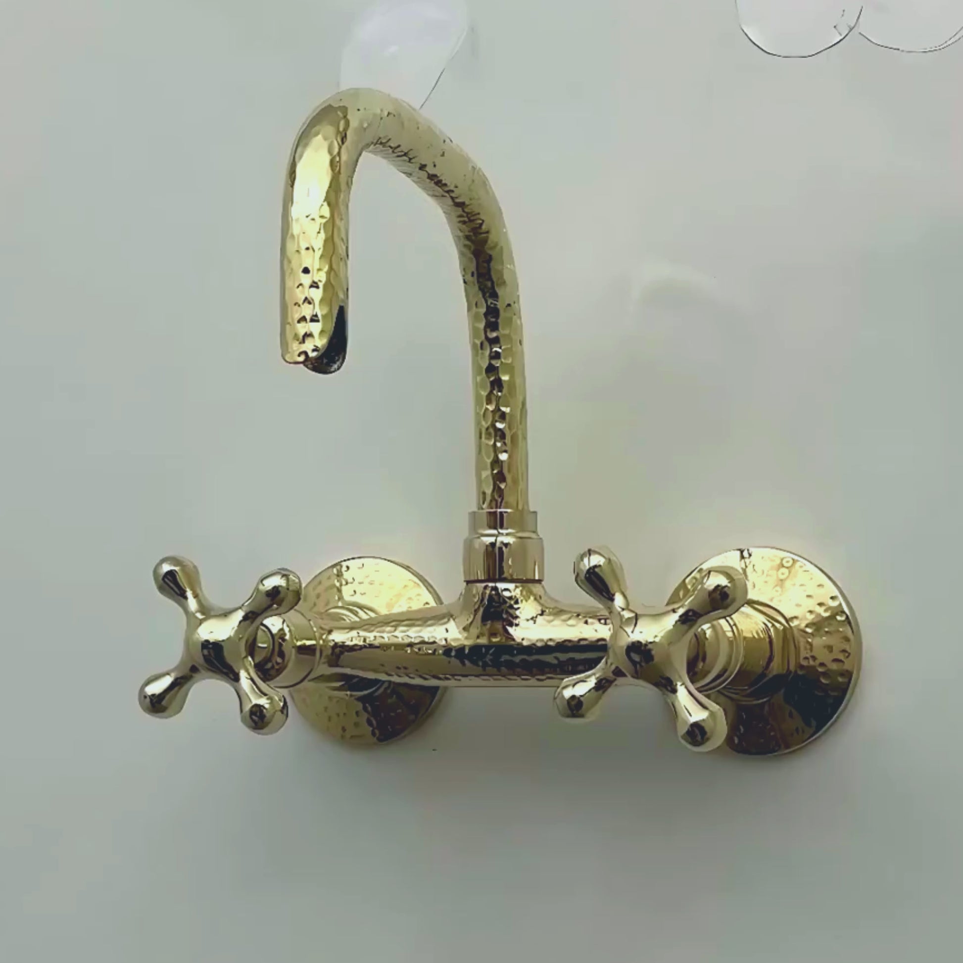 The Unlacquered Brass Wall Mount Faucet, Hammered Brass Bridge Faucet with Cross Handles is a stunning addition to any kitchen. Crafted from solid brass, this wall-mounted faucet features a hammered texture that adds an artisanal touch and enhances its durability. The unlacquered brass finish ensures a unique patina develops over time, giving the faucet a vintage, living finish that grows more beautiful with age. The cross handles provide precise and effortless control over water flow and temperature, perfectly blending style and functionality.