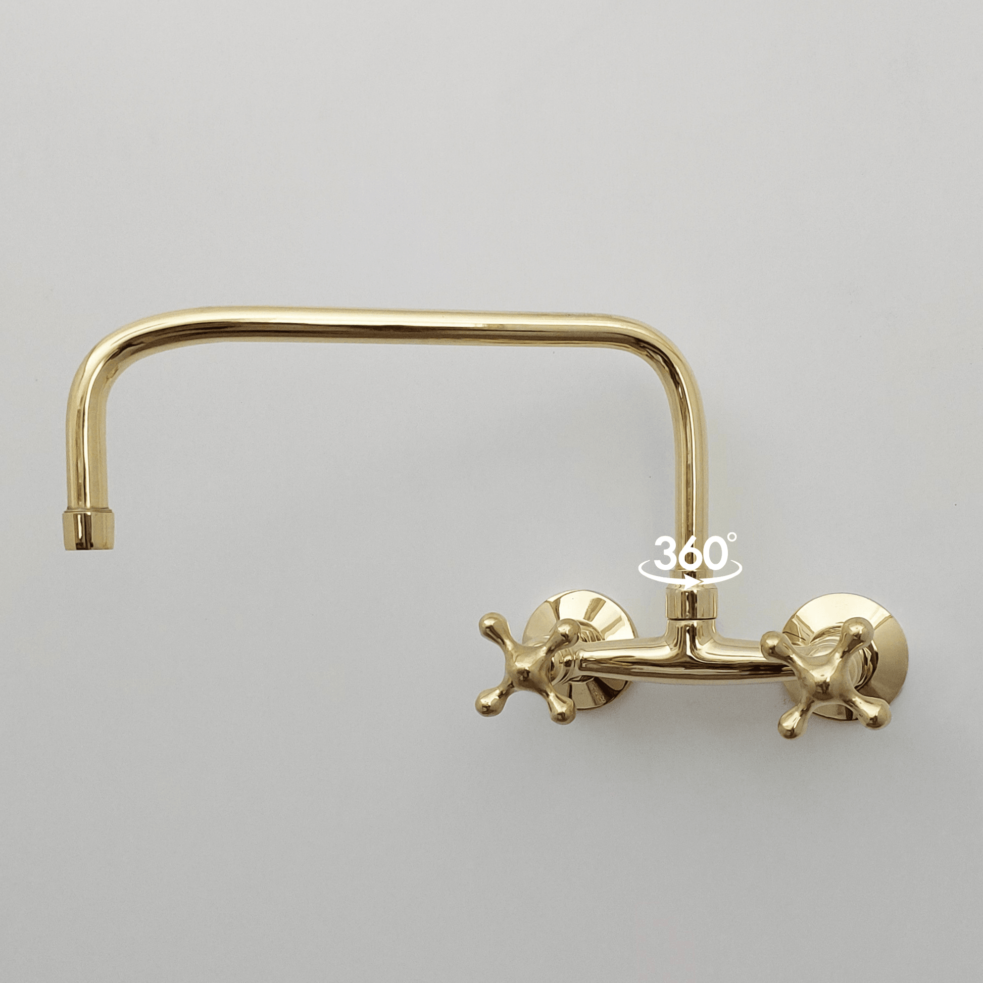 Enhance your kitchen or bathroom with this elegant Unlacquered Brass Wall Mount Faucet, featuring a timeless Solid Brass Bridge Design with classic Cross Handles. Crafted from durable, corrosion-resistant brass, this faucet's unlacquered finish will develop a unique patina over time, adding vintage charm. The wall-mounted design saves space, while the high-clearance spout offers ease of use, perfect for both modern and rustic spaces. Ideal for kitchens, bathrooms, or laundry rooms, this faucet combines style, functionality, and easy installation.