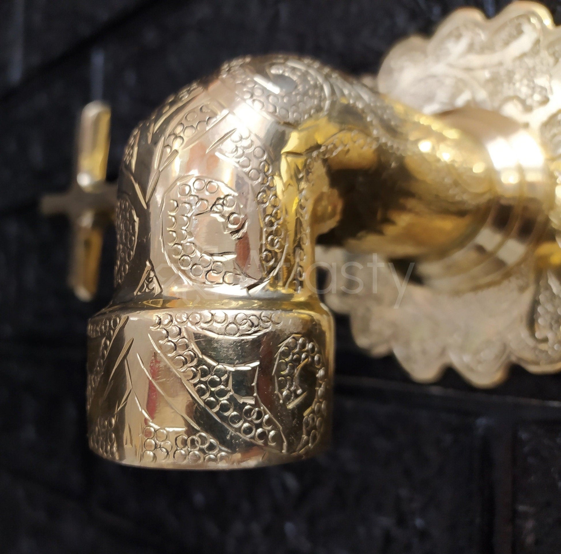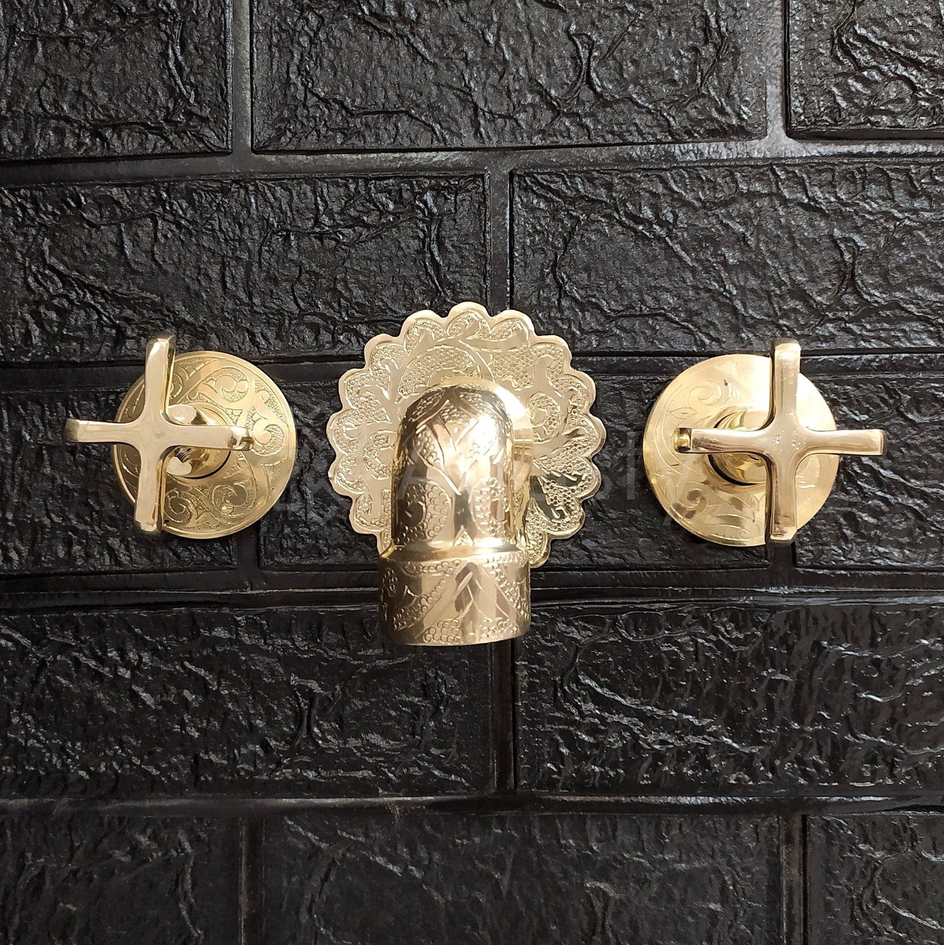 Unlacquered Brass Wall Mounted Bathroom Vessel Sink Faucet With Cross Handles, Engraved Antique Brass Faucet