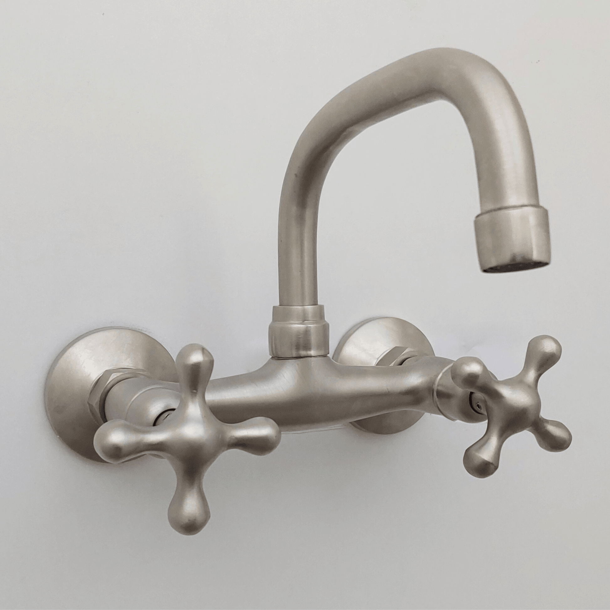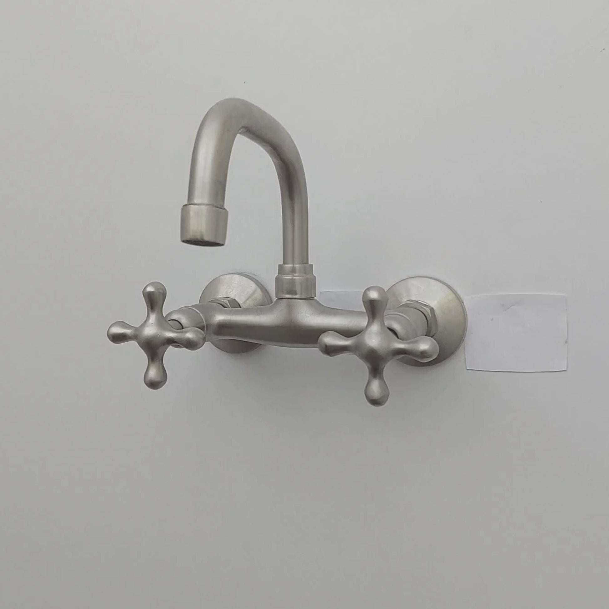 Upgrade your bathroom or kitchen with this stylish wall mount brass faucet in a sleek brushed nickel finish. Designed with a timeless gooseneck spout, this faucet adds elegance and functionality to your space. Its solid brass construction ensures durability and a long lifespan, while the nickel finish provides a modern touch that complements various interior styles. The faucet features classic cross handles for easy control of water flow and temperature. Perfect for those seeking a blend of traditional design and contemporary sophistication, this wall-mounted faucet is ideal for both modern and vintage-inspired interiors.
